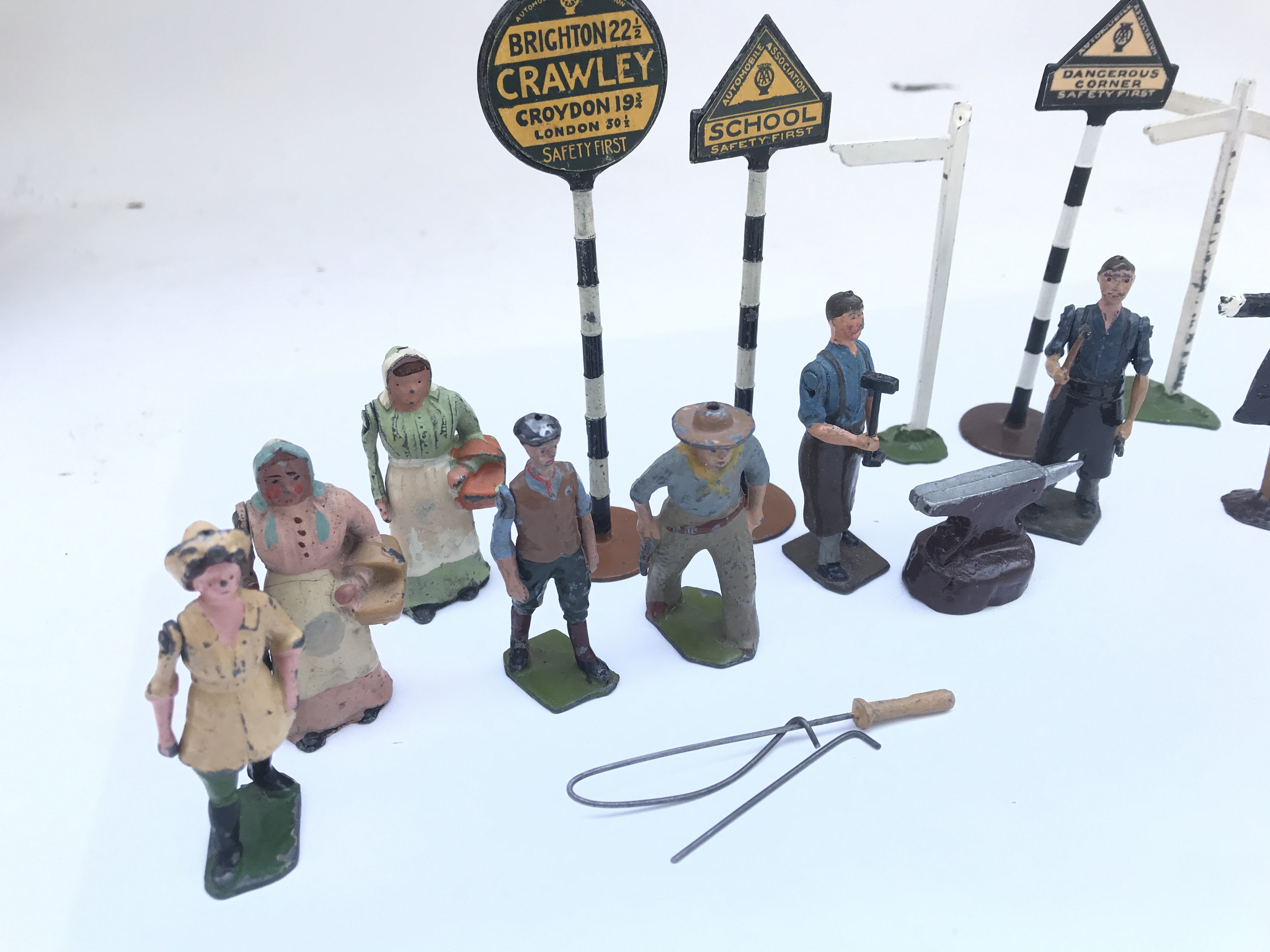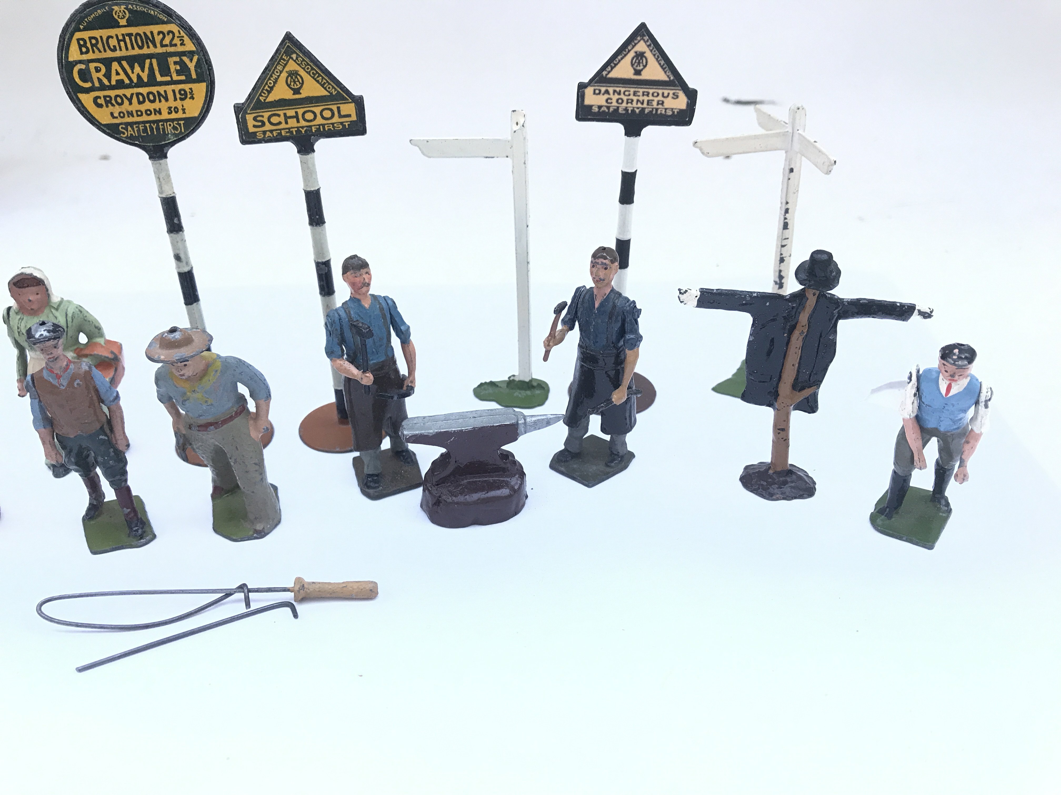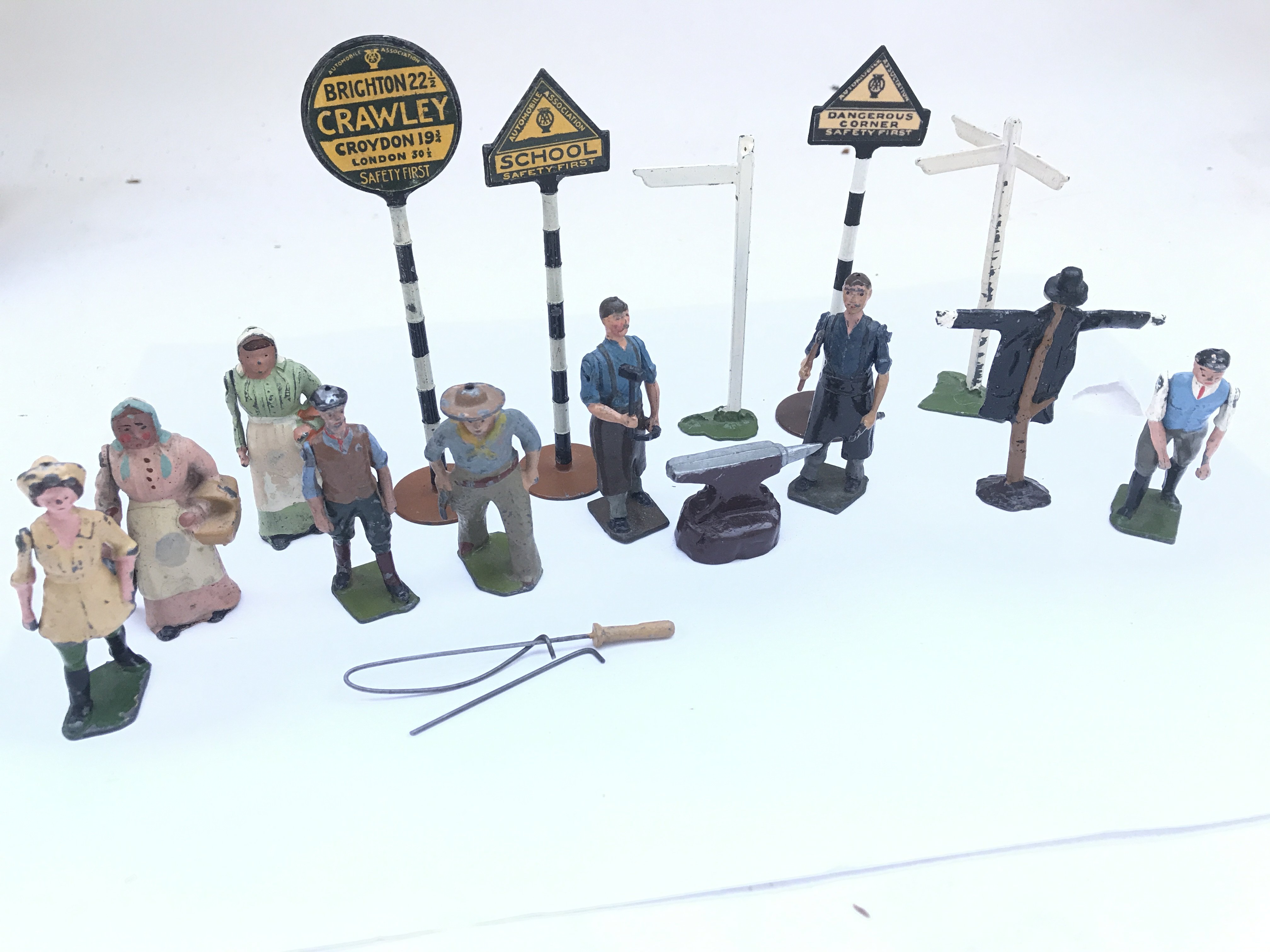 A Collection of Vintage Britains Figures. Including Black Smiths. A Scarecrow. A Cowboy. Road Signs. Etc.