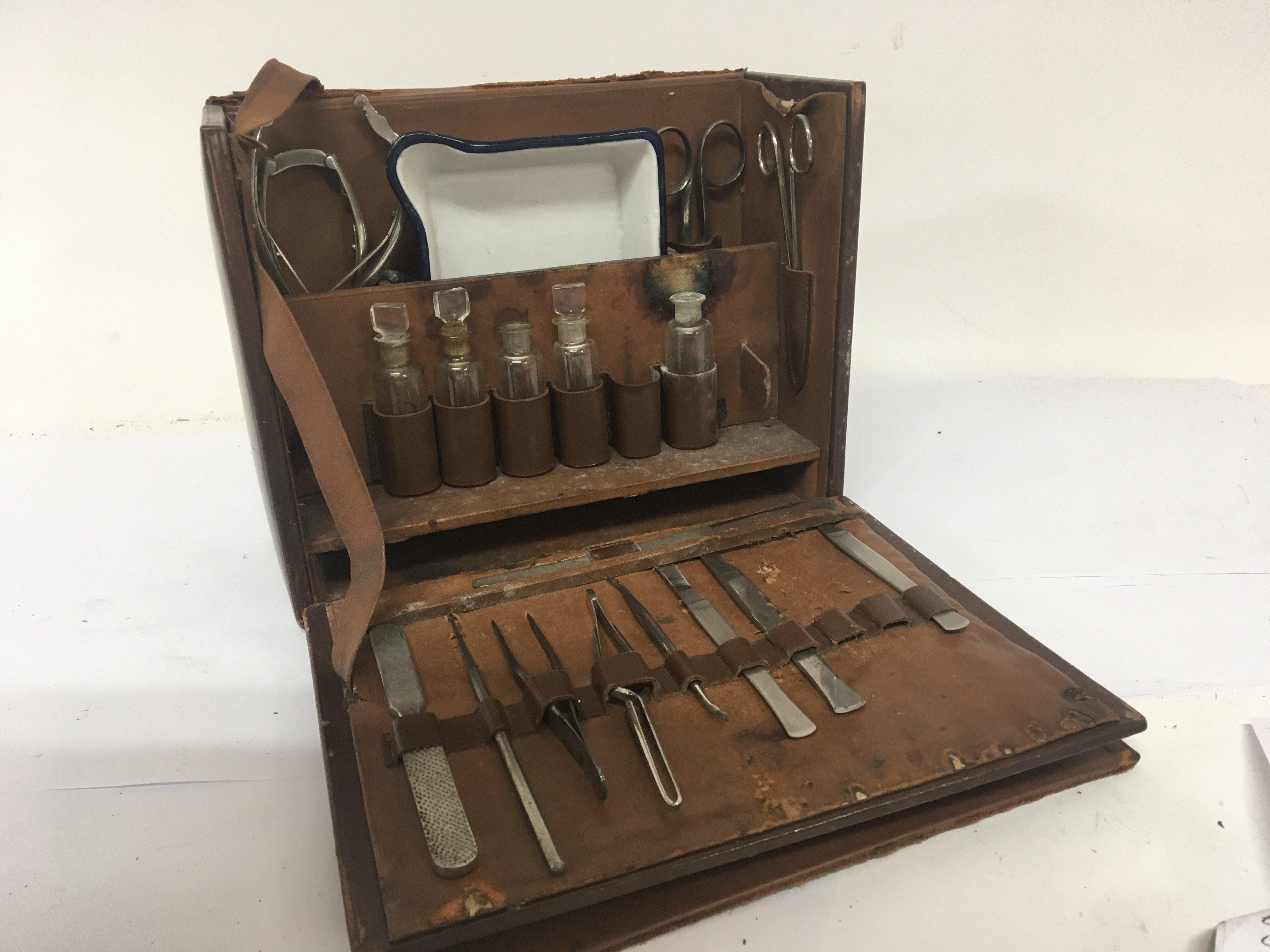 A Vintage leather surgeon case fitted with medical instruments and a Vintage typewriter and a typewriter.