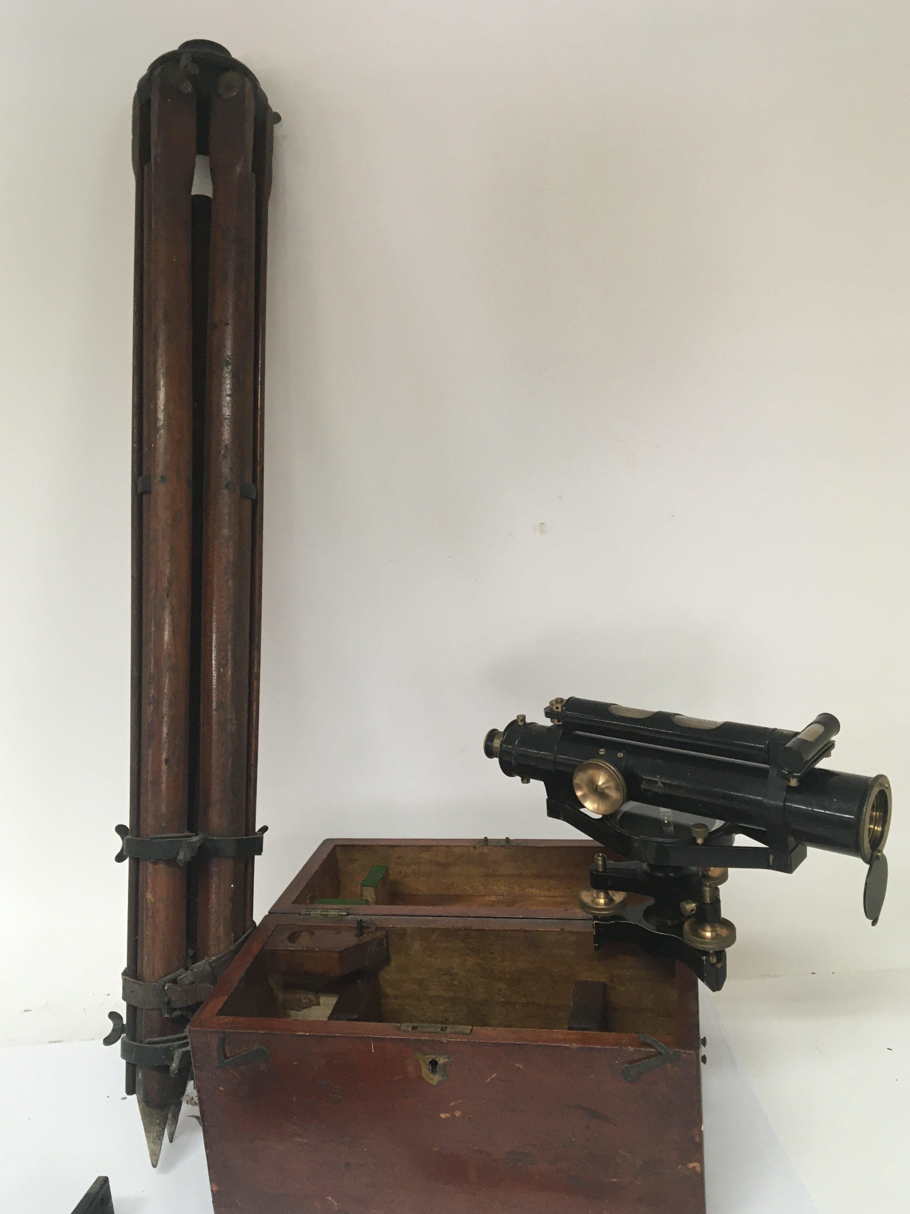 A boxed Theodolite with stand and fitted box maker B J Hall and Co London and two other vintage precision instruments.