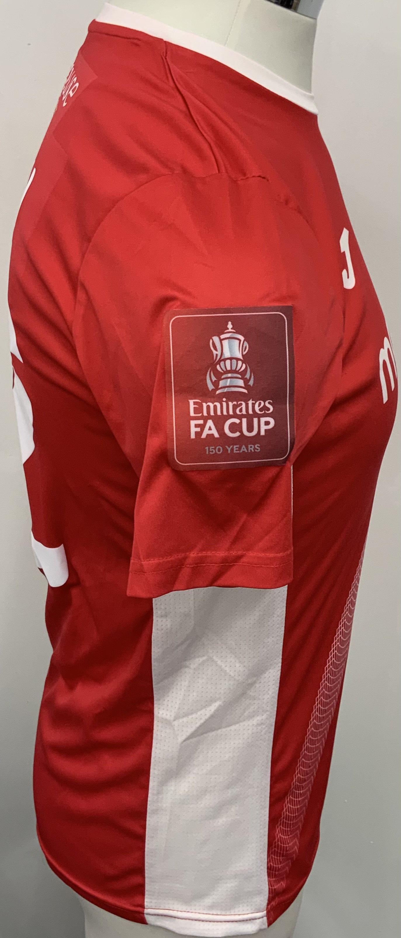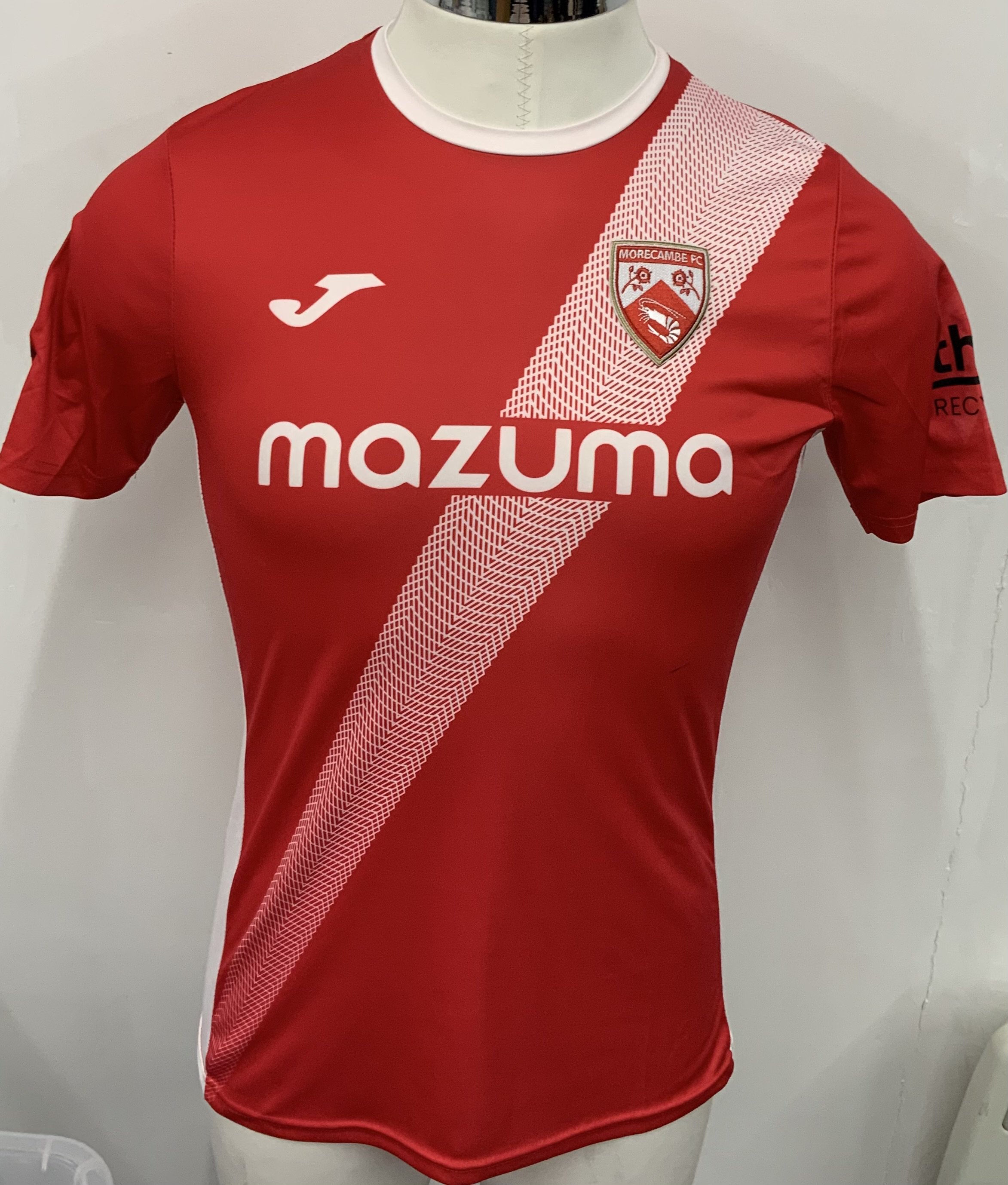 Morecambe 2021 - 2022 Match Worn Football Shirt: Red short sleeve shirt. Number 22 Gibson to rear. FA Cup sleeve badging. Worn v Spurs on 9 January 2022.