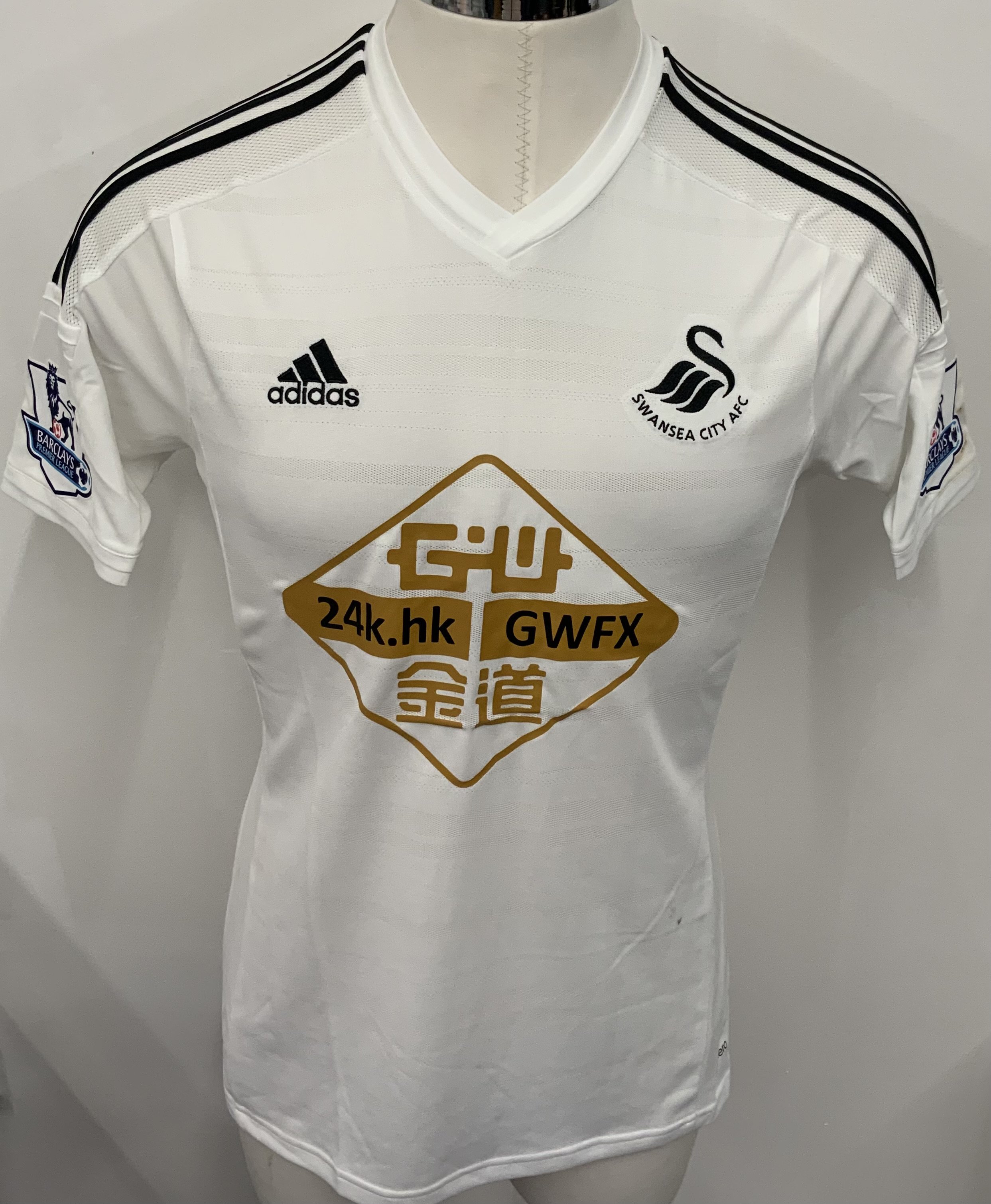 Swansea City 2014 - 2015 Match Worn Football Shirt: White short sleeve shirt. Number 27 Bartley. Premier League badging.