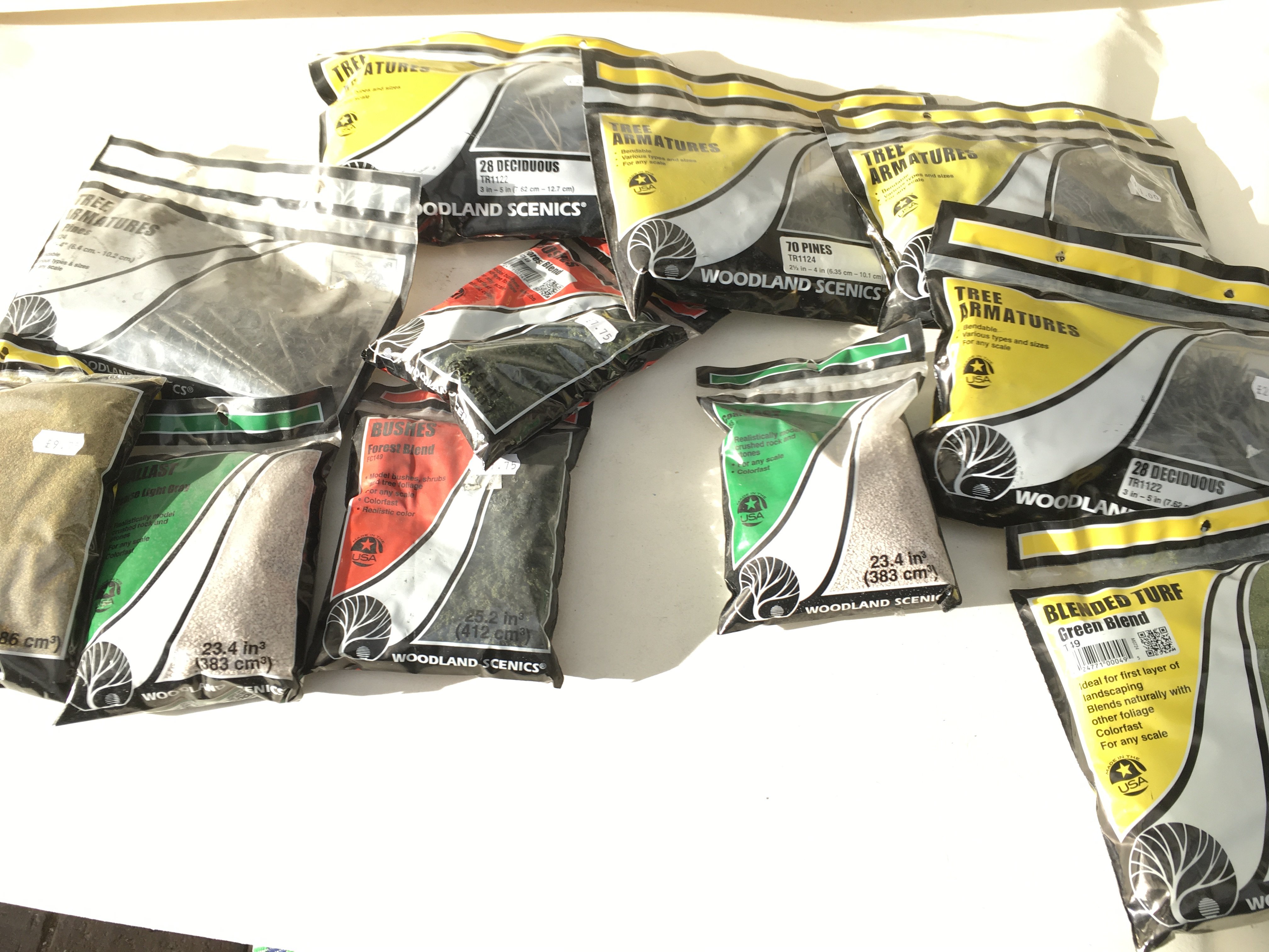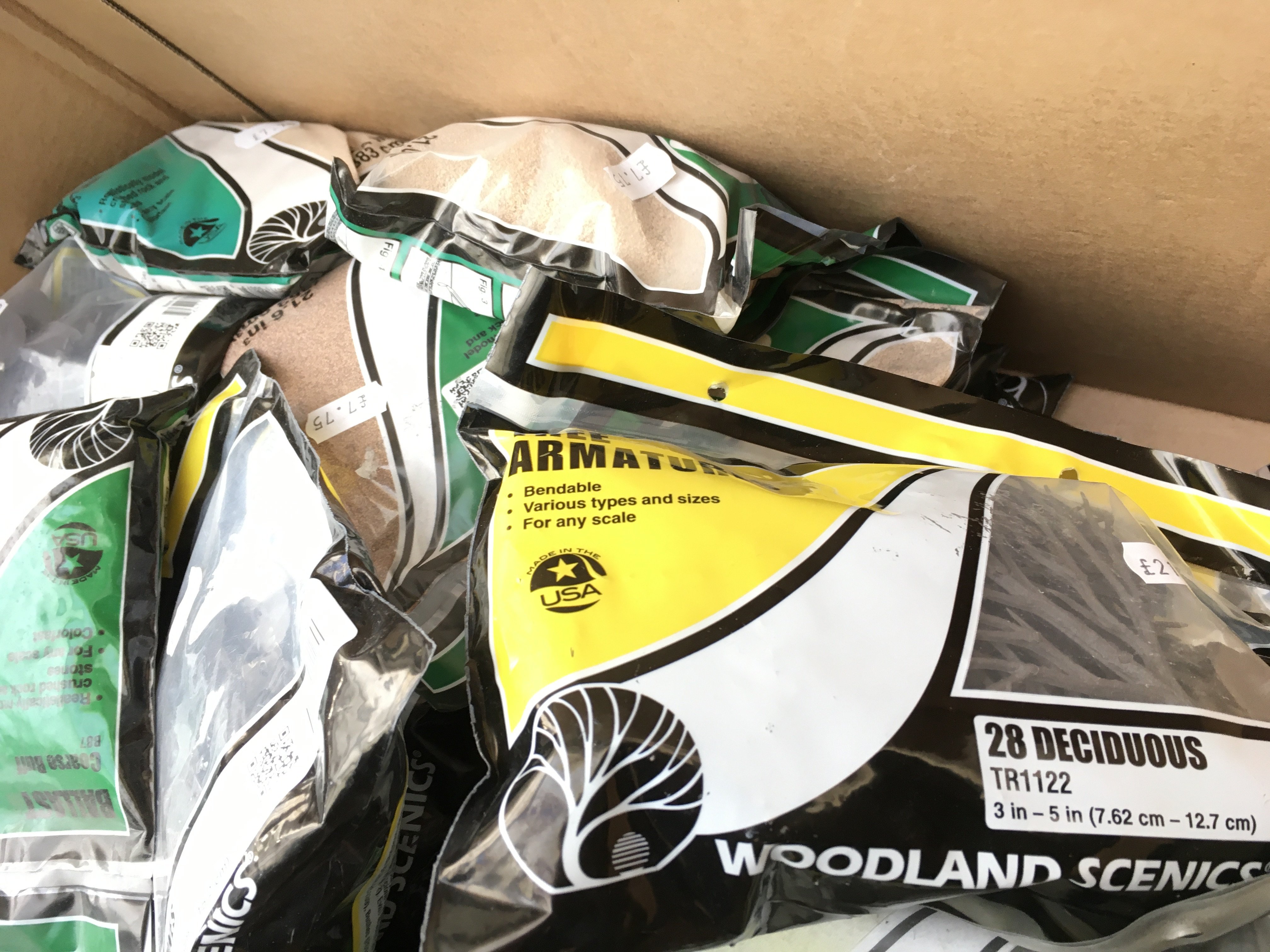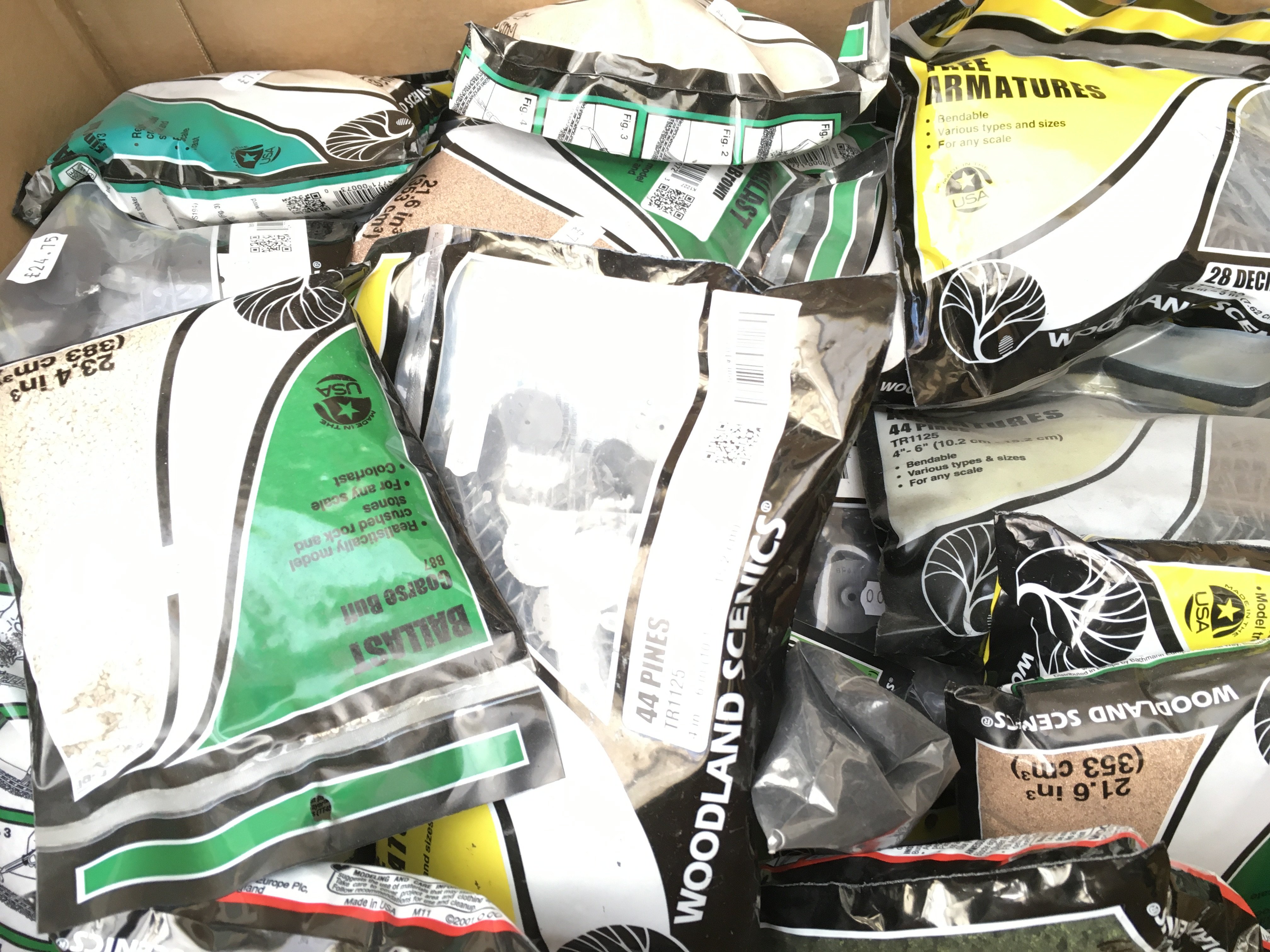 A large collection of new packaged model railway materials for creating layout scenes. Manufactured by Woodland Scenics. No reserve