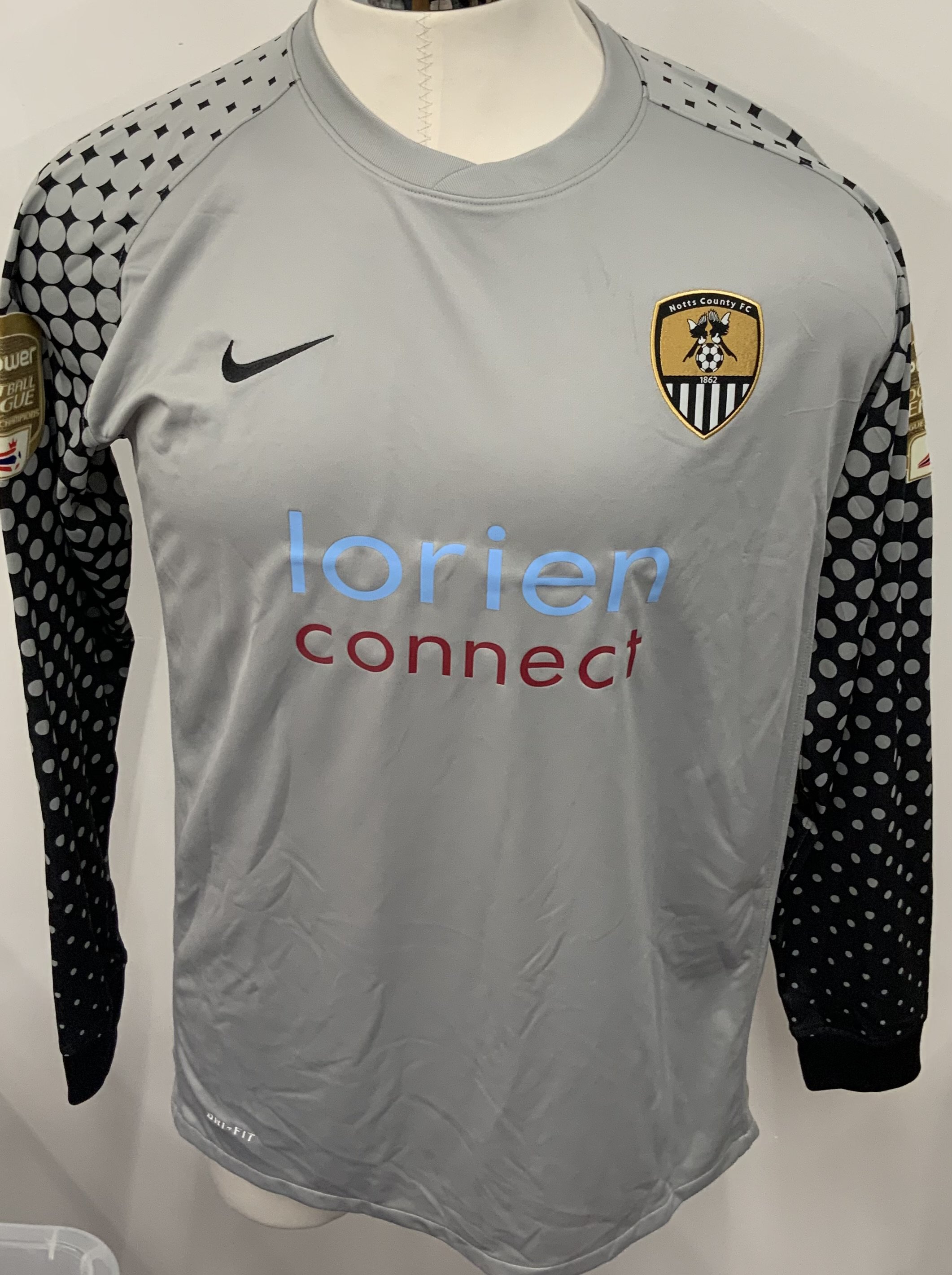 Notts County Match Worn Football Shirt: Grey long sleeve goalkeeper shirt. Number 1 Burch with Football League Two Champions badging.