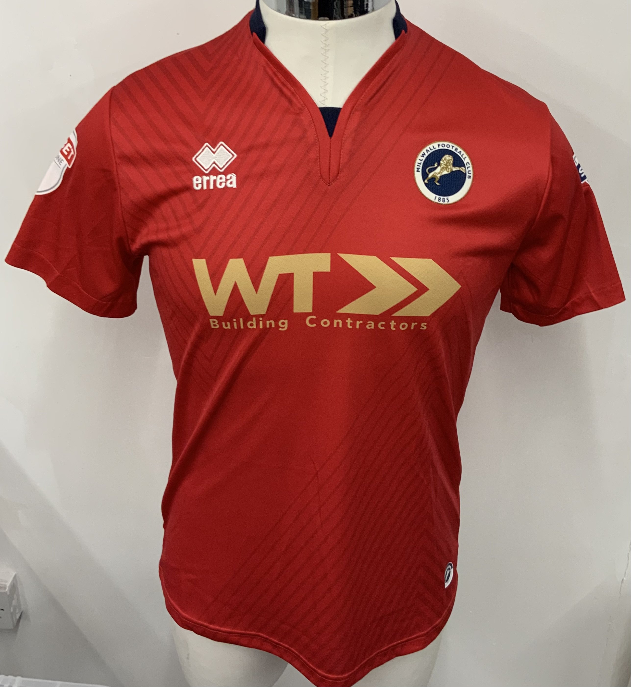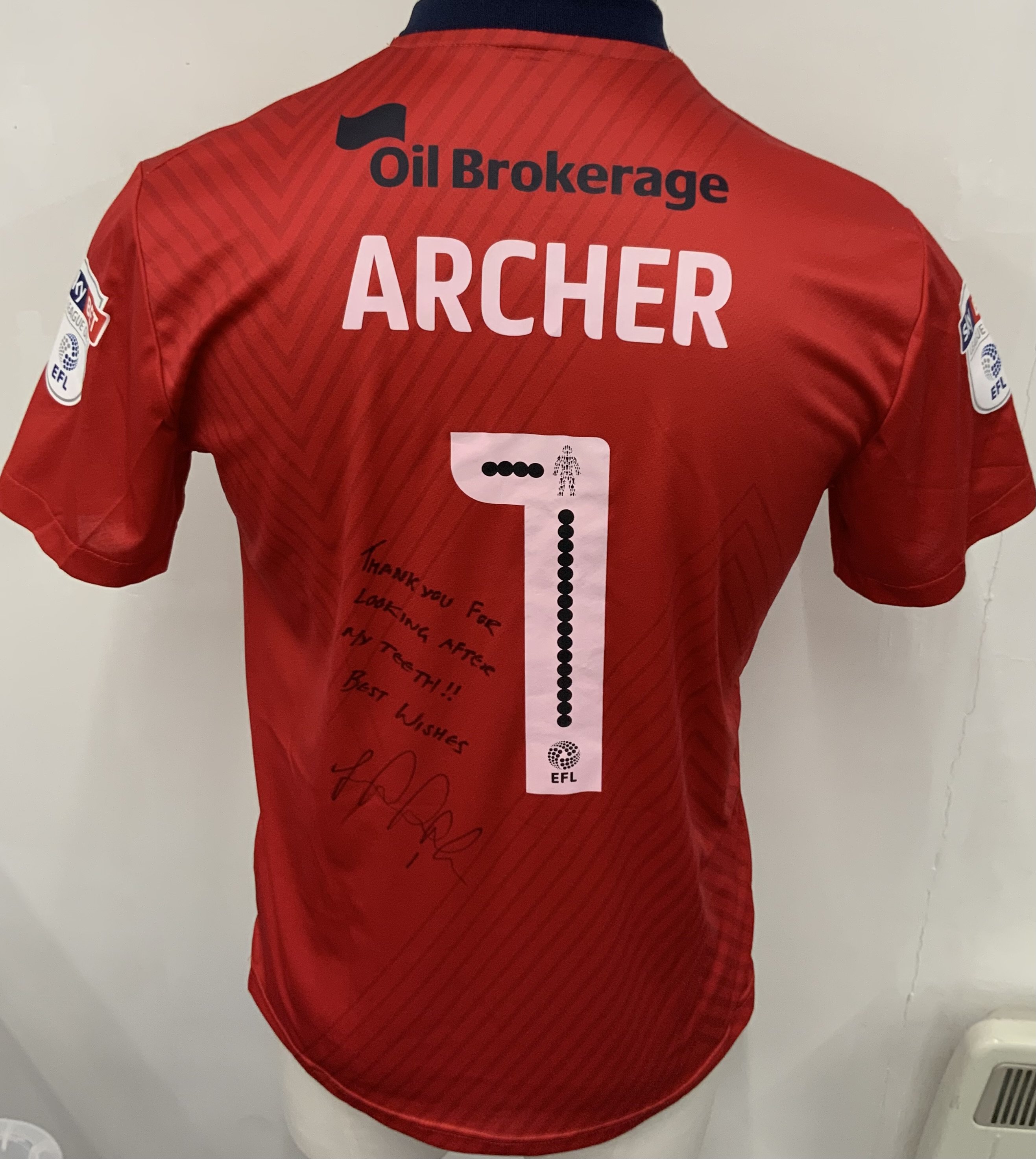 Millwall 2016 - 2017 Match Worn Football Shirt: Red short sleeve goalkeepers shirt. Number 1 Archer to rear. League One Sky Bet badging. Signed with dedication.