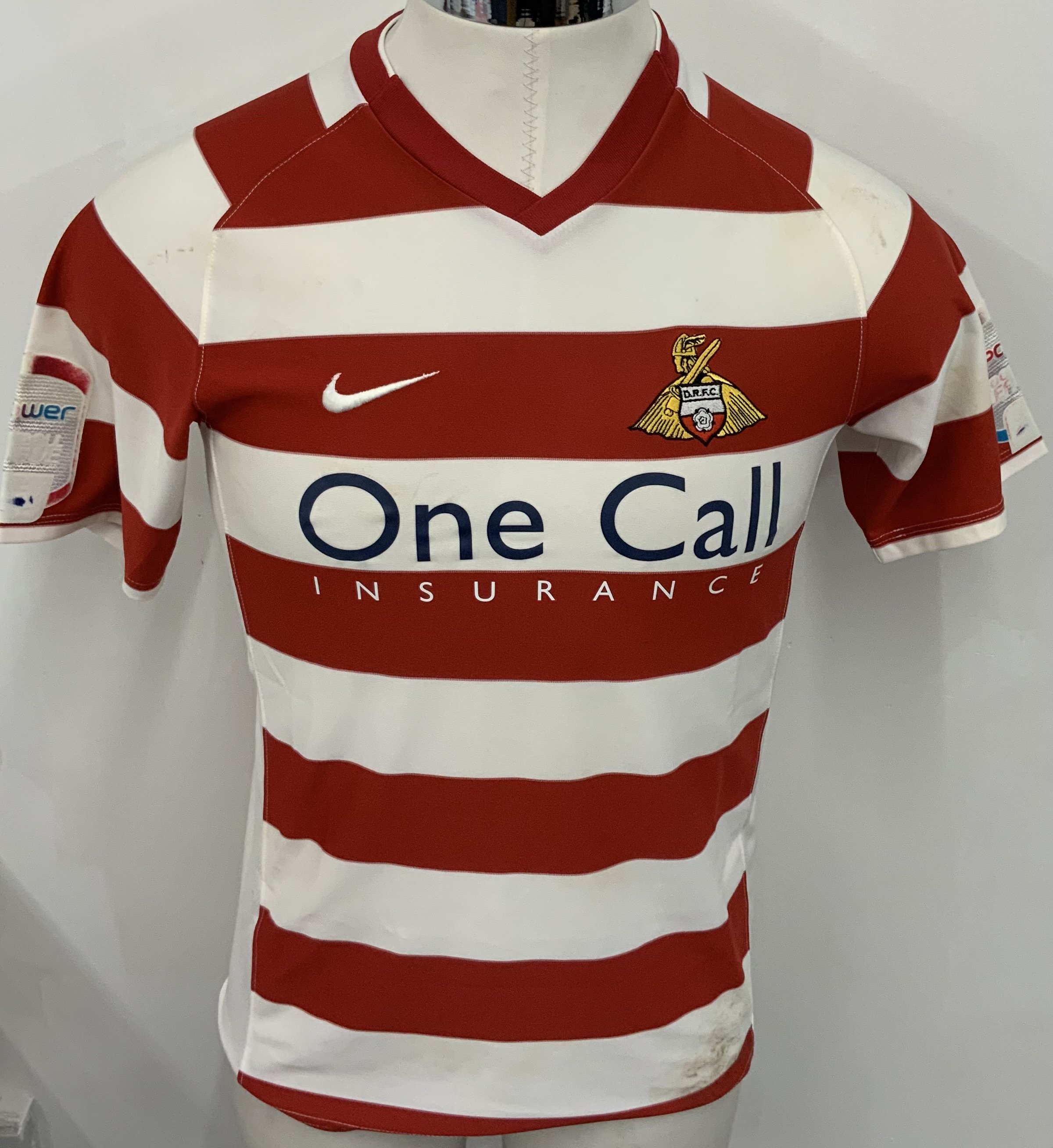 Doncaster Rovers 2010 - 2011 Match Worn Football Shirt: Red and white short sleeve shirt. Number 16 Oster. NPower League badging. Wear to badging and unwashed shirt.