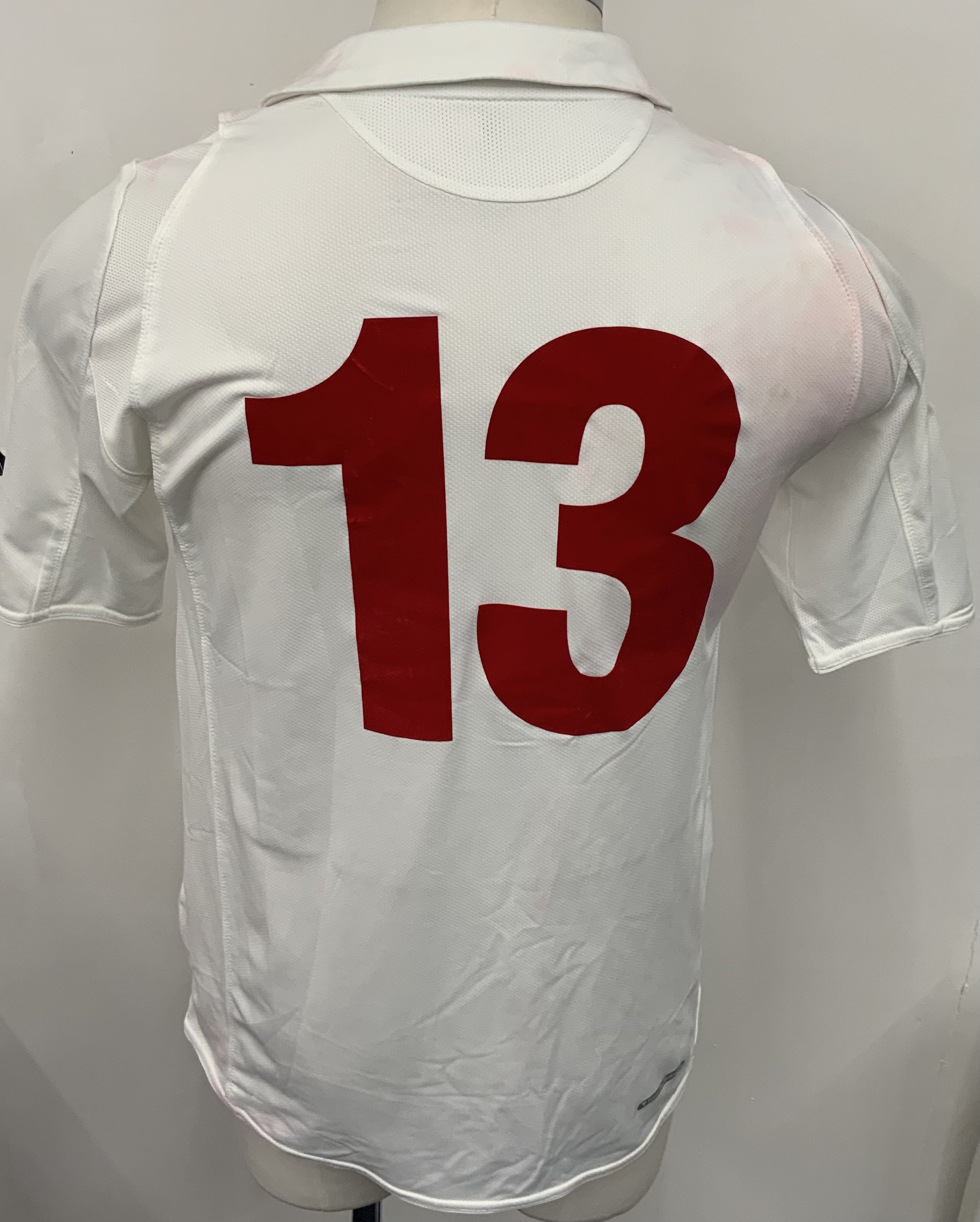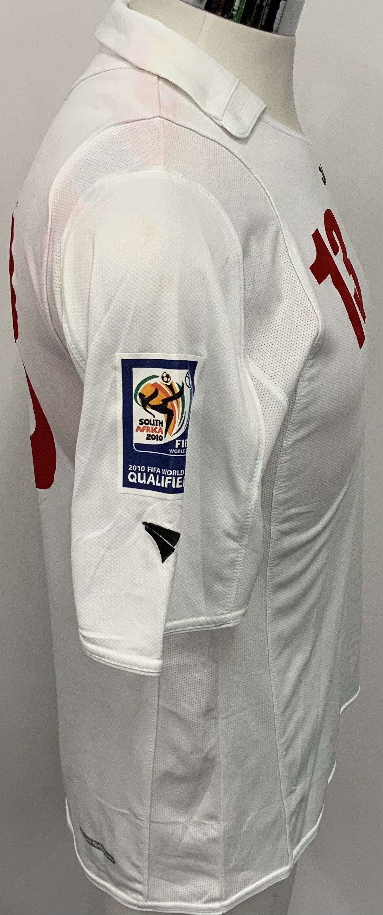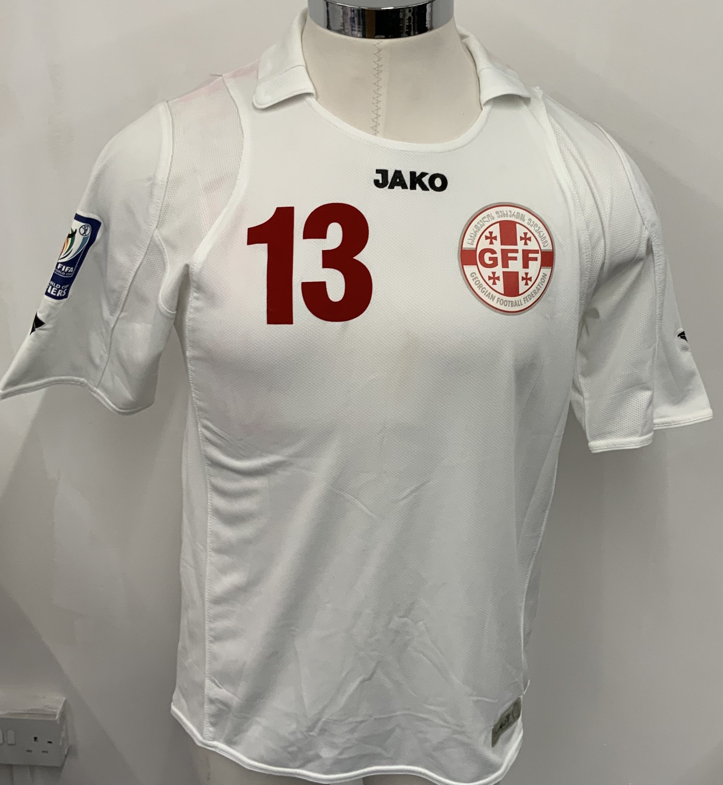 Georgia 2010 Match Worn Football Shirt: White short sleeve shirt. Number 13. Worn by Khizanishvili v Cyprus in World Cup qualifier on 28 March 2009. World Cup badge to sleeve. Some staining from red numbers when washed.
