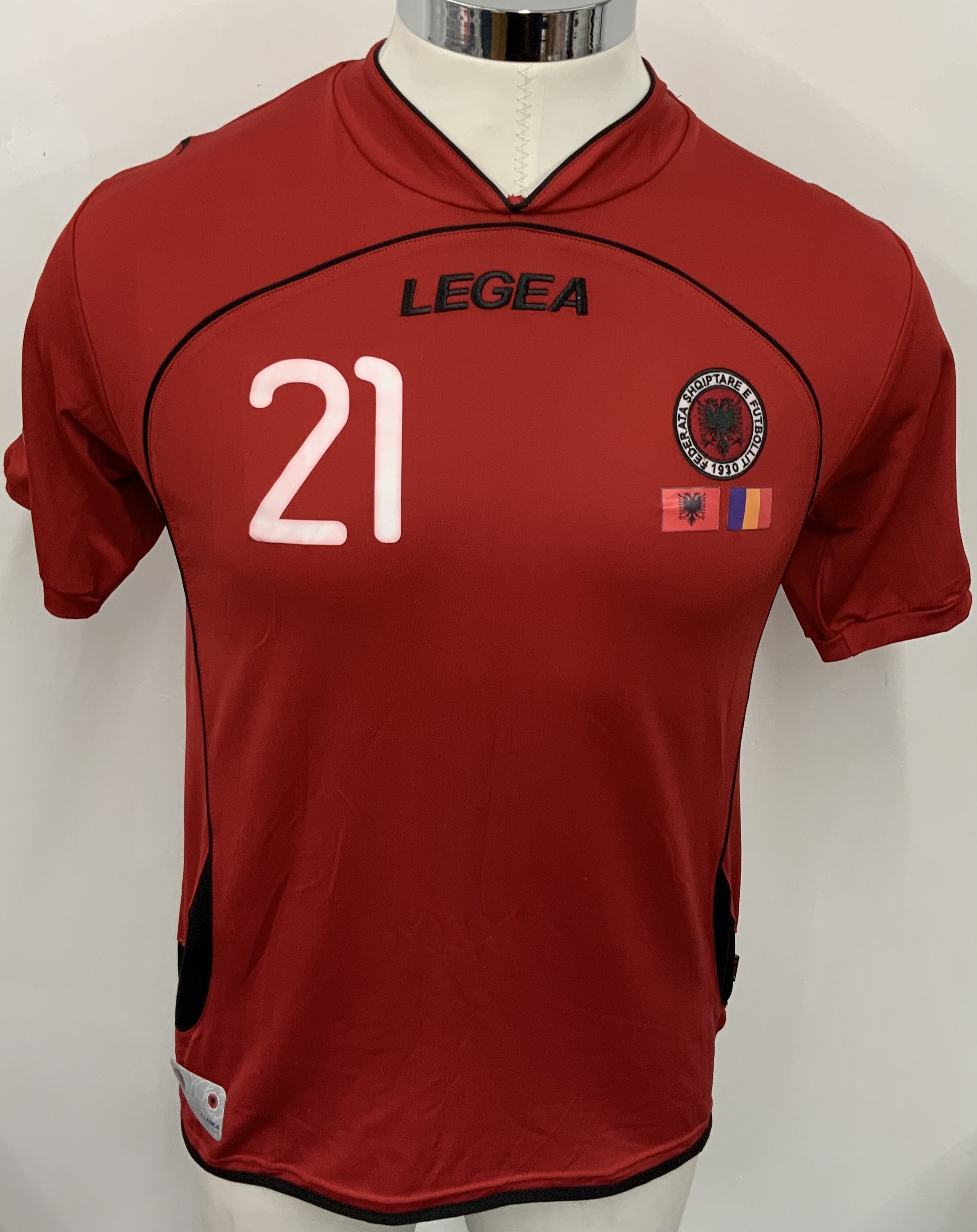 Albania 2011 Match Worn Football Shirt: Red short sleeve shirt. Number 21 Hyka. Worn v Romania in Euros Qualifier on 11 October 2011. Euros badging to sleeves.