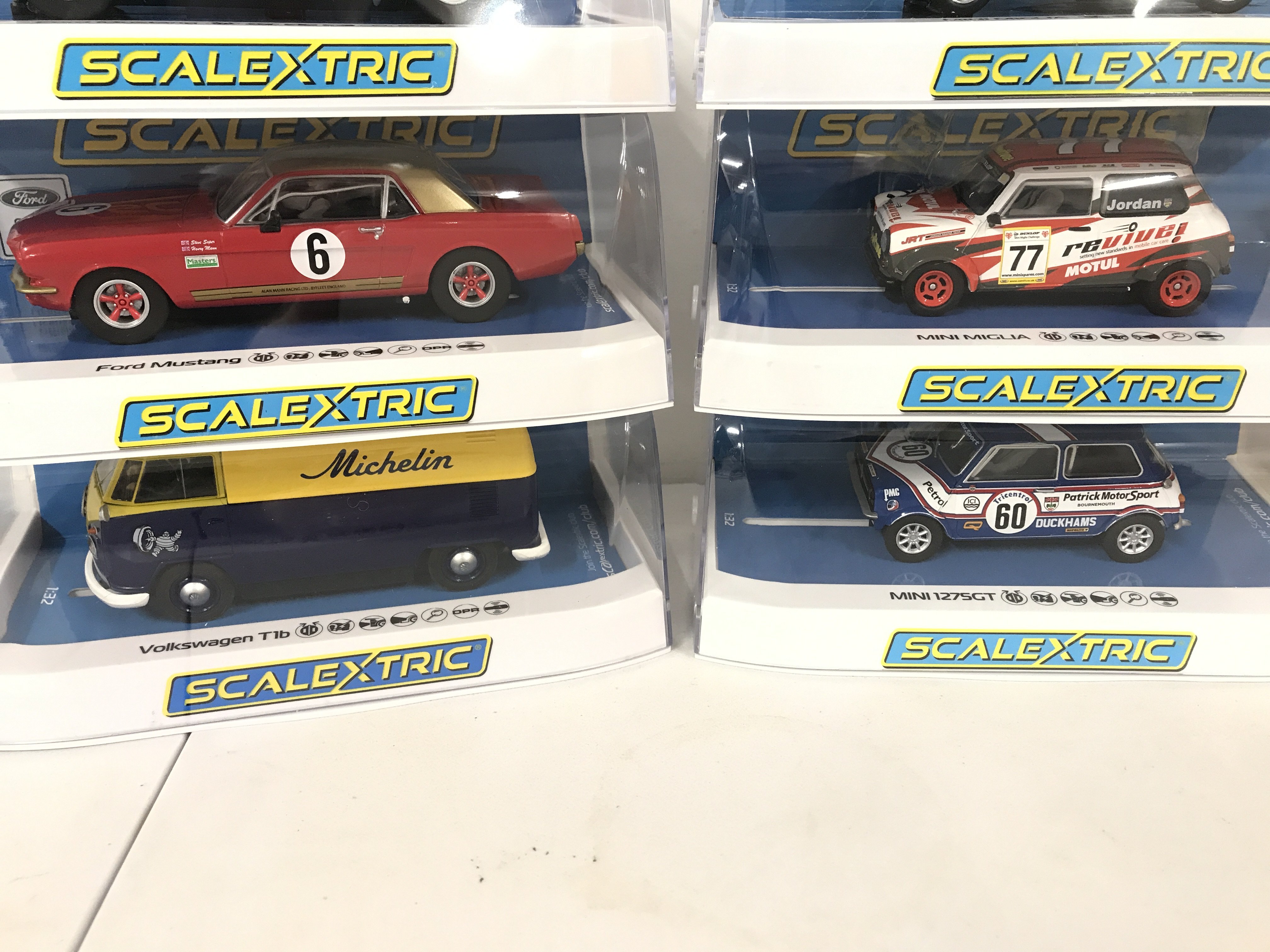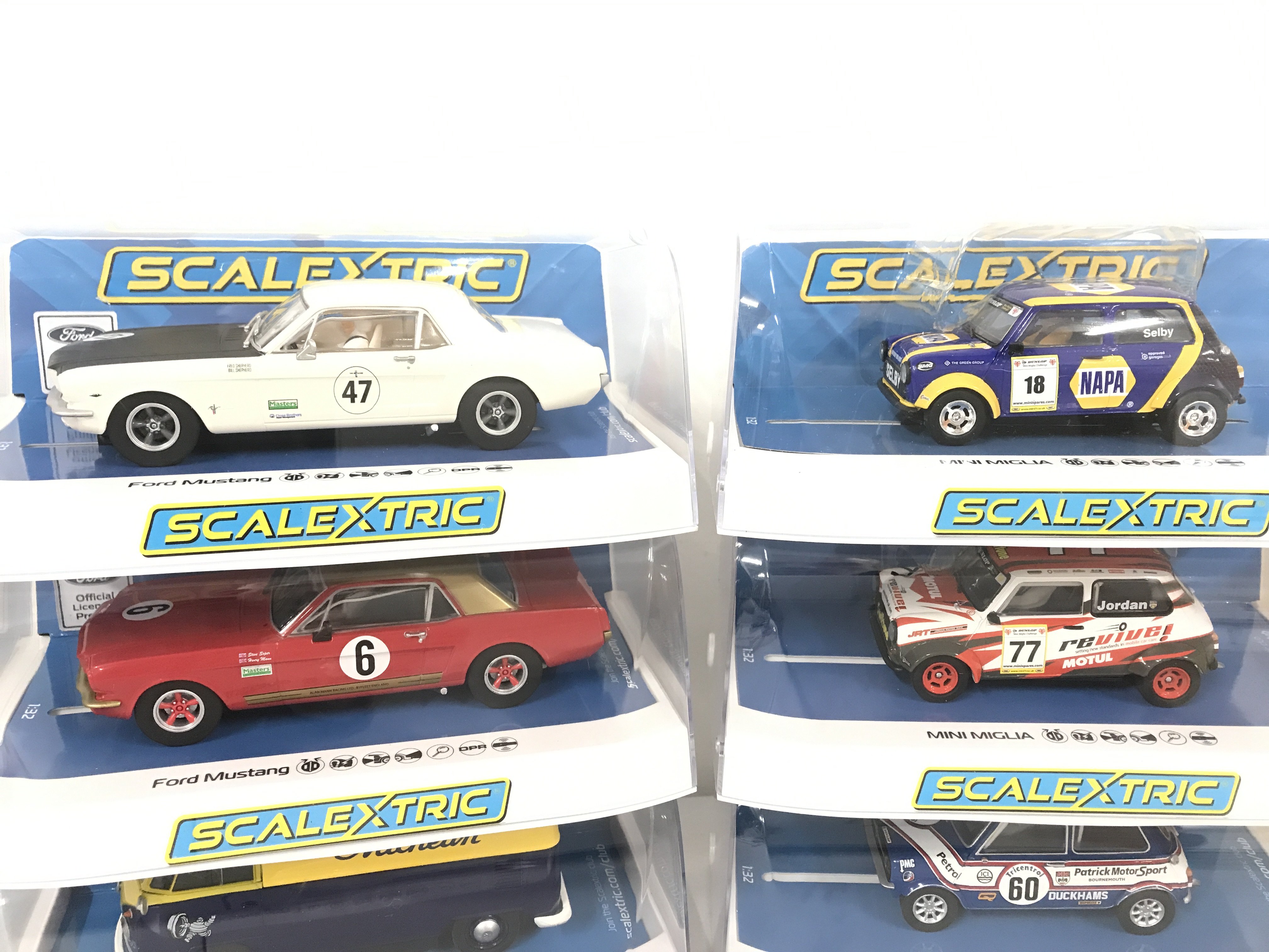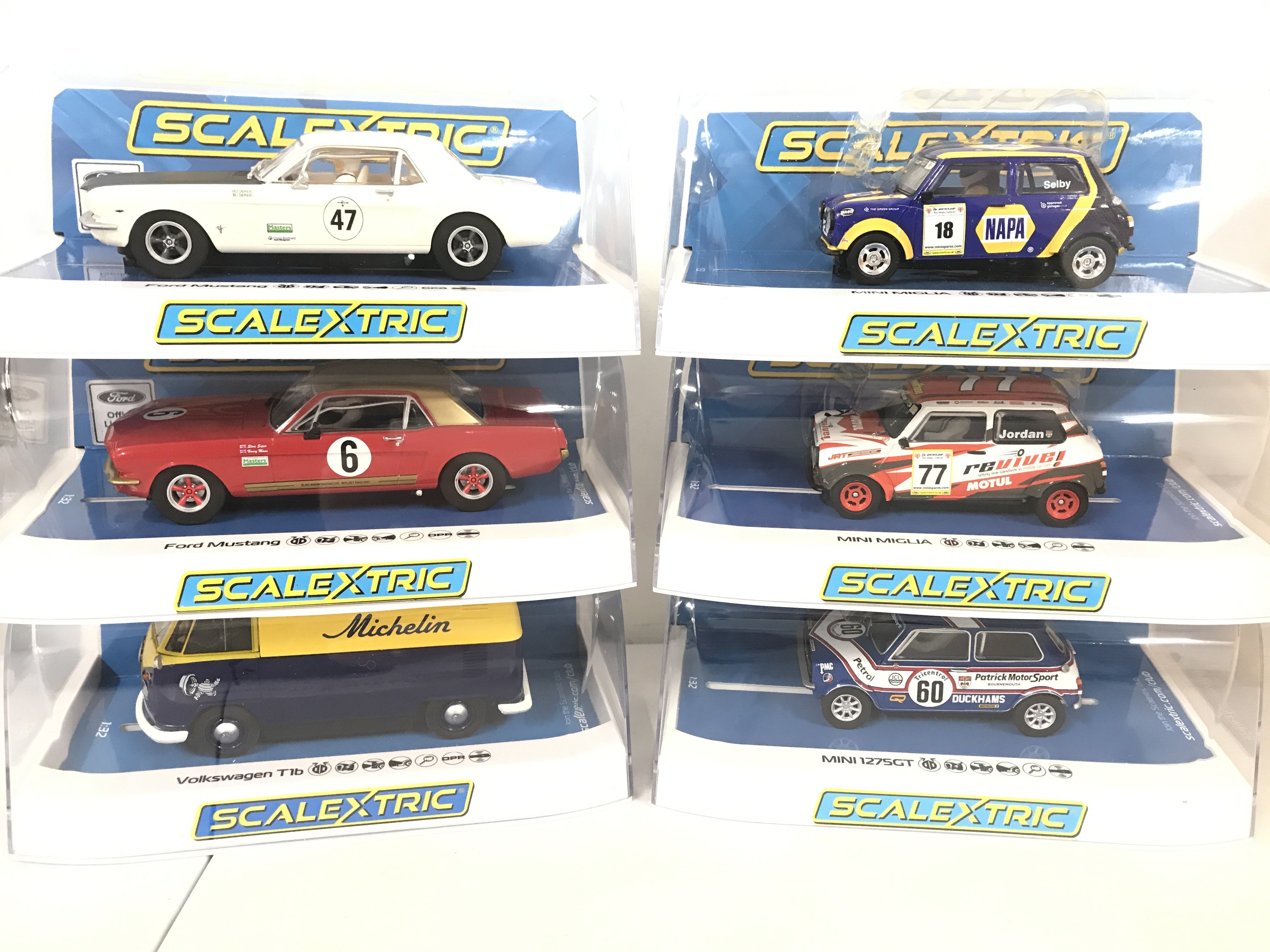 6 Boxed Scalextric Cars. 2 X Ford Mustangs. A Volkswagen T1B. 2X Mini Miglias and a Mini 1275GT.