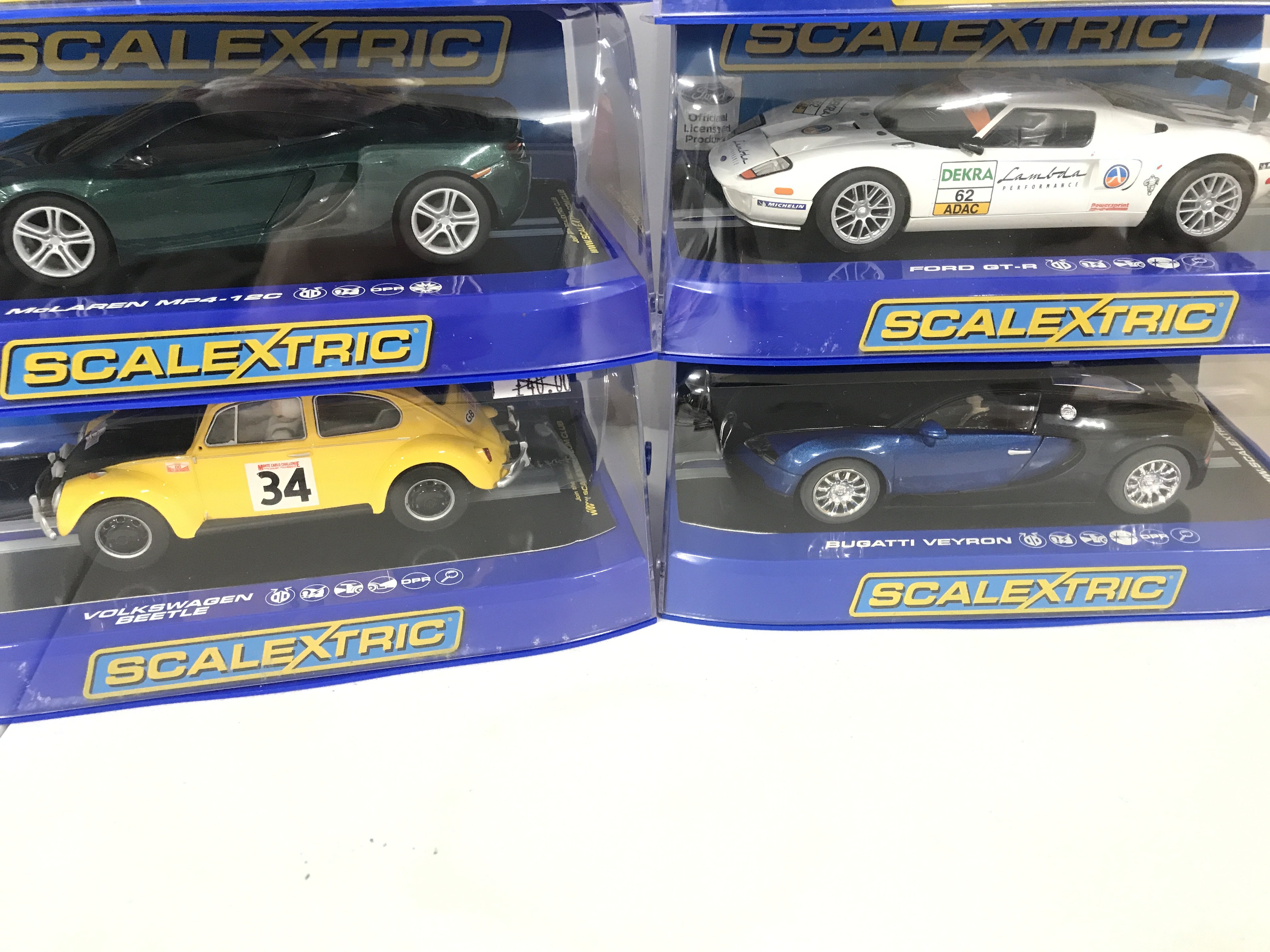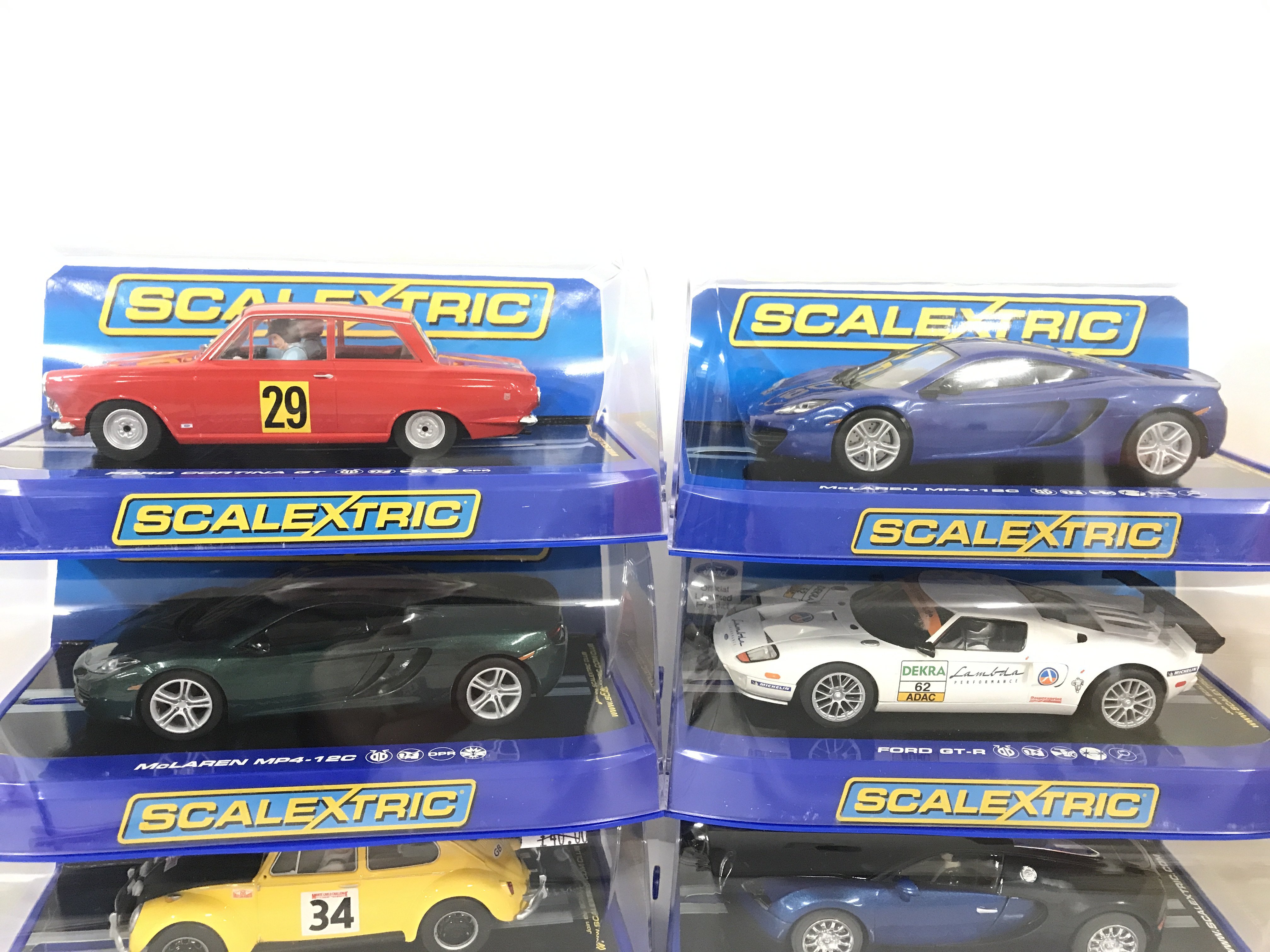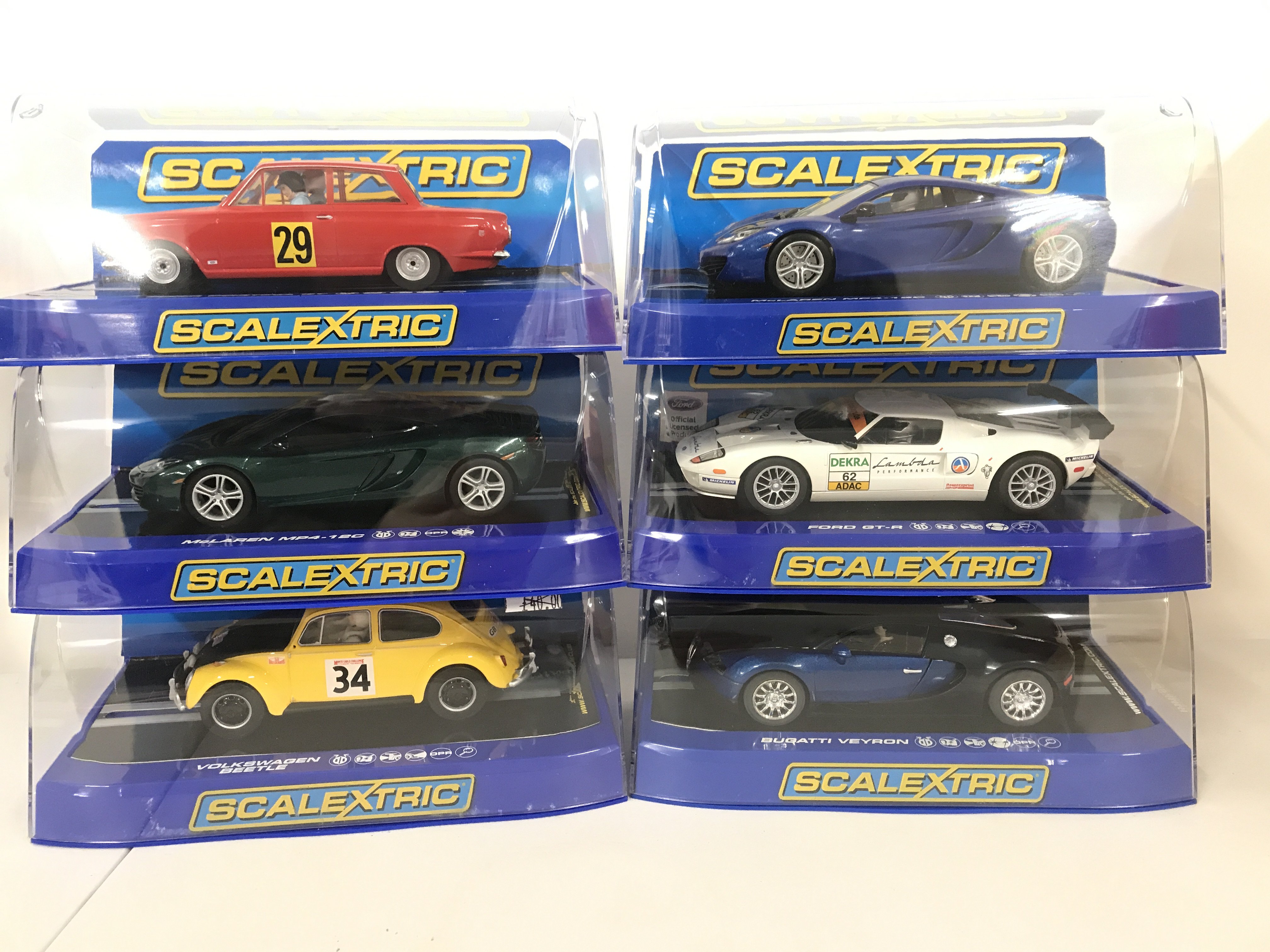6 Boxed Scalextric Cars including a Ford Cortina. 2 X McLaren MP4-12C. A Ford GT-R. A Bugatti Veyron and a Volkswagen Beetle.