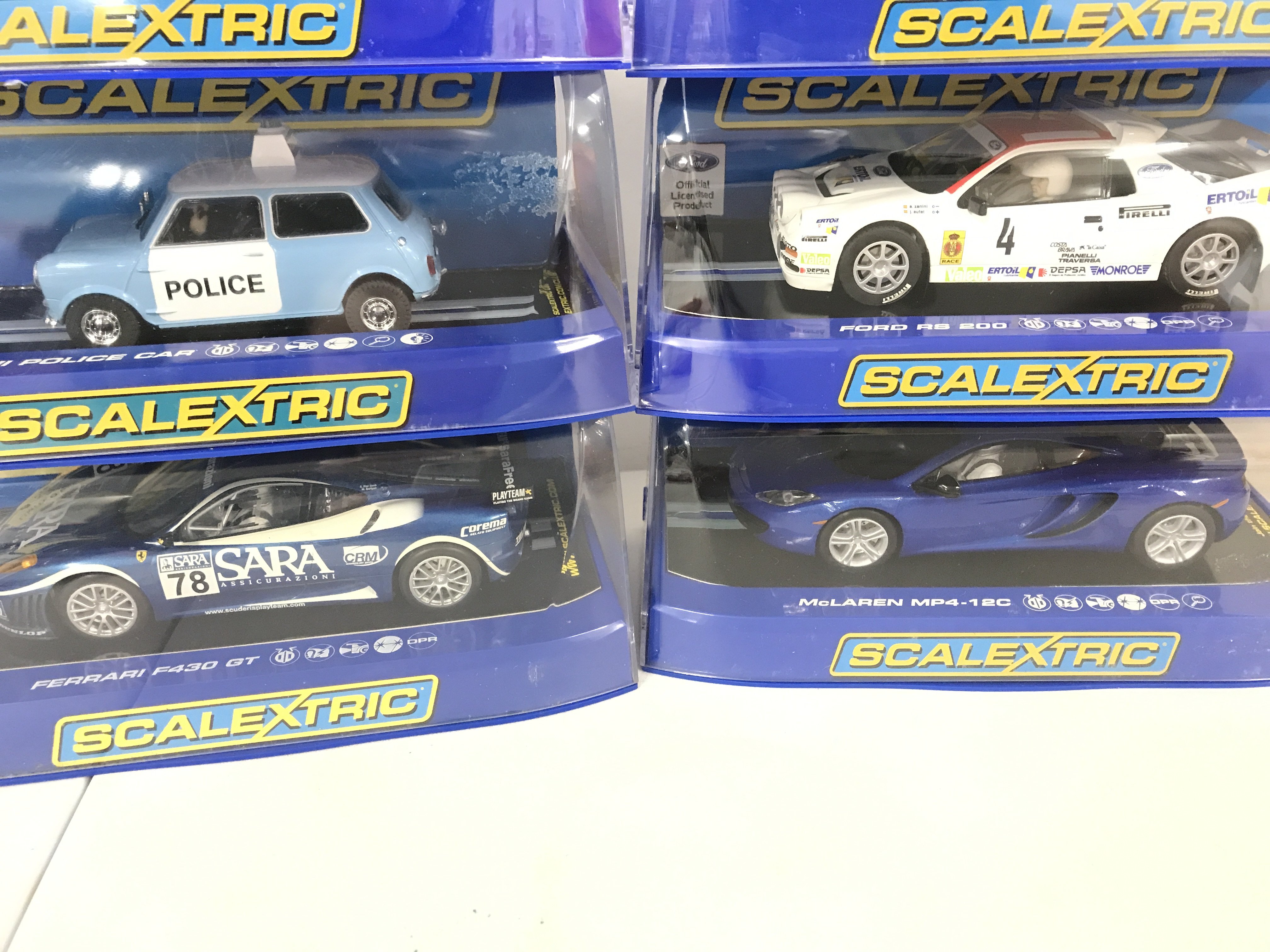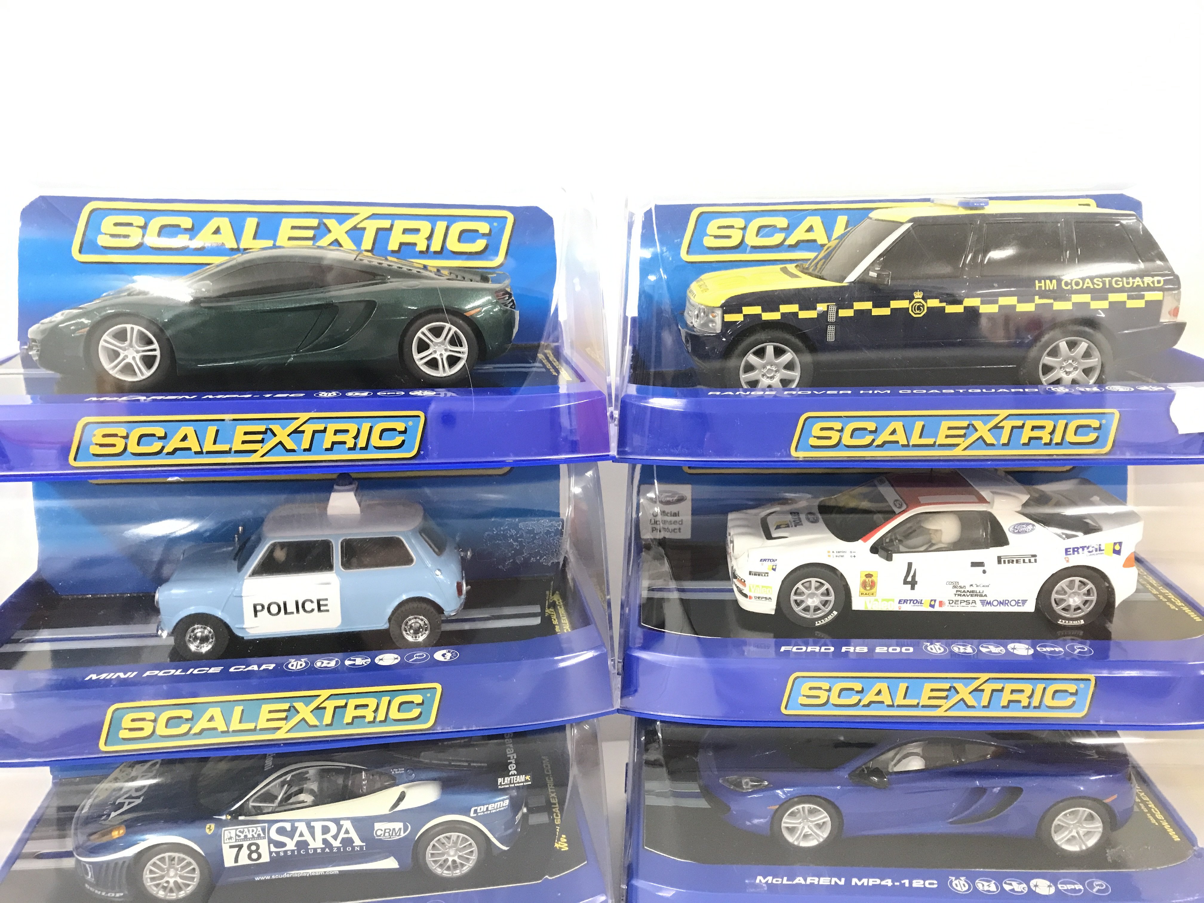 6 Boxed Scalextric Cars. 2 x McLaren MP4-12C. A Range Rover HM Coastguard. A Mini Police Car. A Ford RS 200. And a Ferrari F430 GT