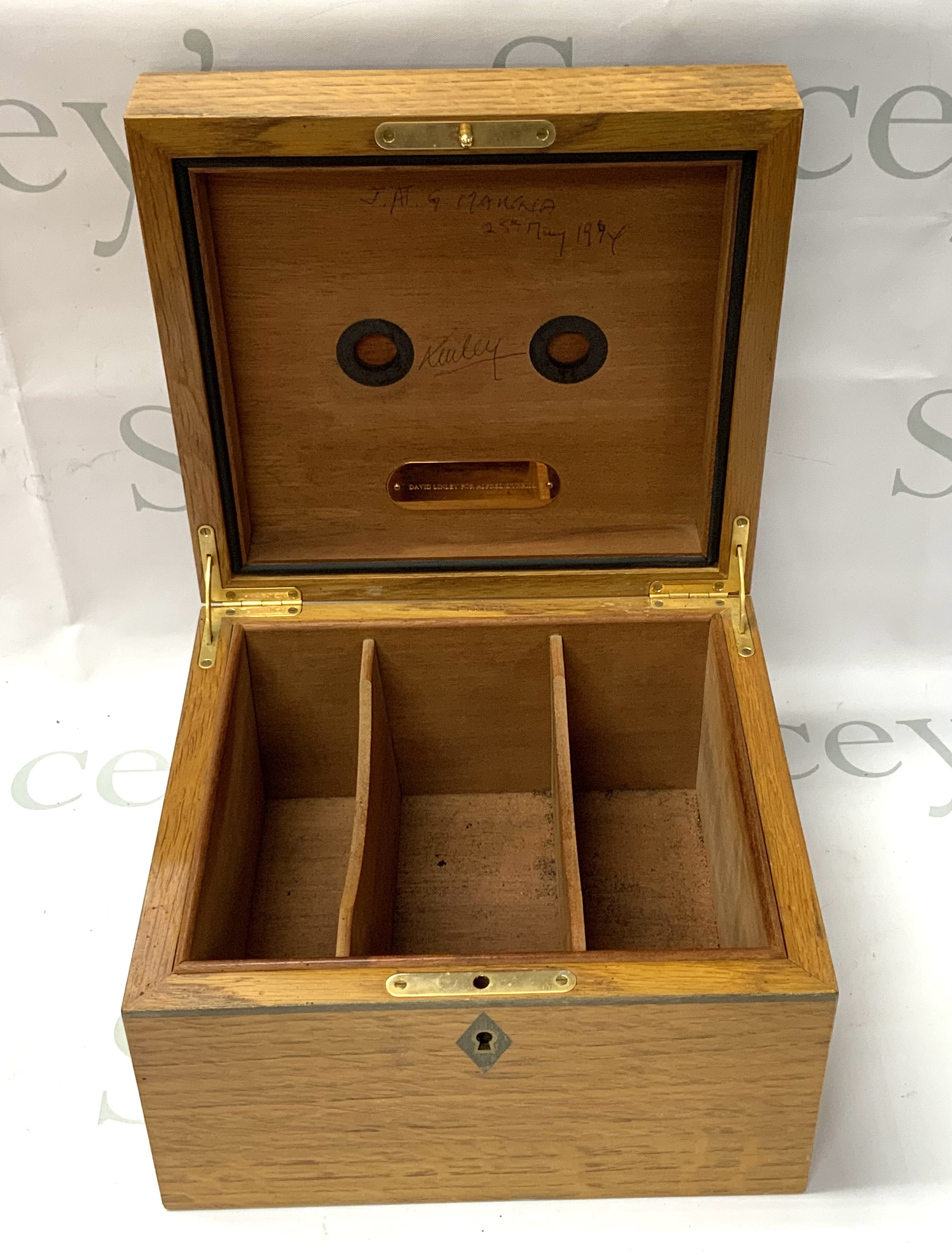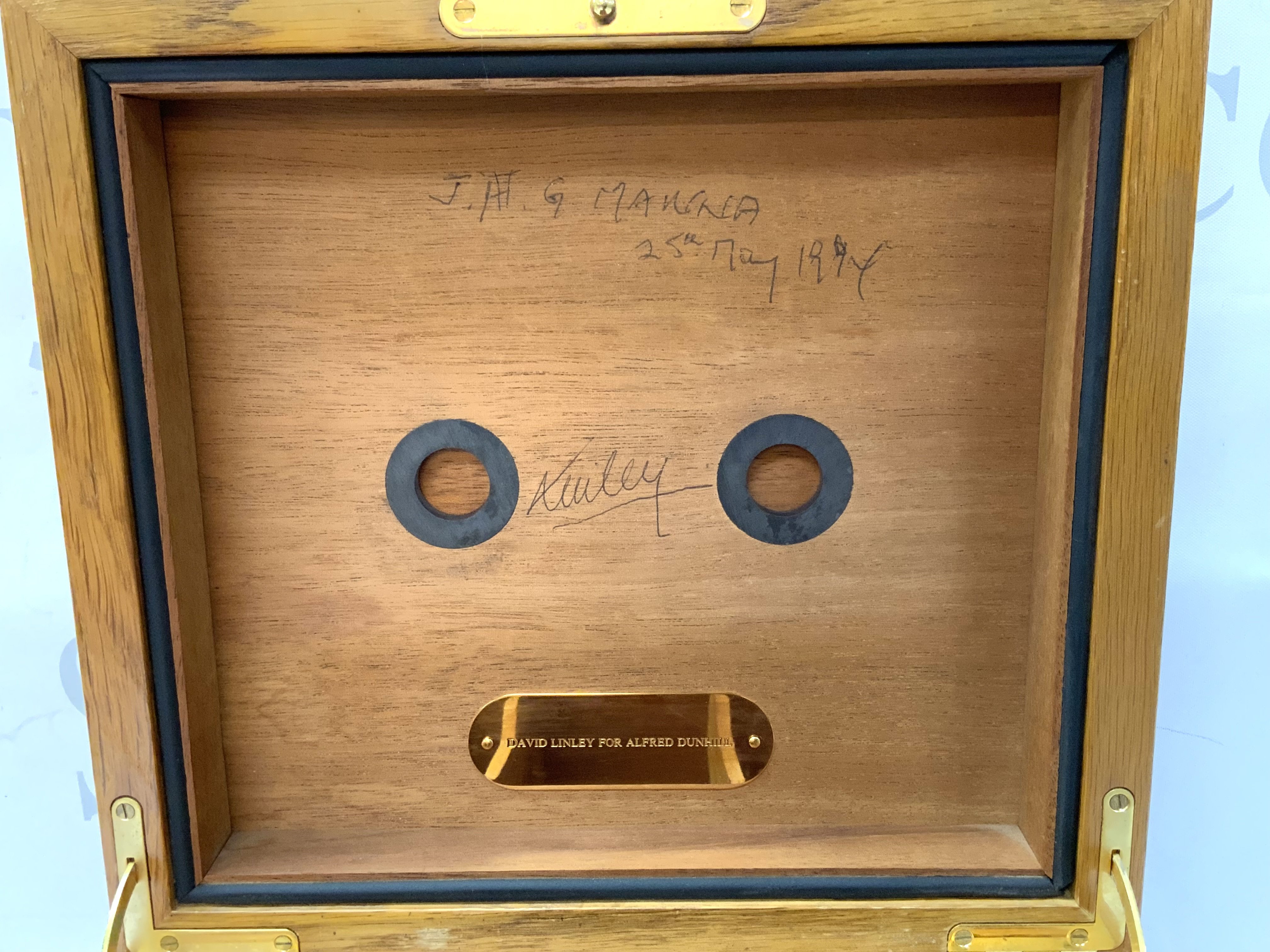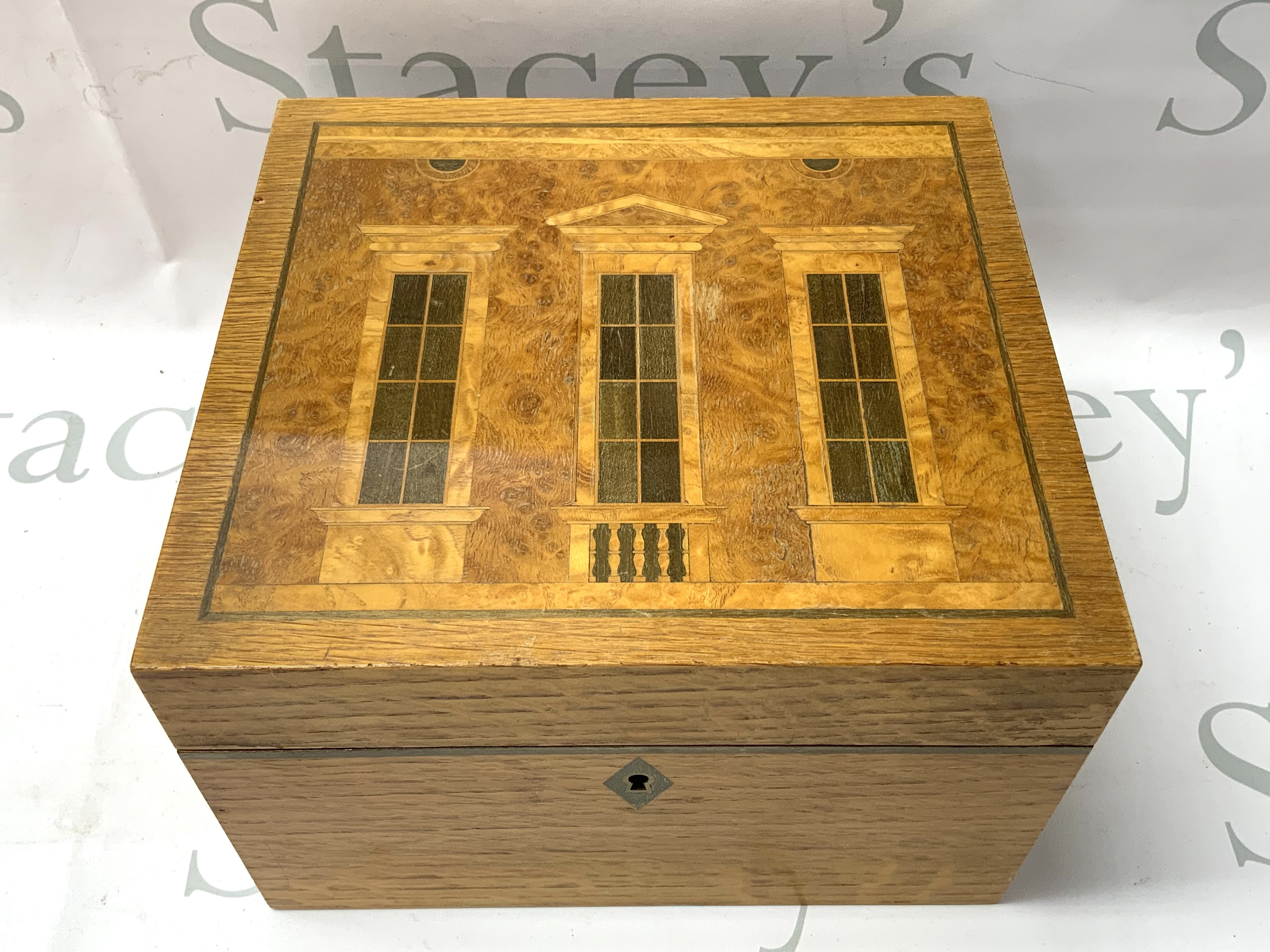 An inlaid wood humidor made by David Linley for Alfred Dunhill The top inlaid with a design inspired by Classical architecture. 24cm x 22cm x 16cm