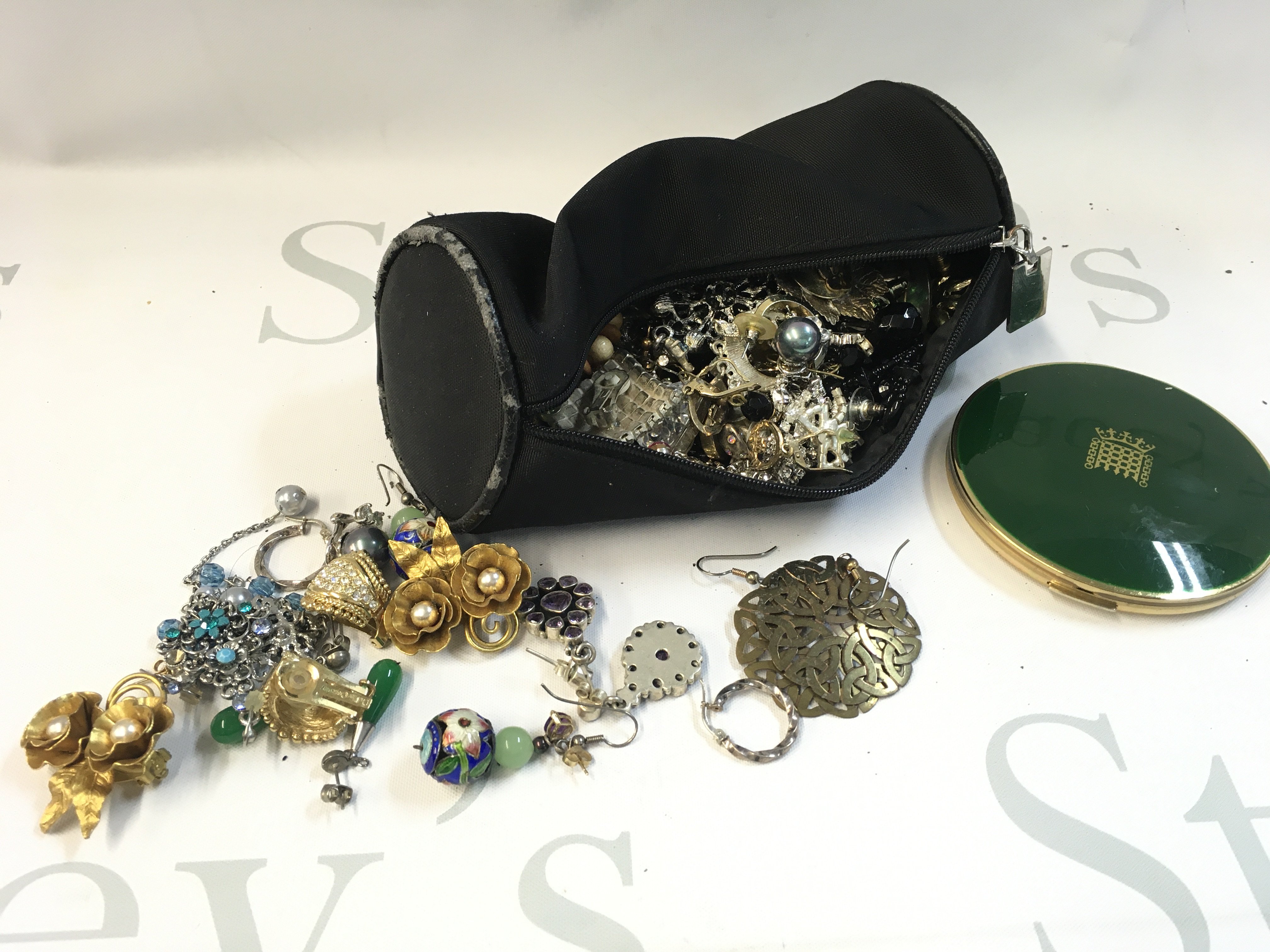 A Collection of earrings including silver and gold examples and a Houses of Parliament Stratton compact, postage category B