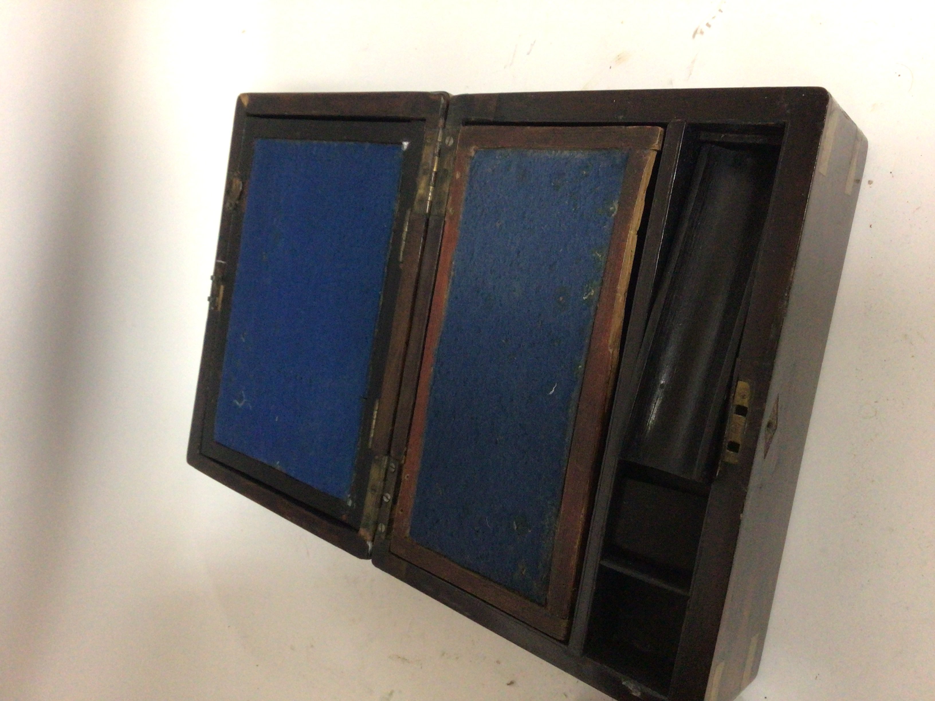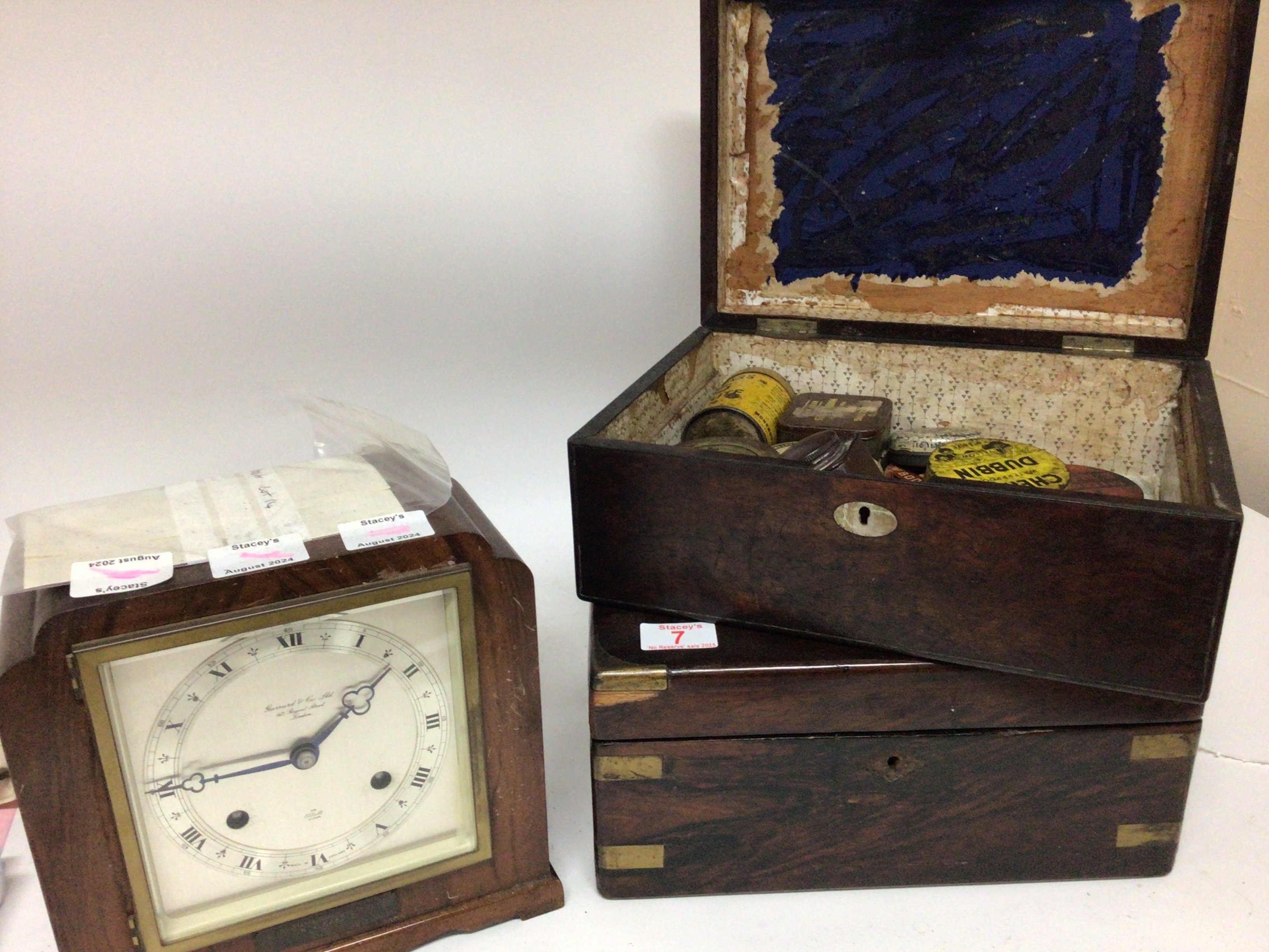 A walnut mantel clock the silvered dial Garrard &Co a rosewood work box and one other rosewood box containing vintage shoe polish tins no reserve.