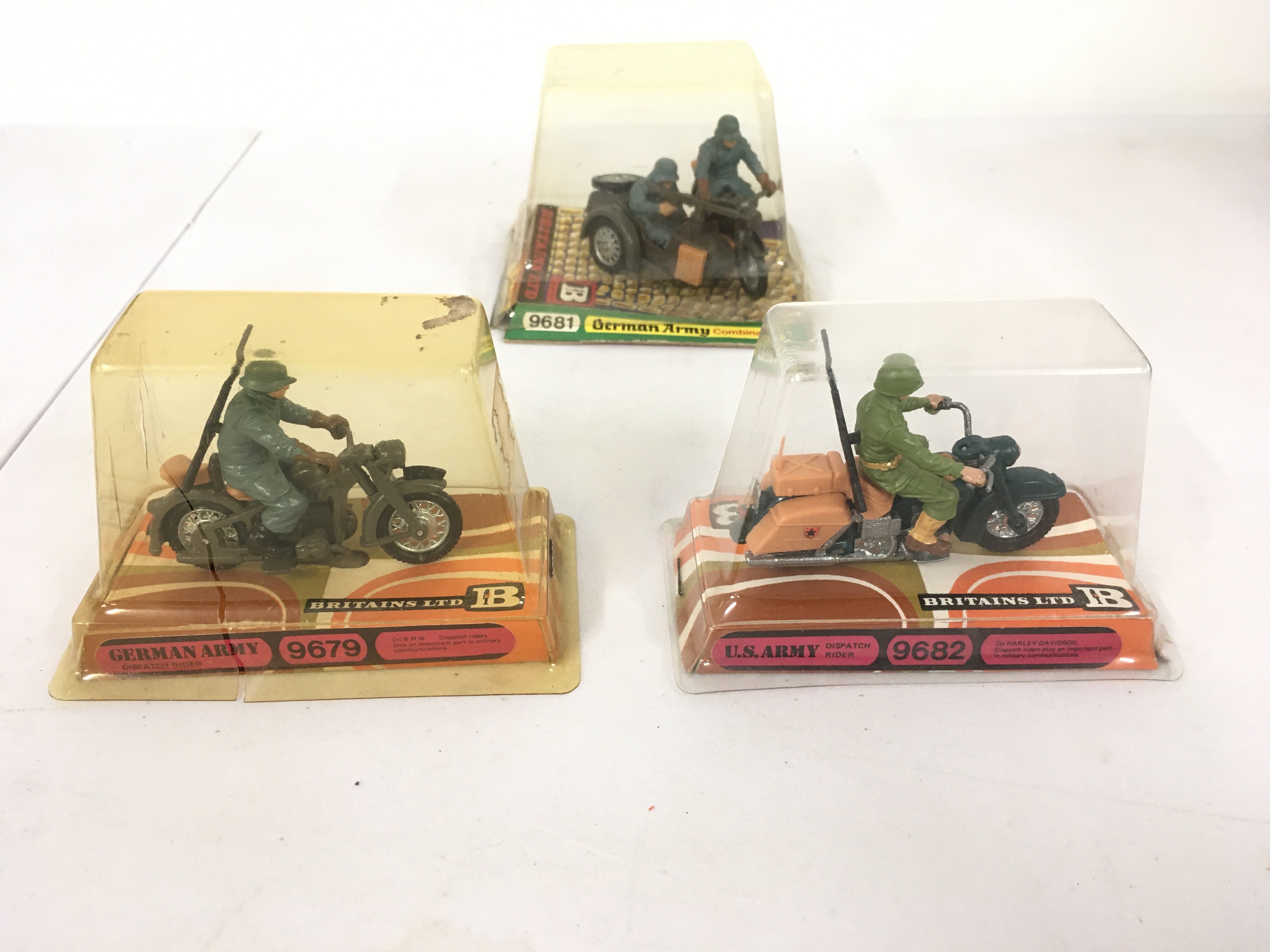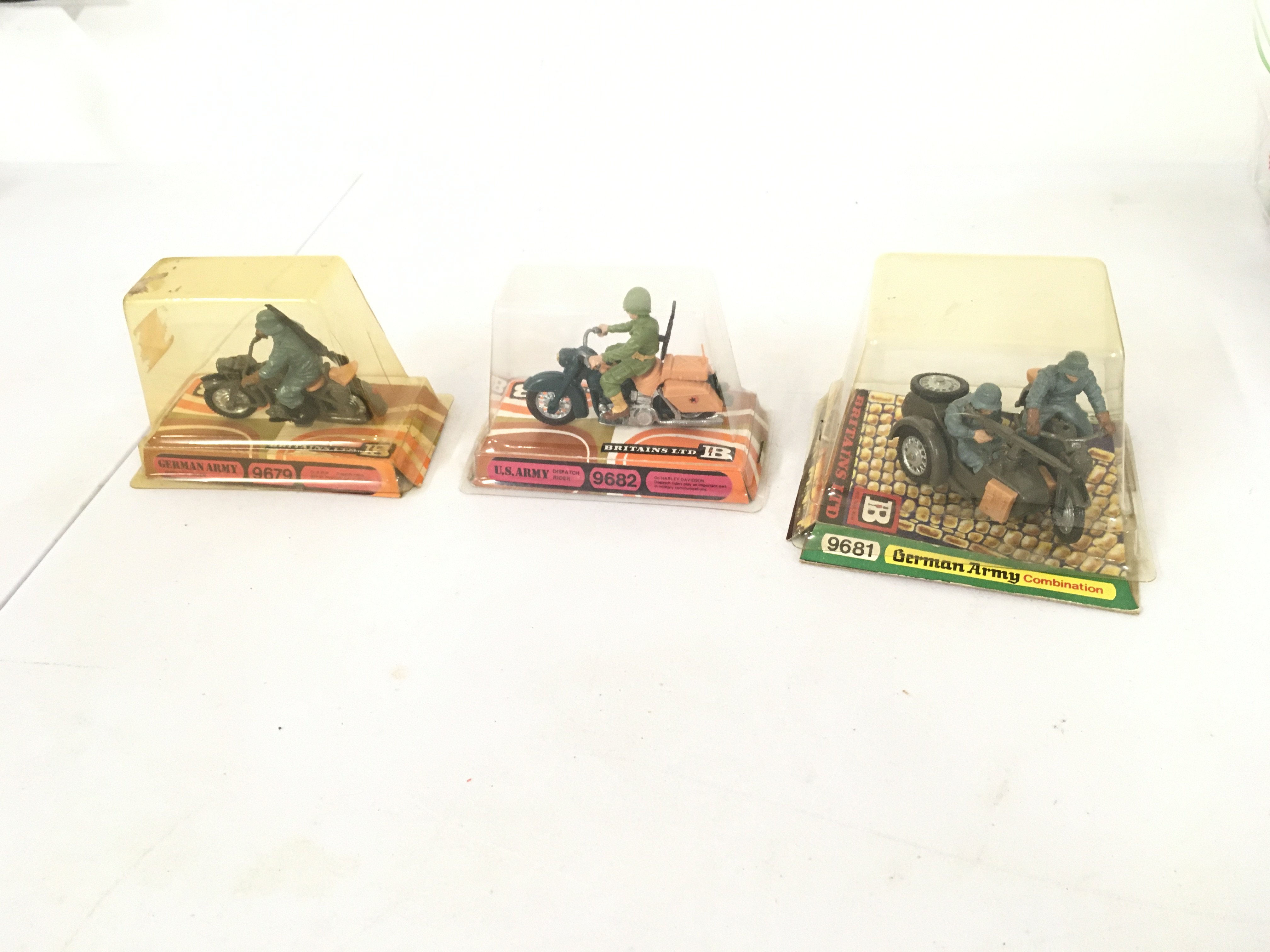 A group of 3 Britains model military motorcycles featuring German and US armies. Features 9679. 9681..9682 in original display packaging. No reserve