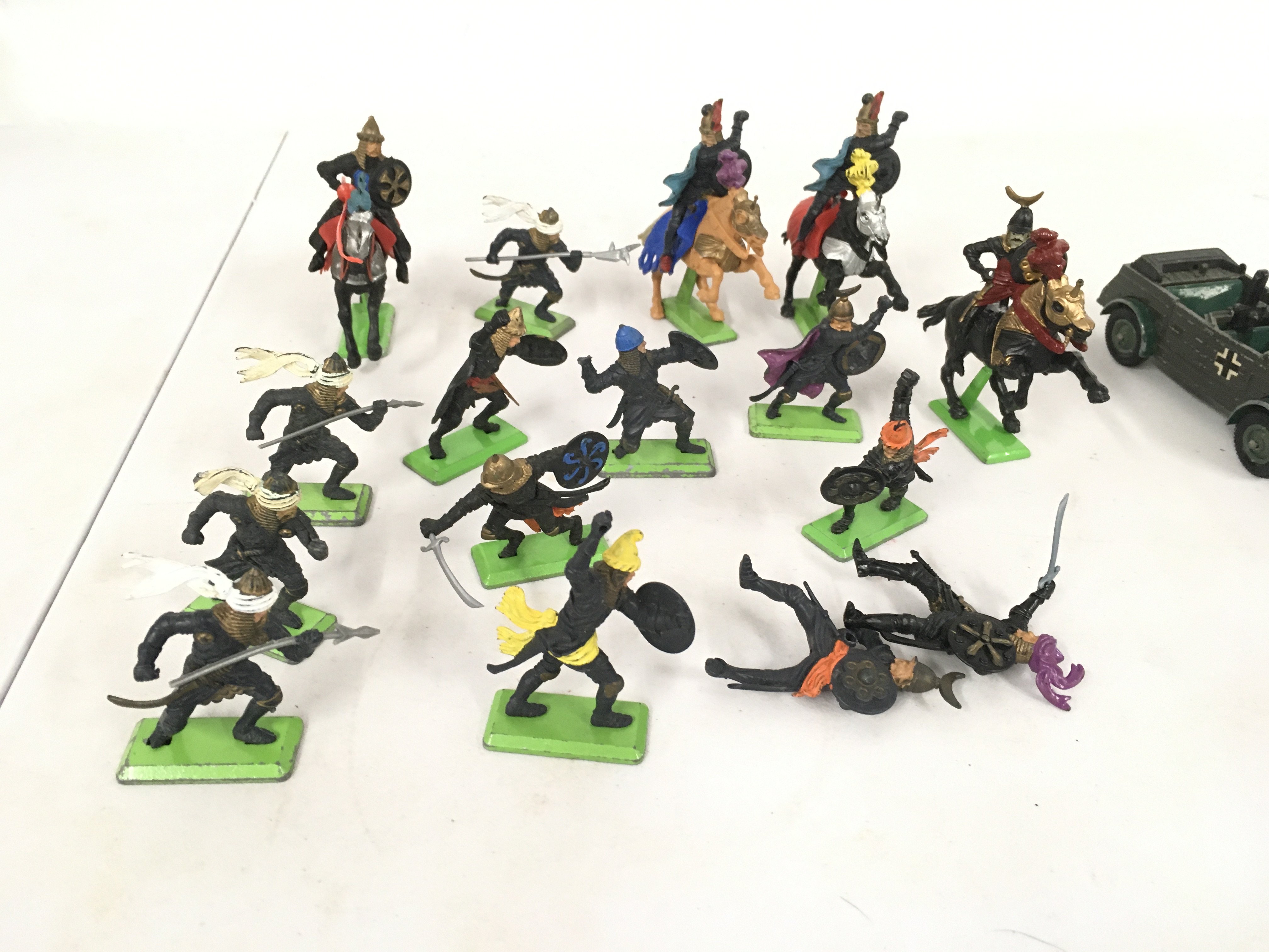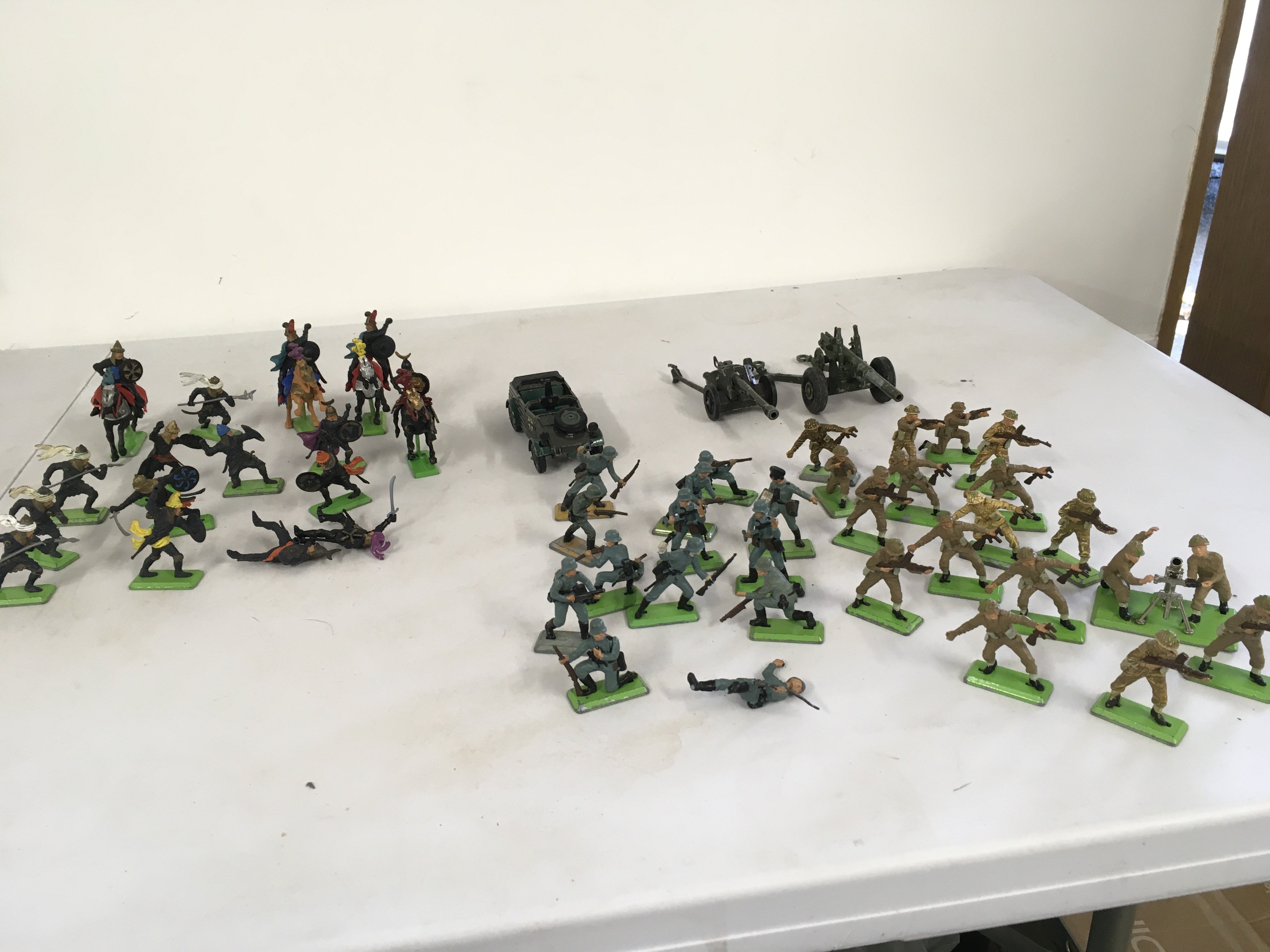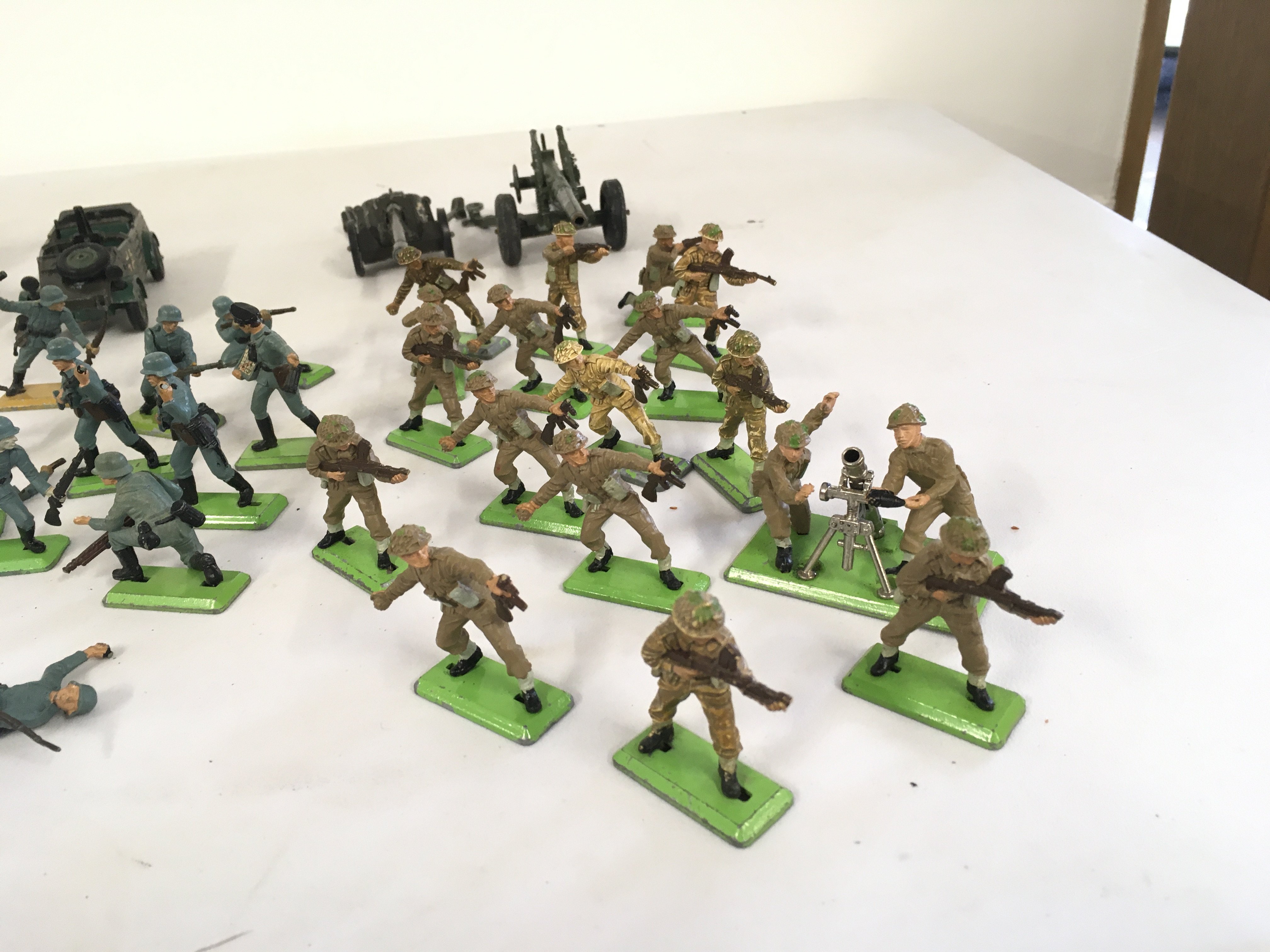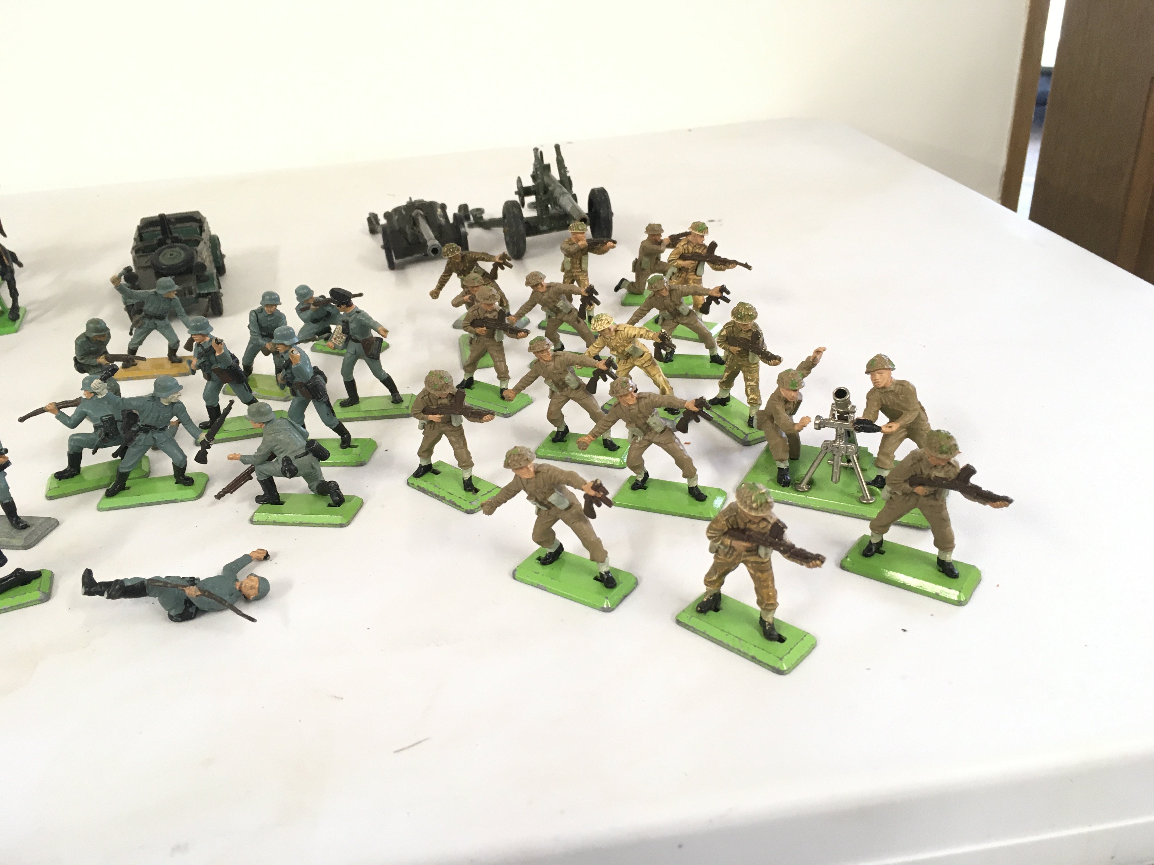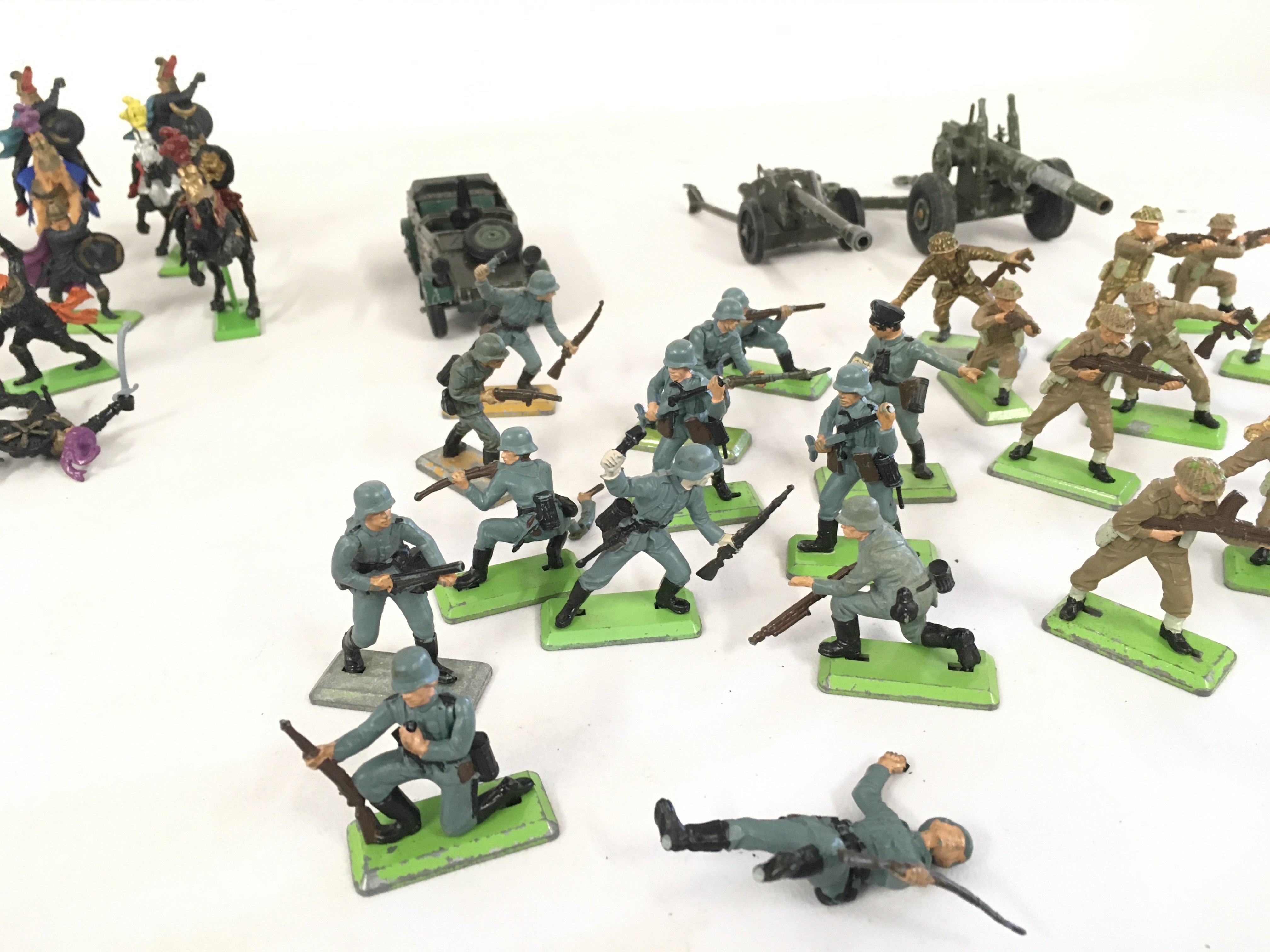 A collection of Britains Deetail model figures featuring Scaracens.. German WWII soldiers and British soldiers. Also diecast kubelwaggen and 2 artillery guns. No reserve