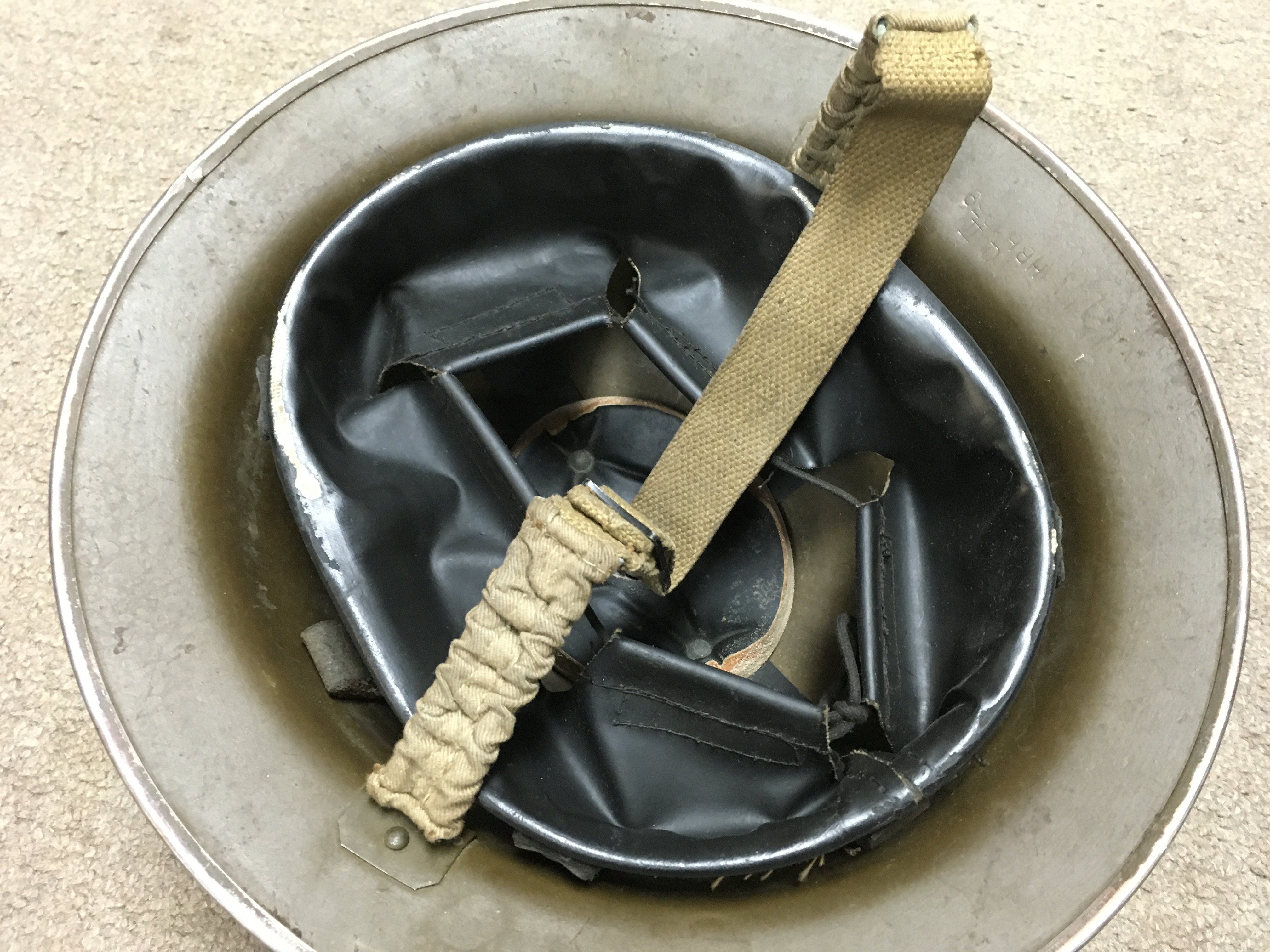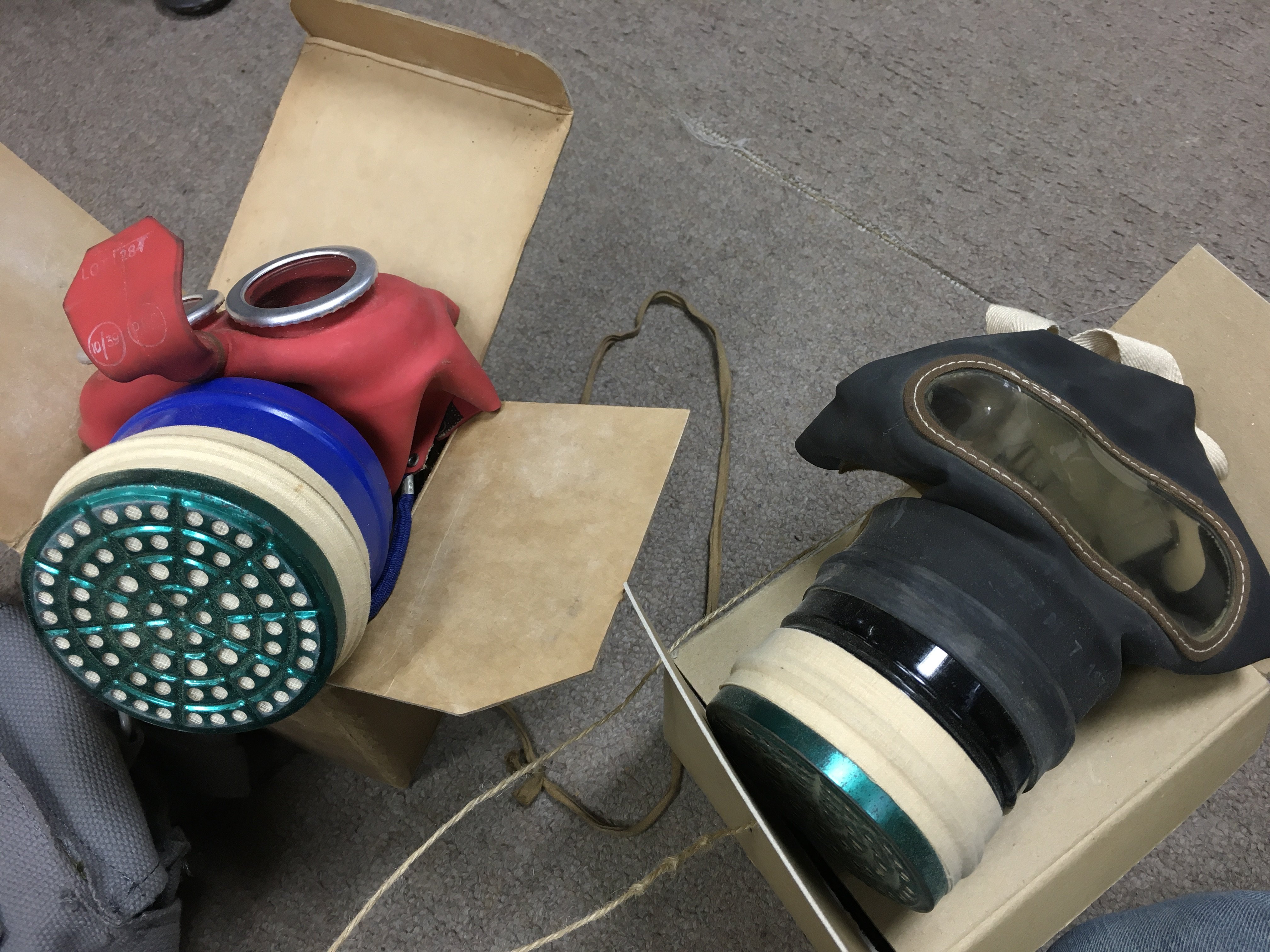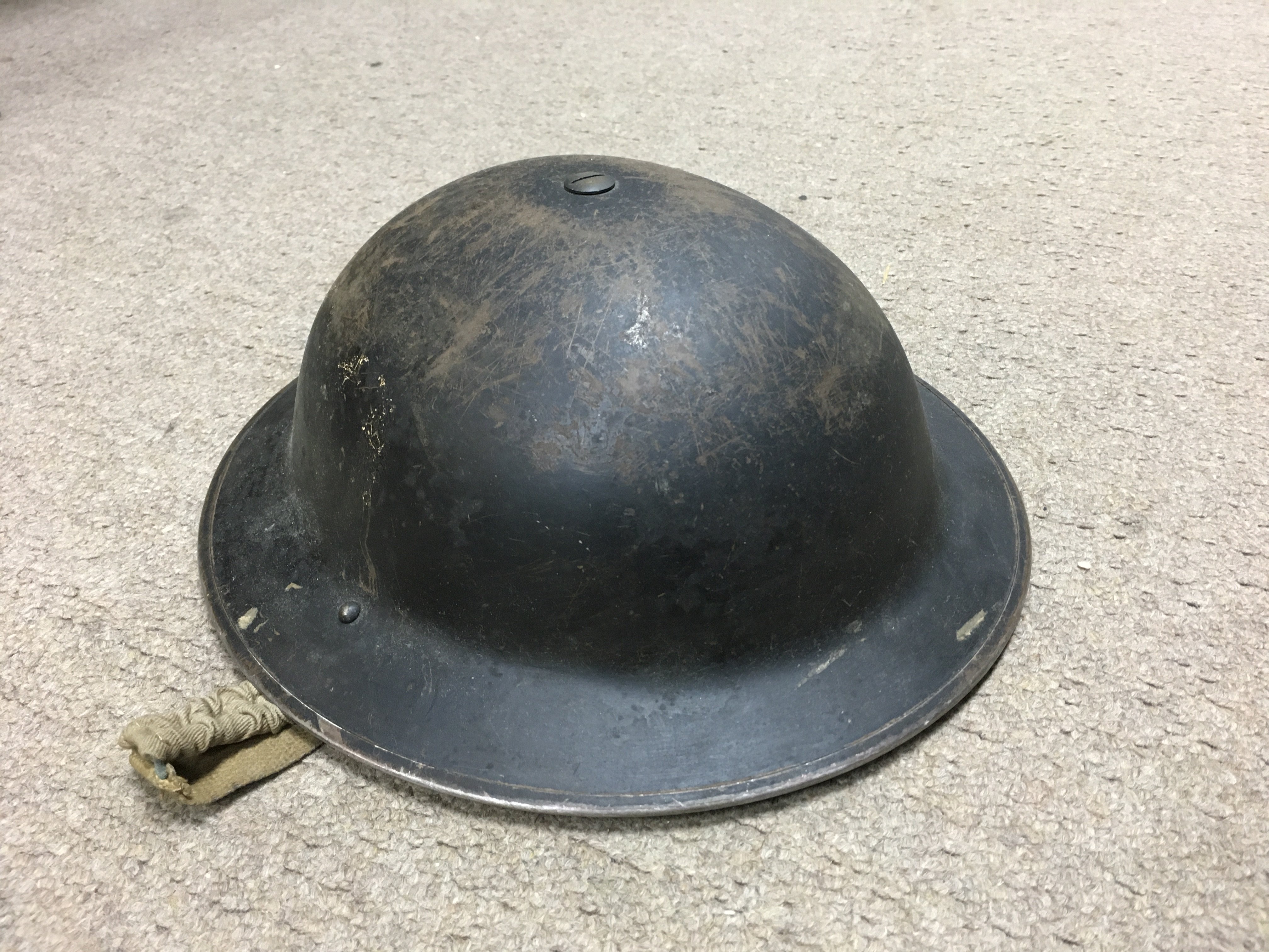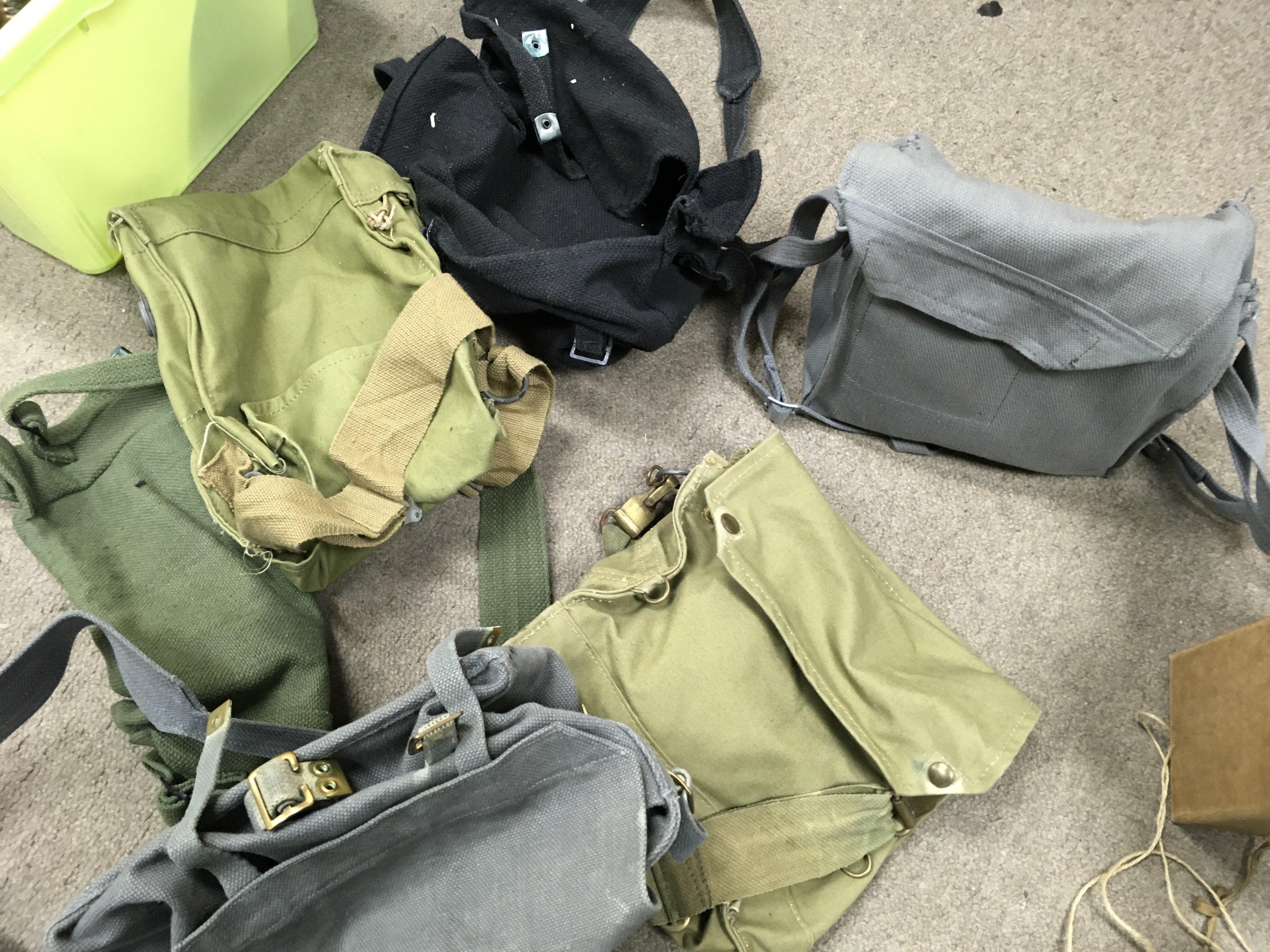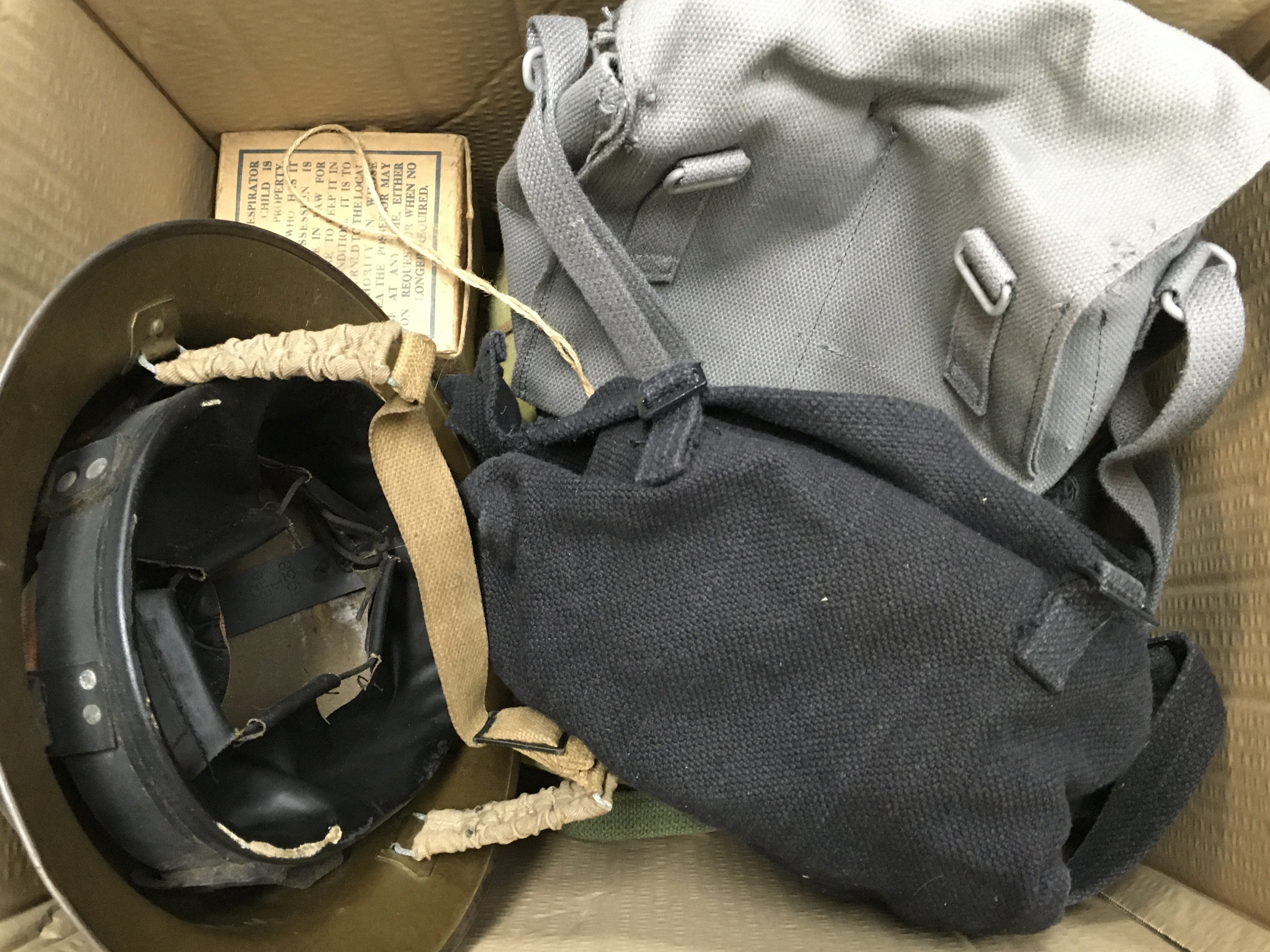 A Collection of WW1 & 2 items including a children’s gas mask, a soldiers helmet and various bags.