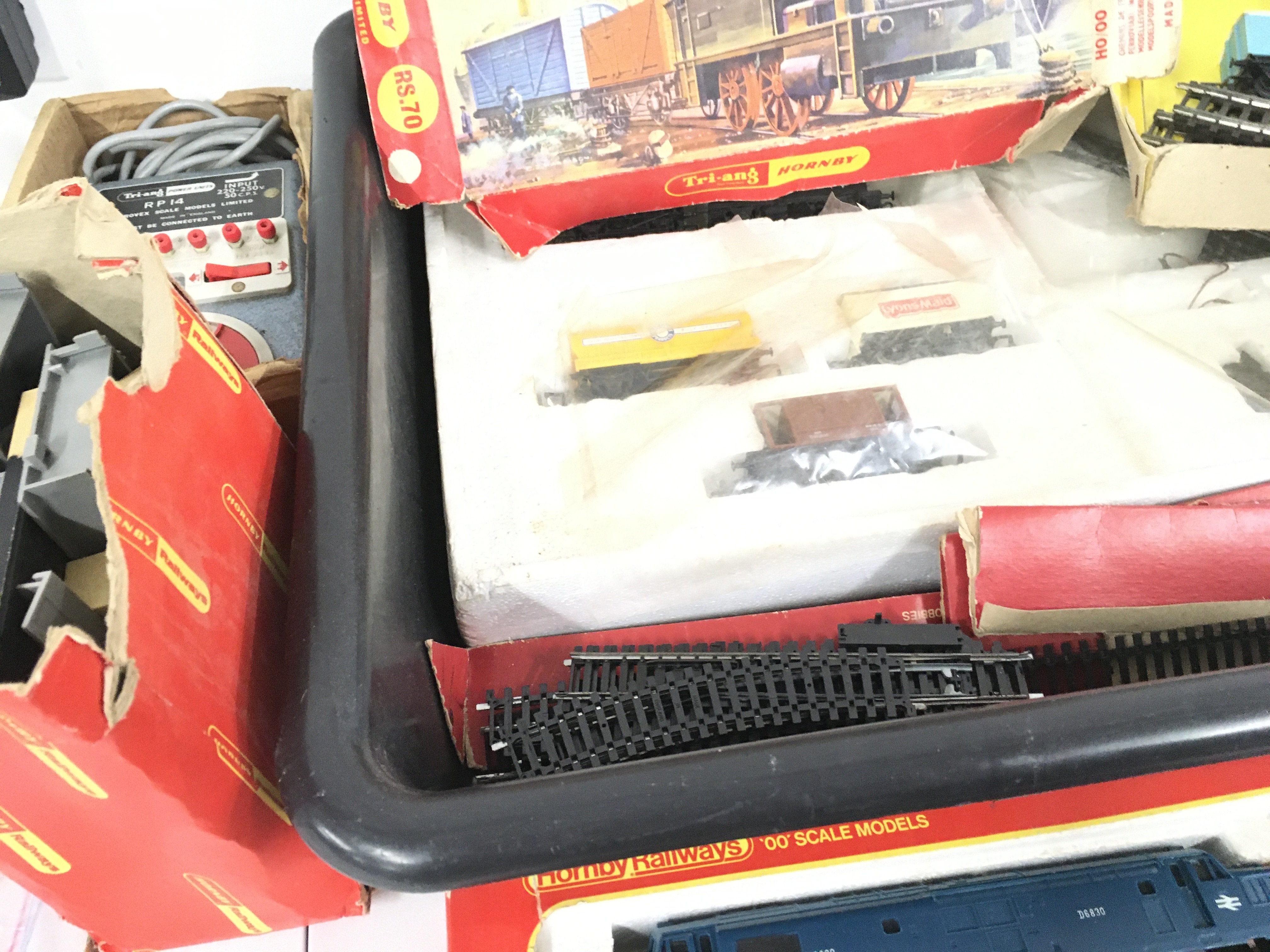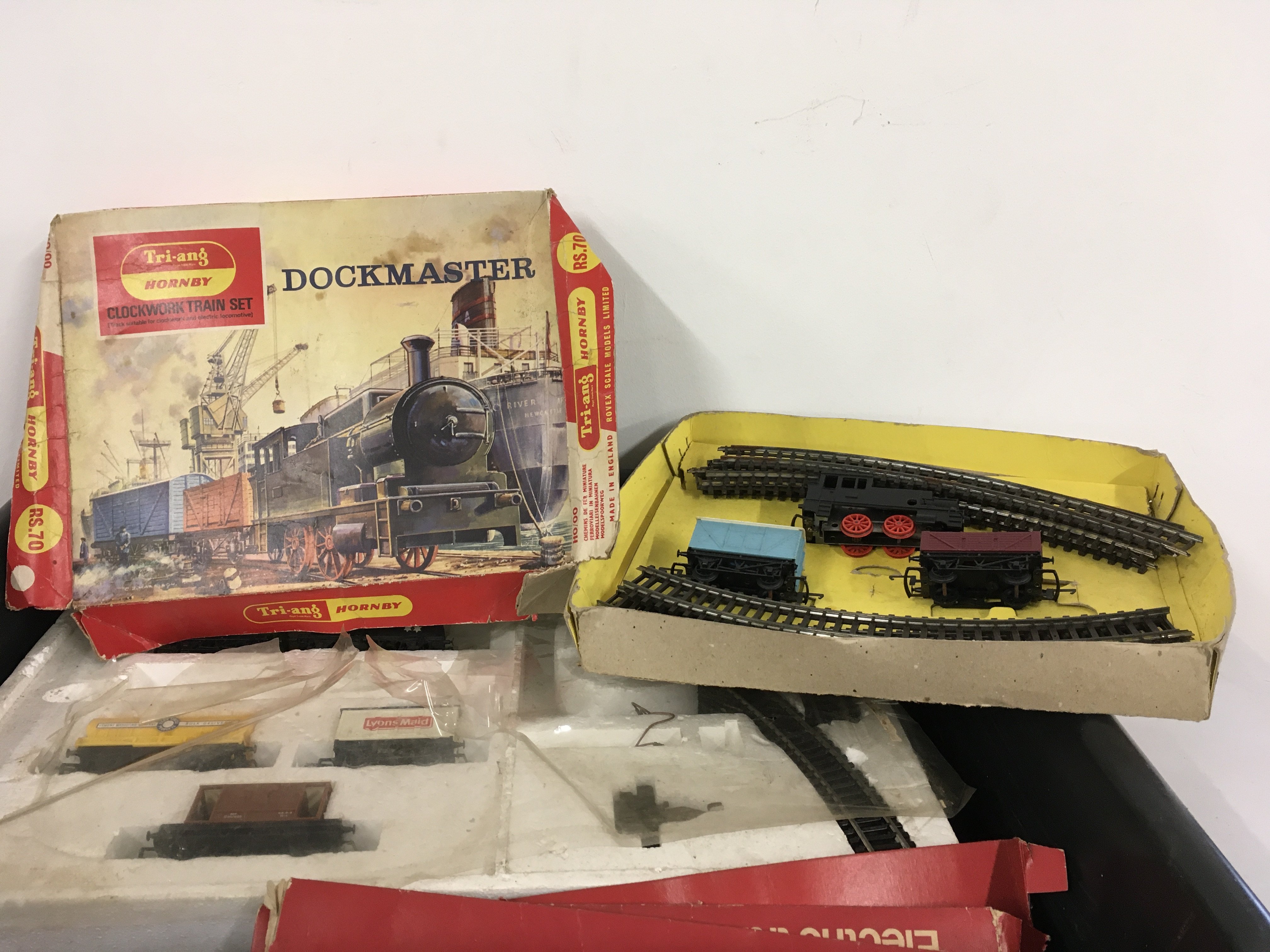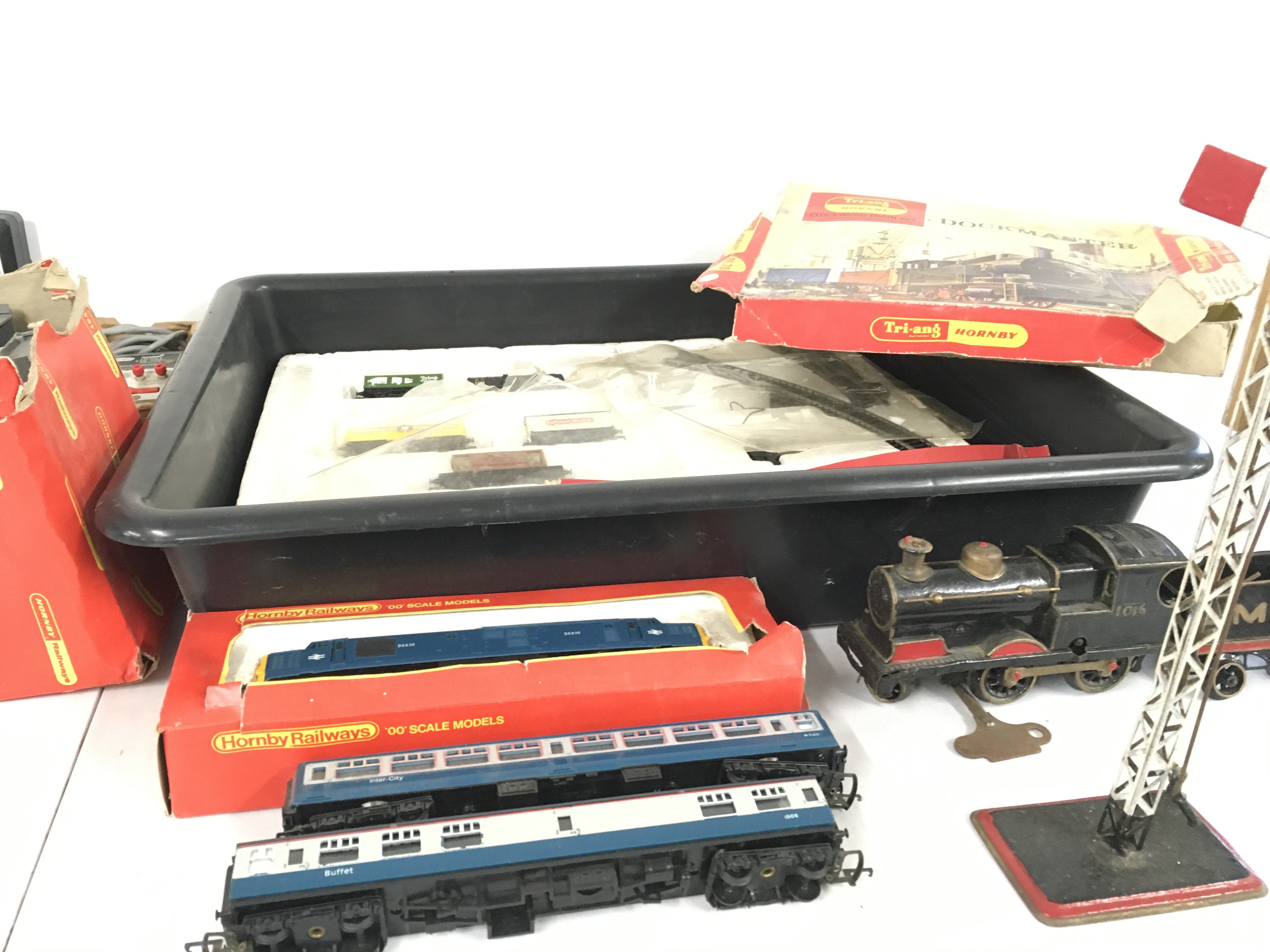 A collection of both clockwork and electric model railway locomotives and accessories, primarily 00 gauge. Features Triang and Hornby. No reserve