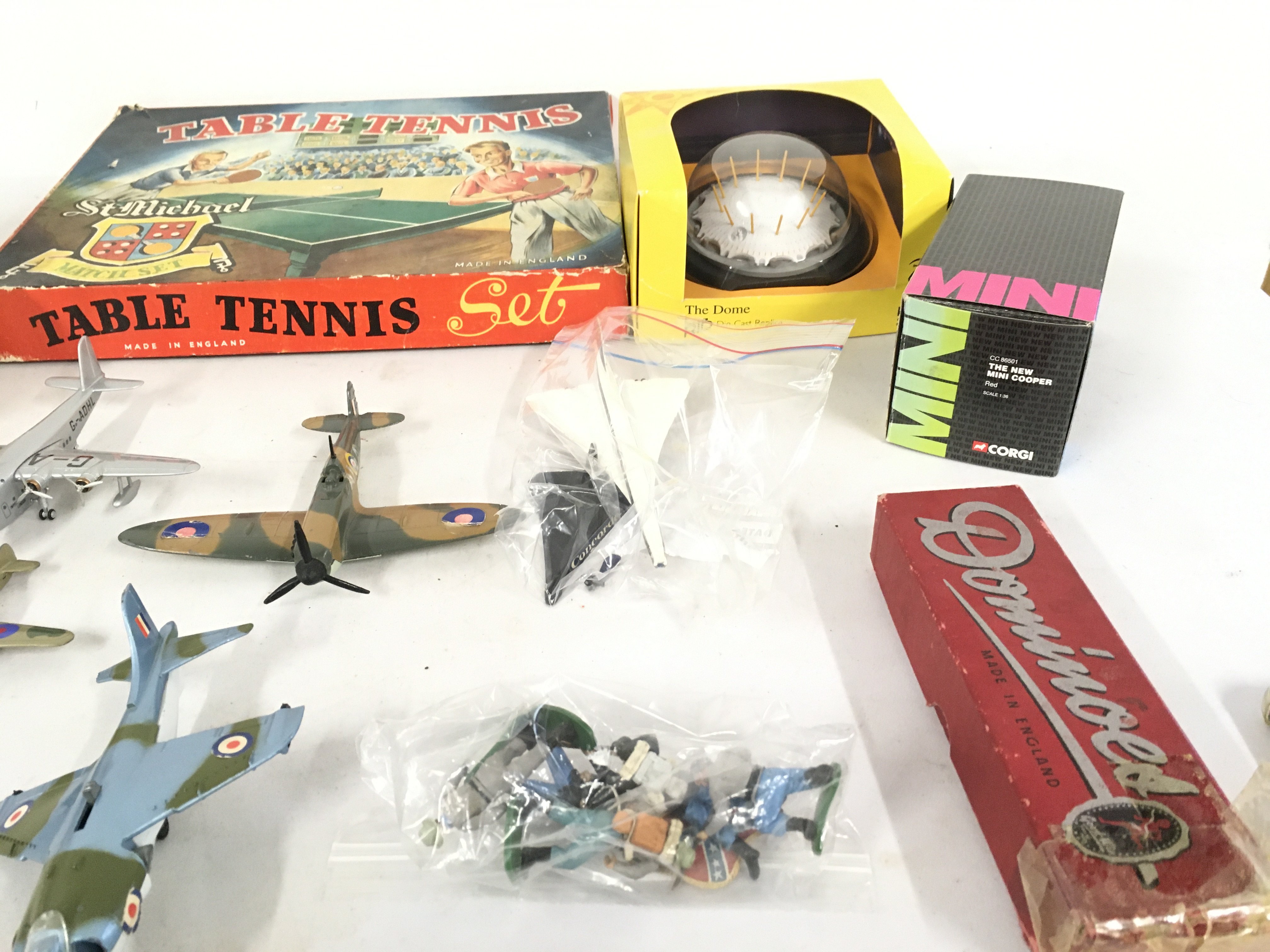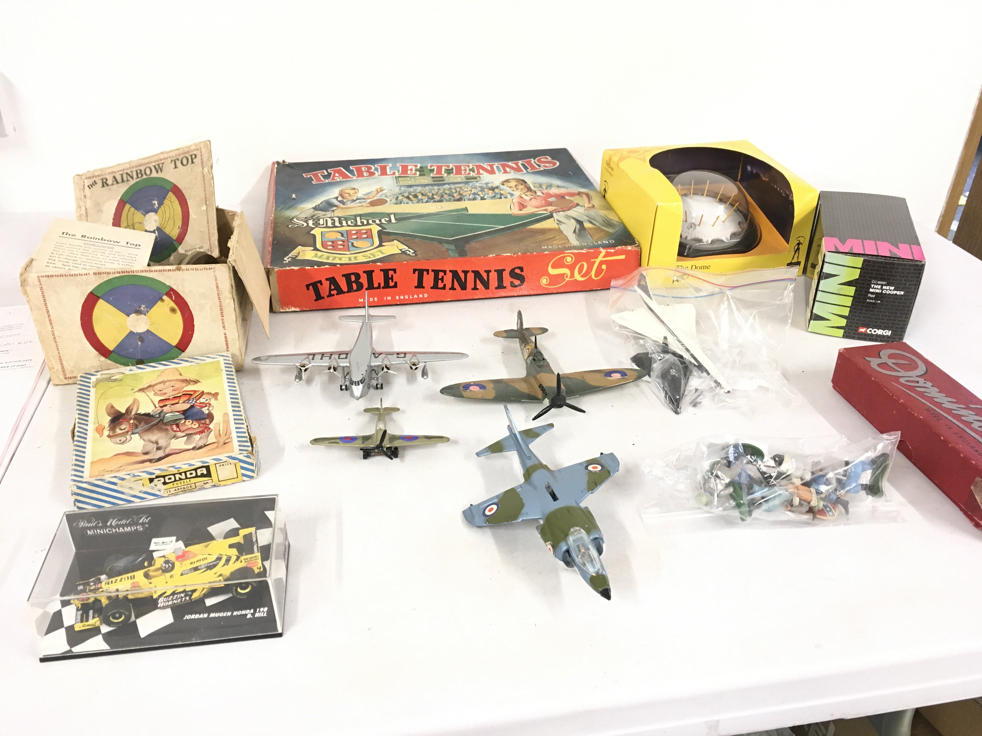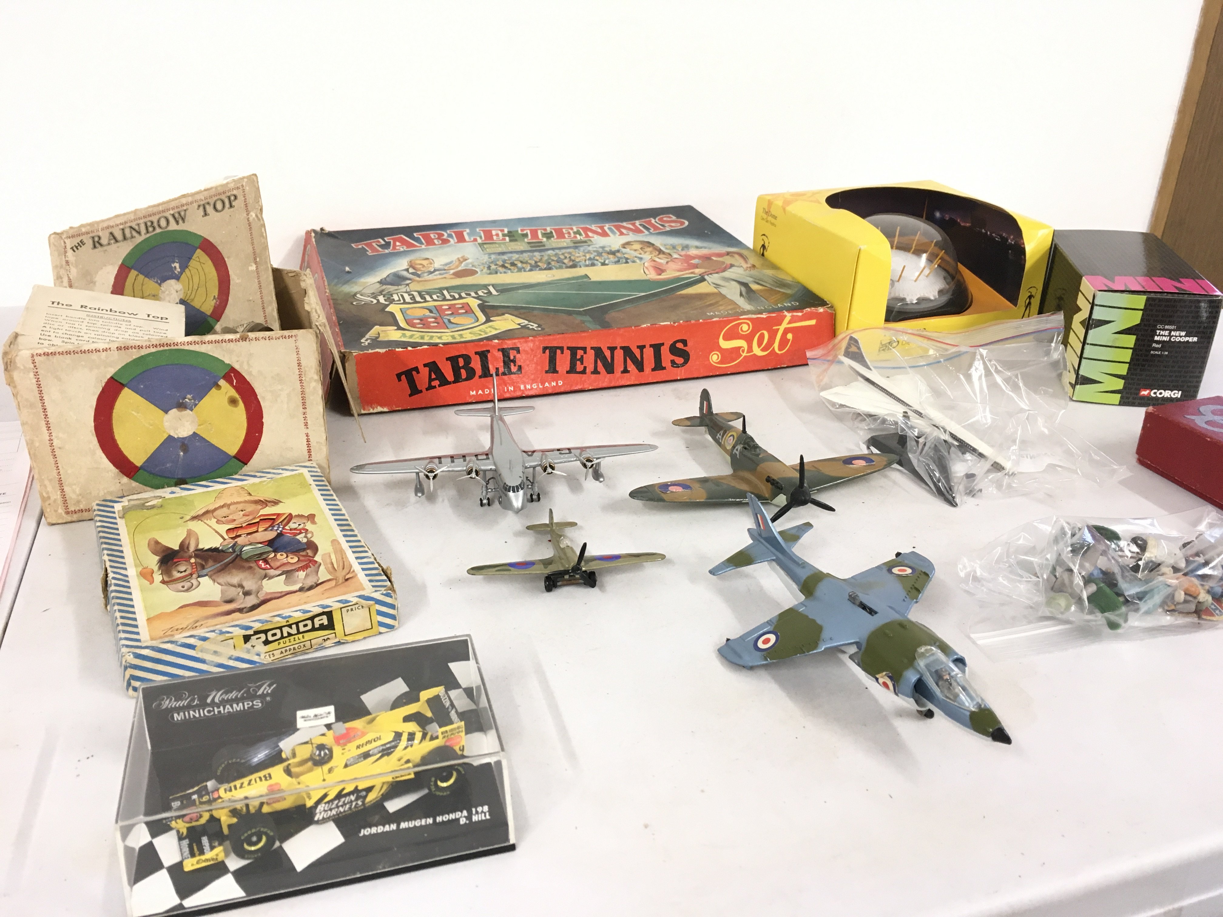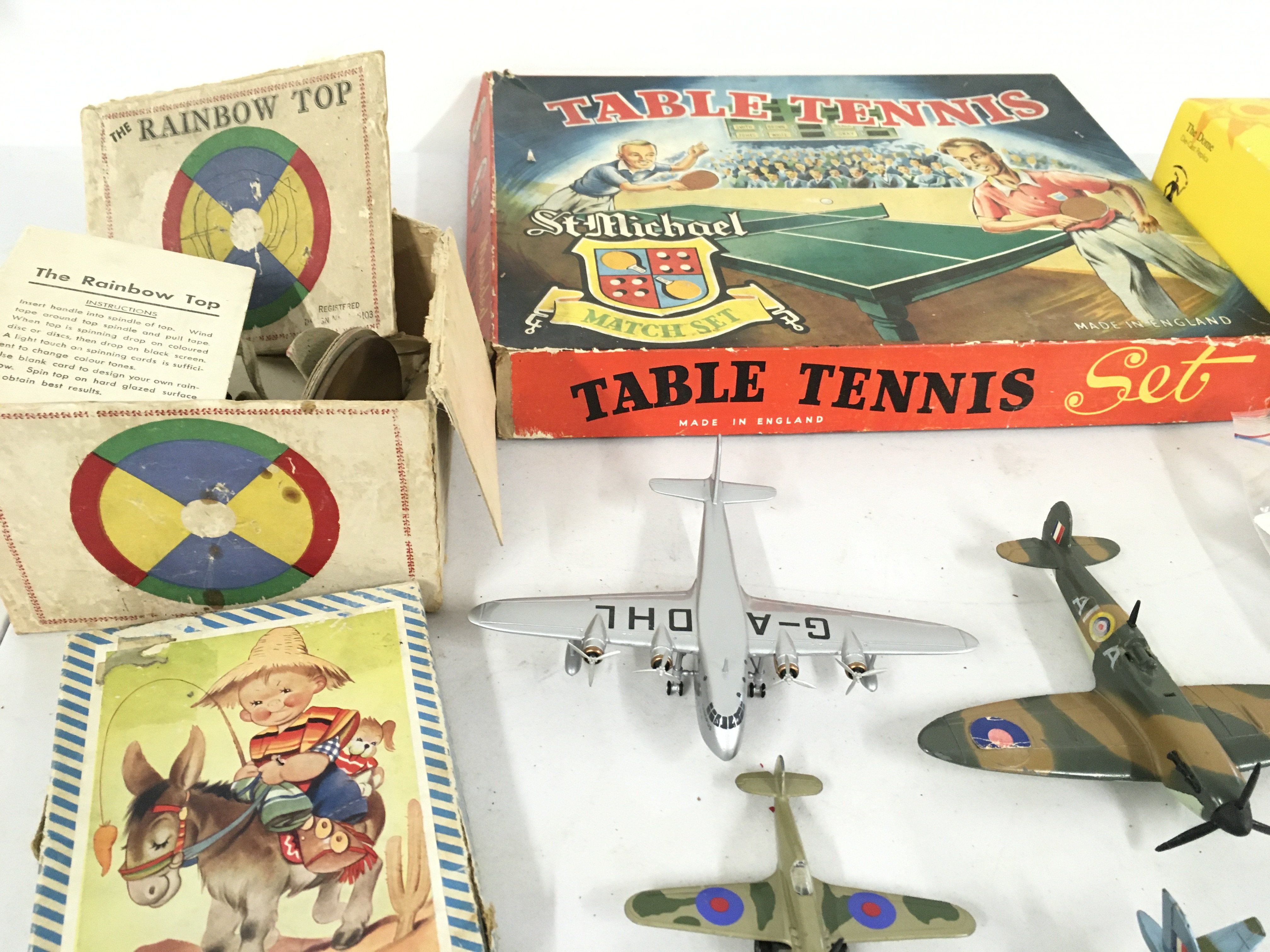 A collection of assorted toys including Table Tennis..Dominoes..puzzle..vintage Rainbow Top. Also includes diecast model planes by Dinky and others..cars and Millenium Dome. Plus Britains figures. 1930s shove Penny Board No reserve
