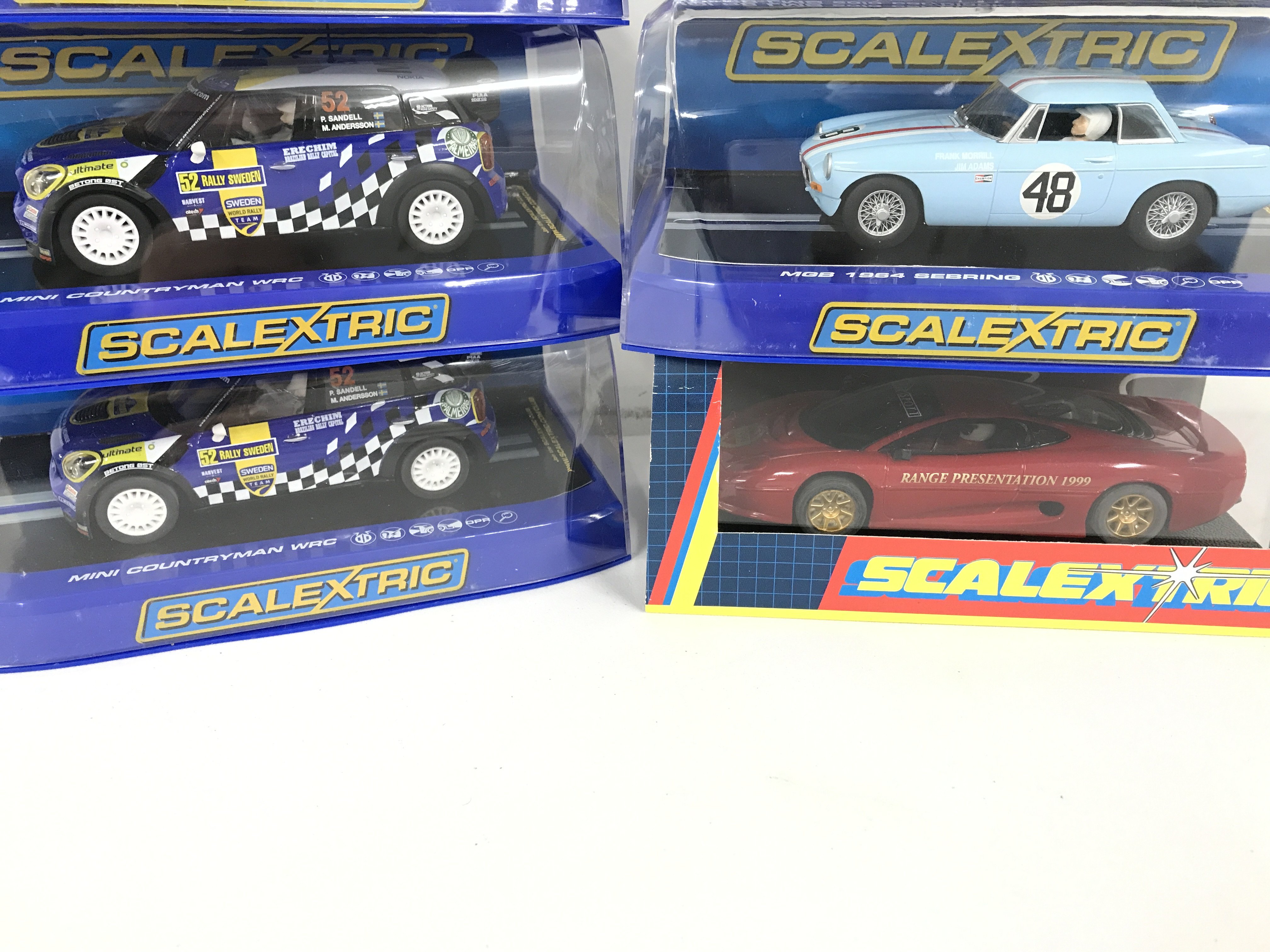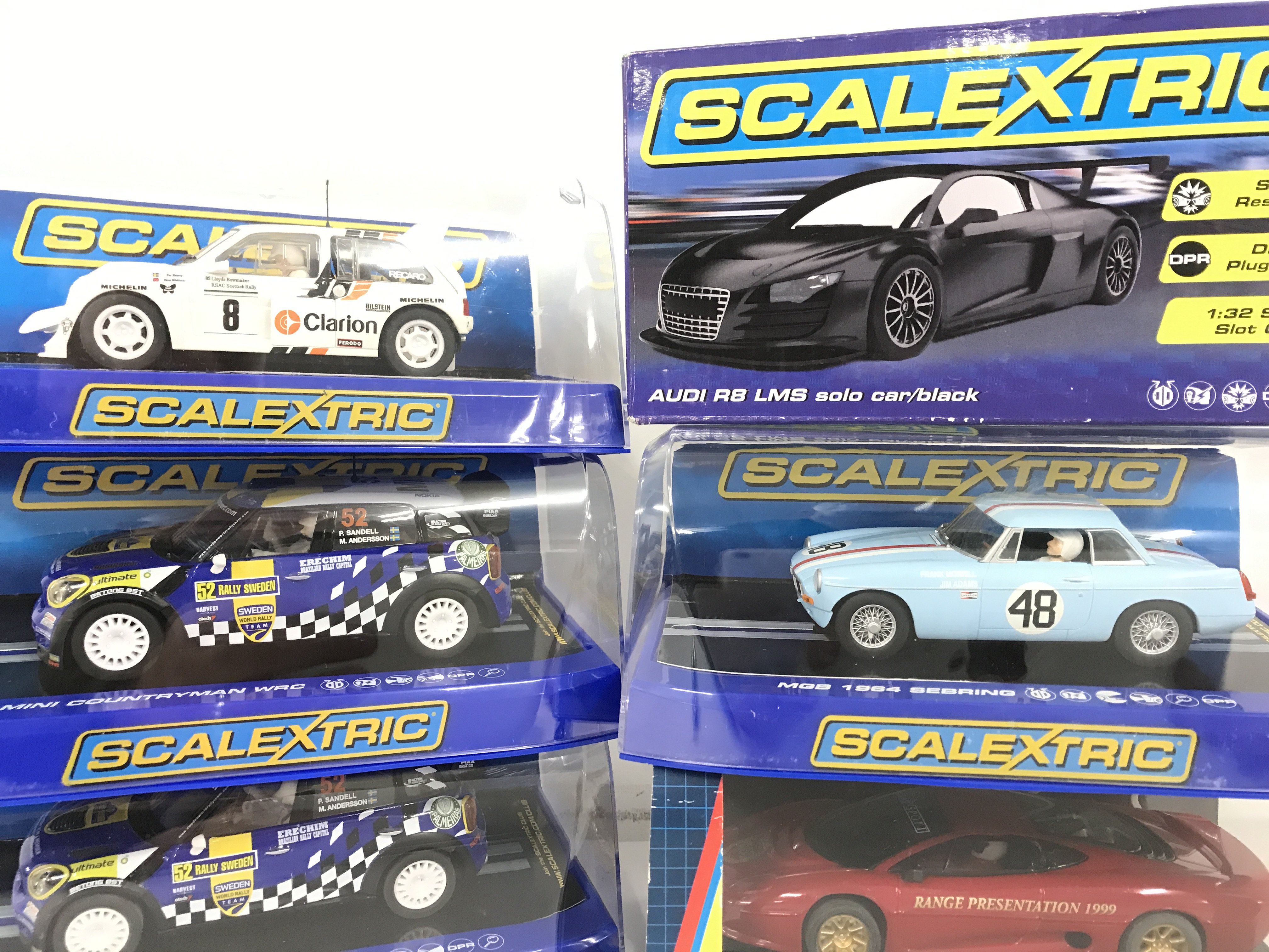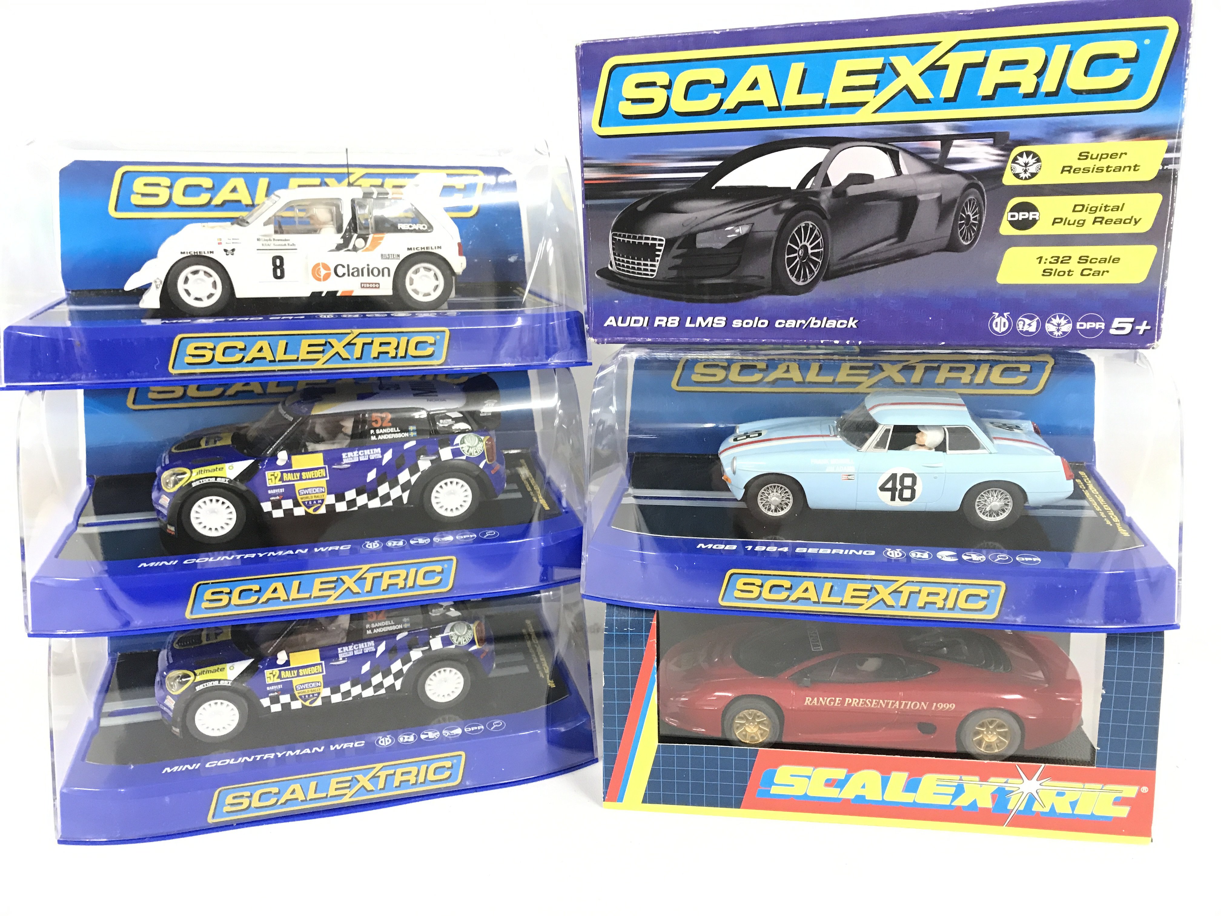 6 X Boxed Scalextric Cars. A MG Metro 6R4. 2 X Mini Countryman WRC. A Audi R8 LMS Solo Car. A MGB 1964 Searing and a Jaguar XJ220.