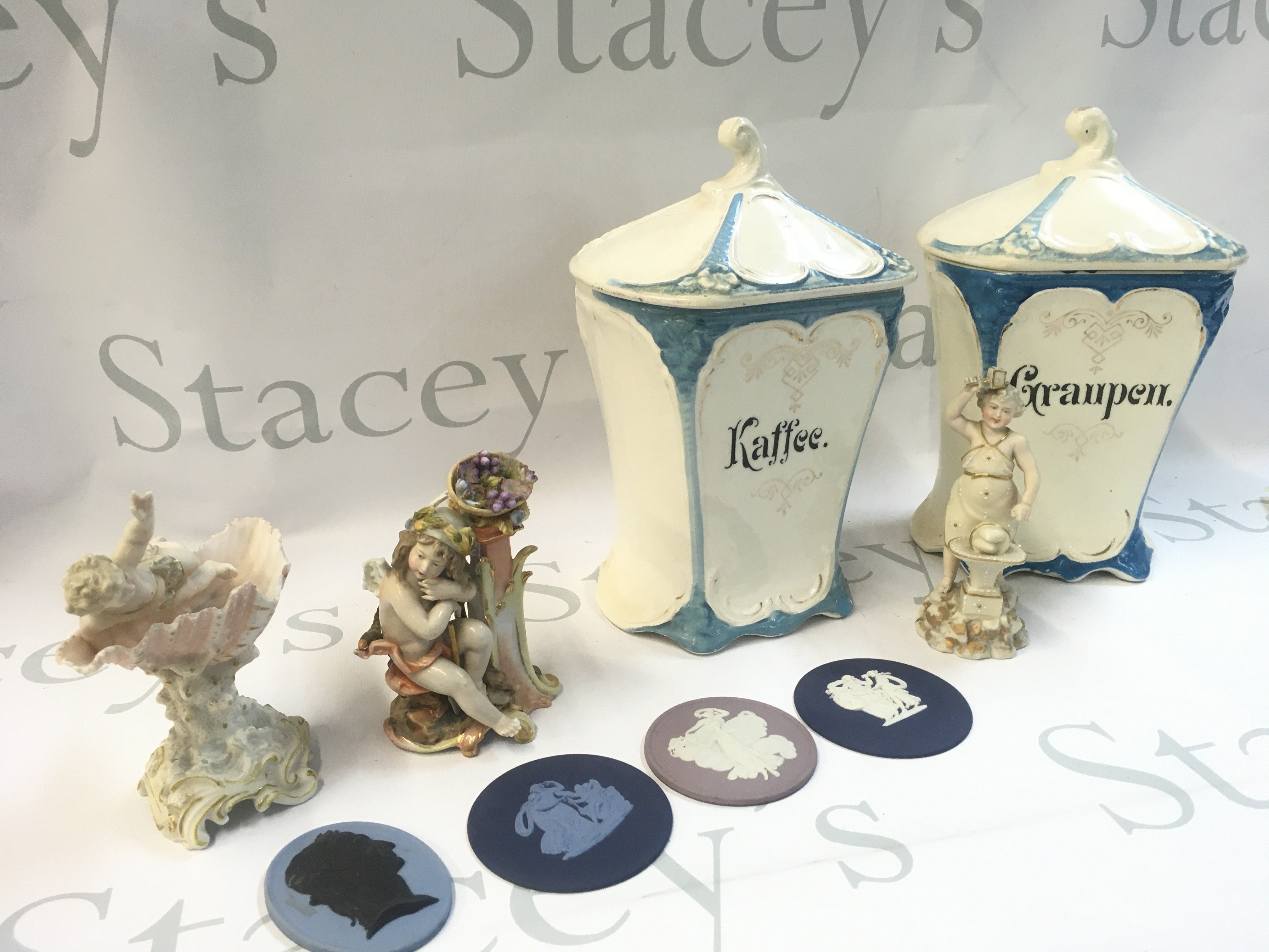 Porcelain coffee jars, German classical style porcelain figures and Wedgwood oval miniature panels.