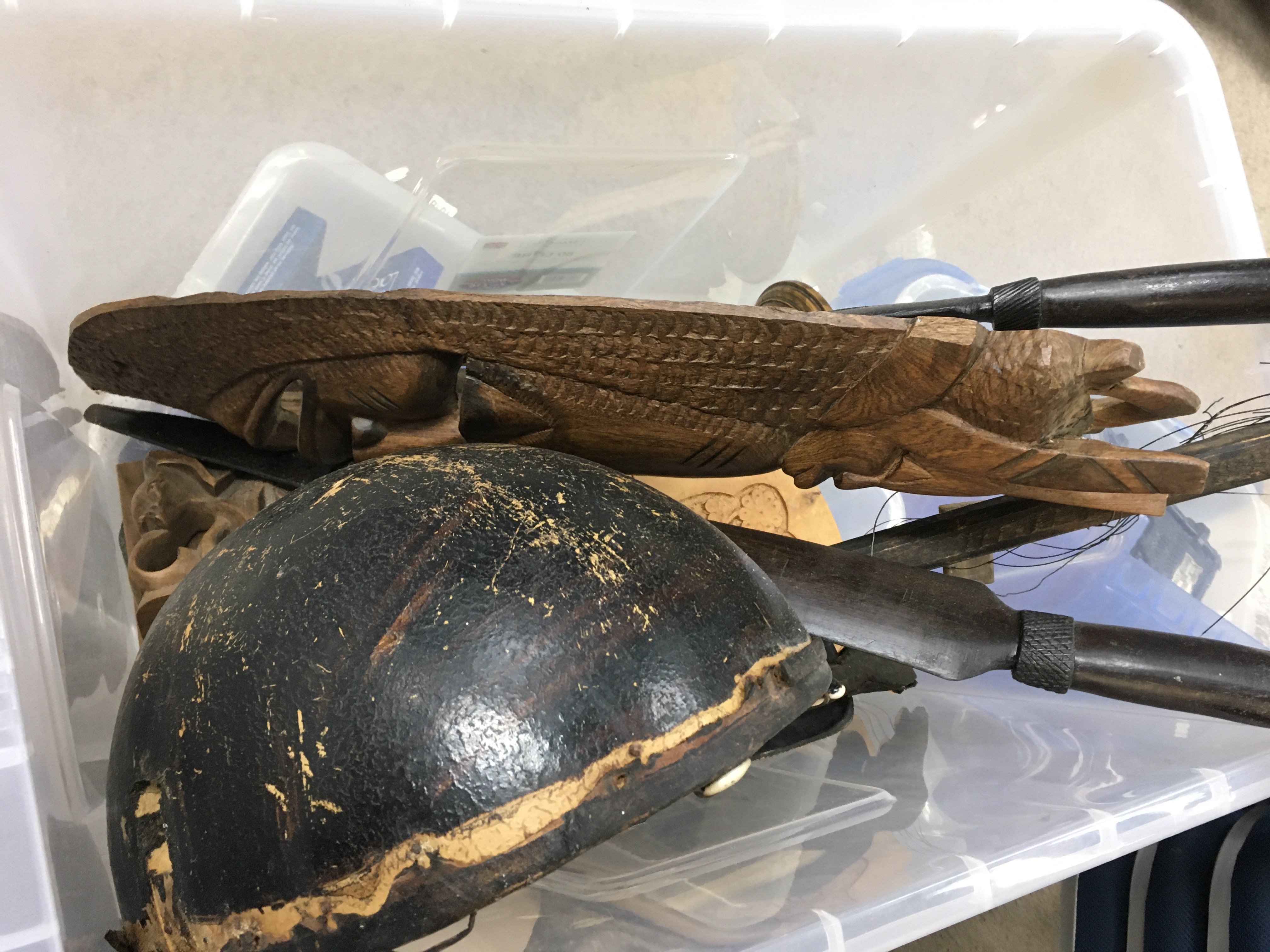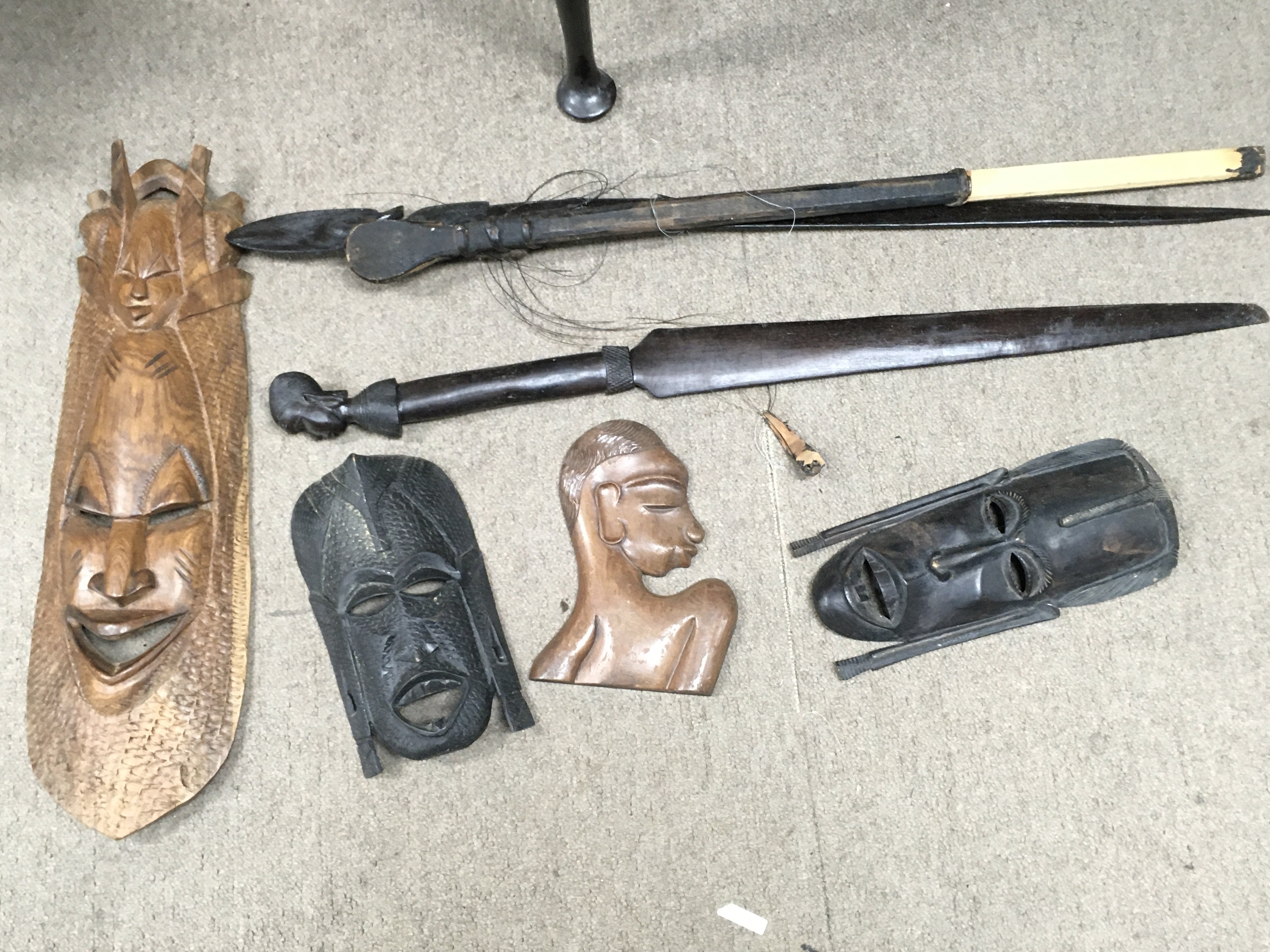 A Collection of African wooden masks, spears etc