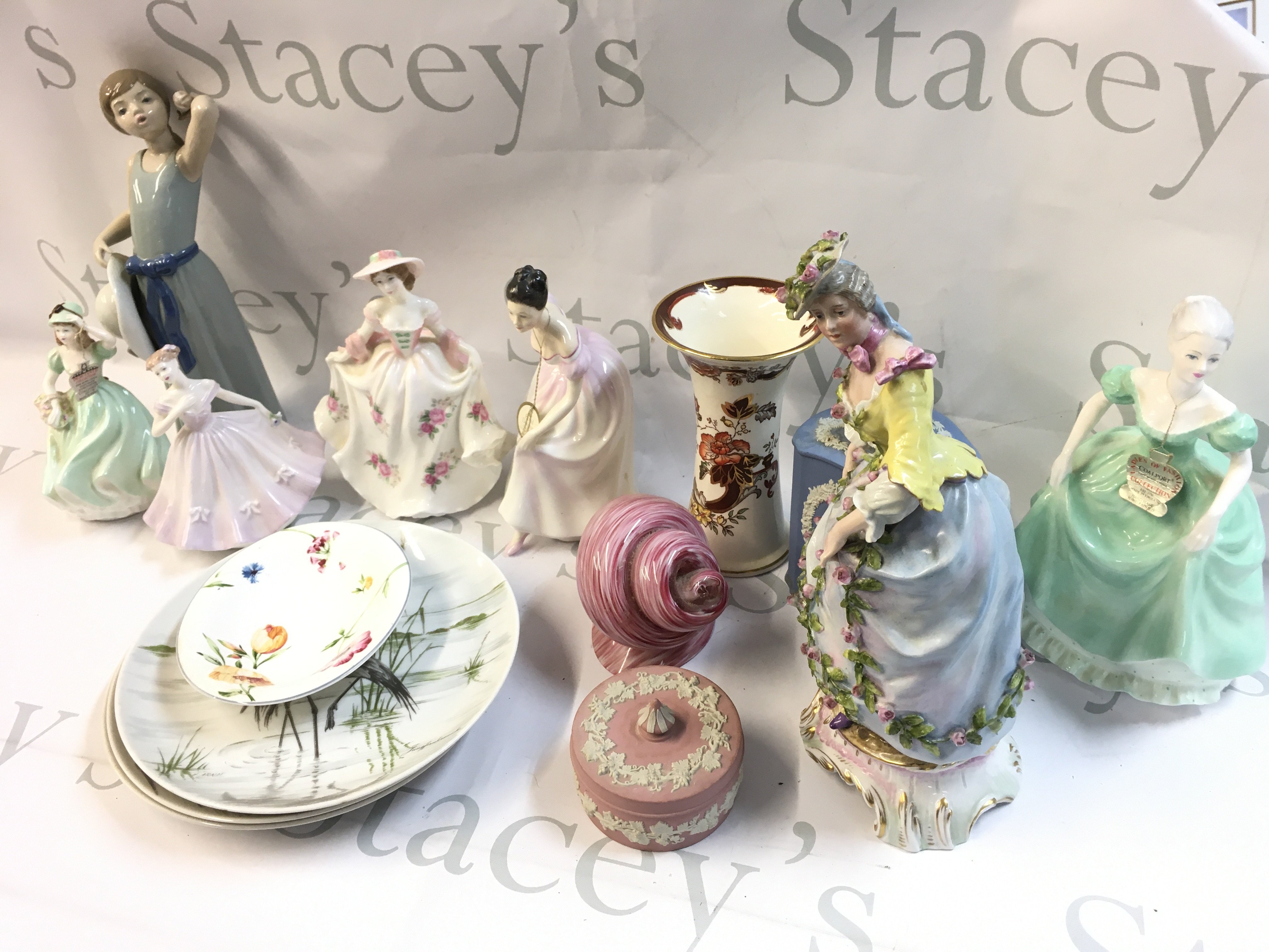 A Collection of porcelain figures including a German figure, Royal Doulton, Lladro, Wedgewood vase and container