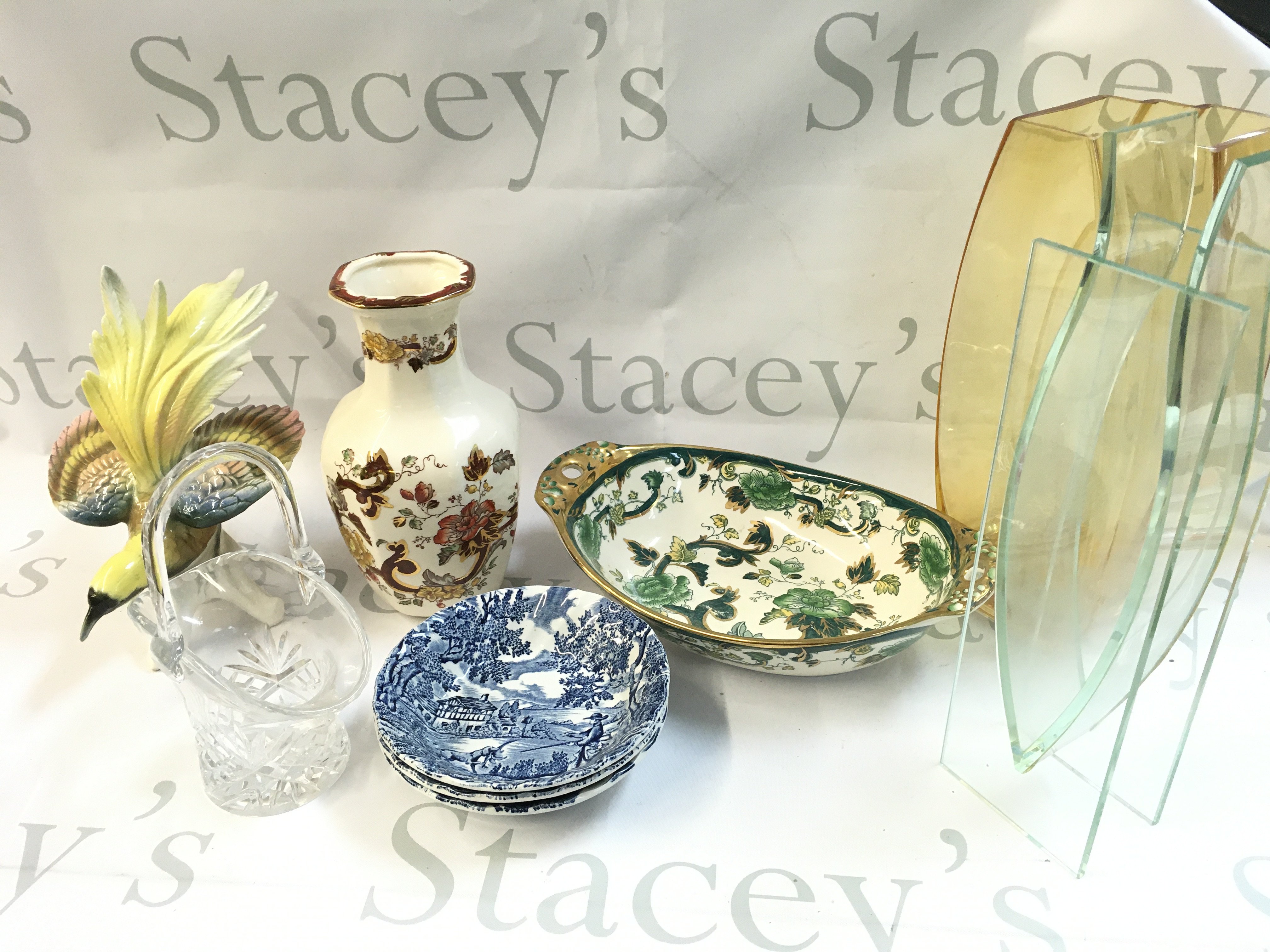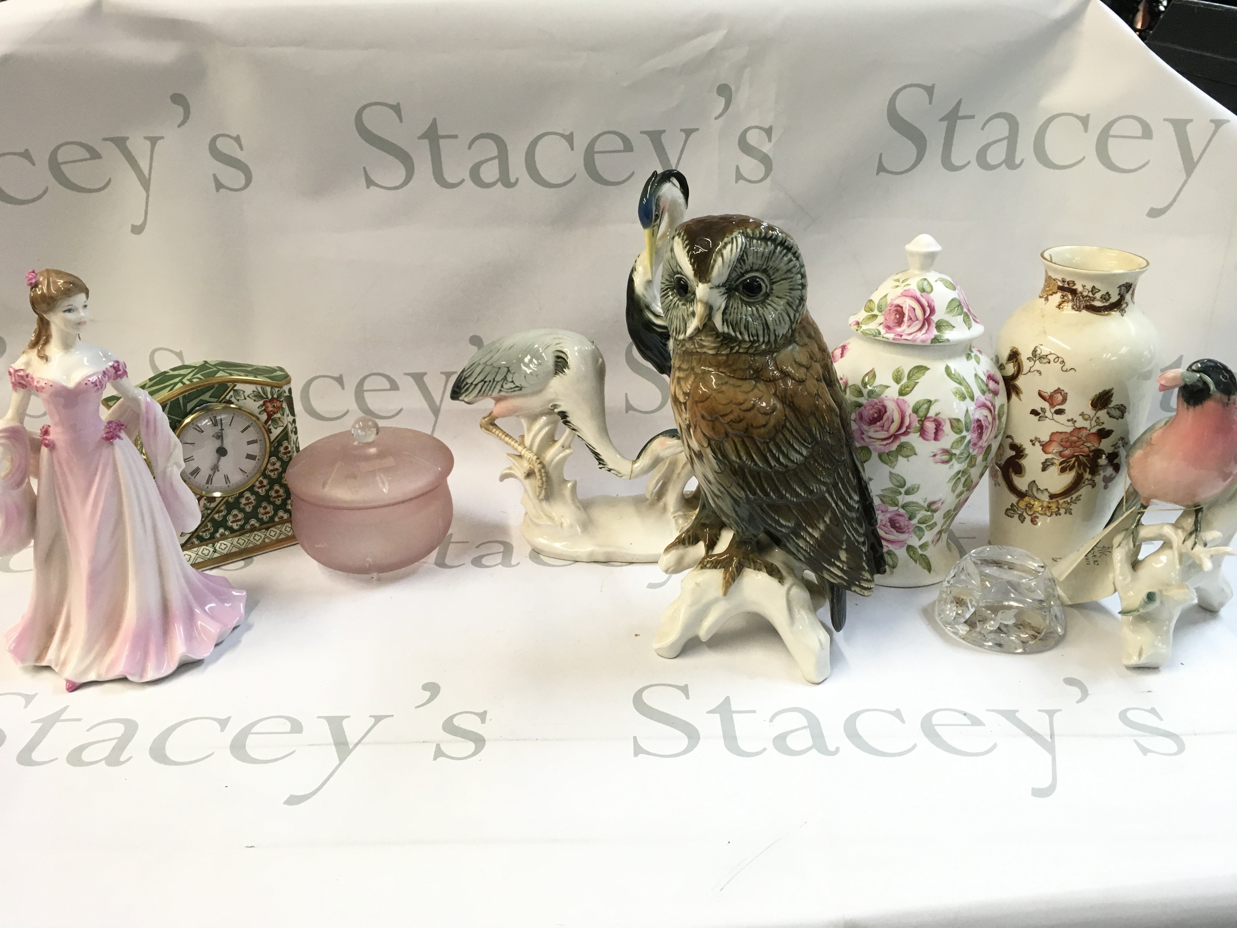 A box of ceramics including Royal Worcester Grace figure, Queens China and Masons vase,