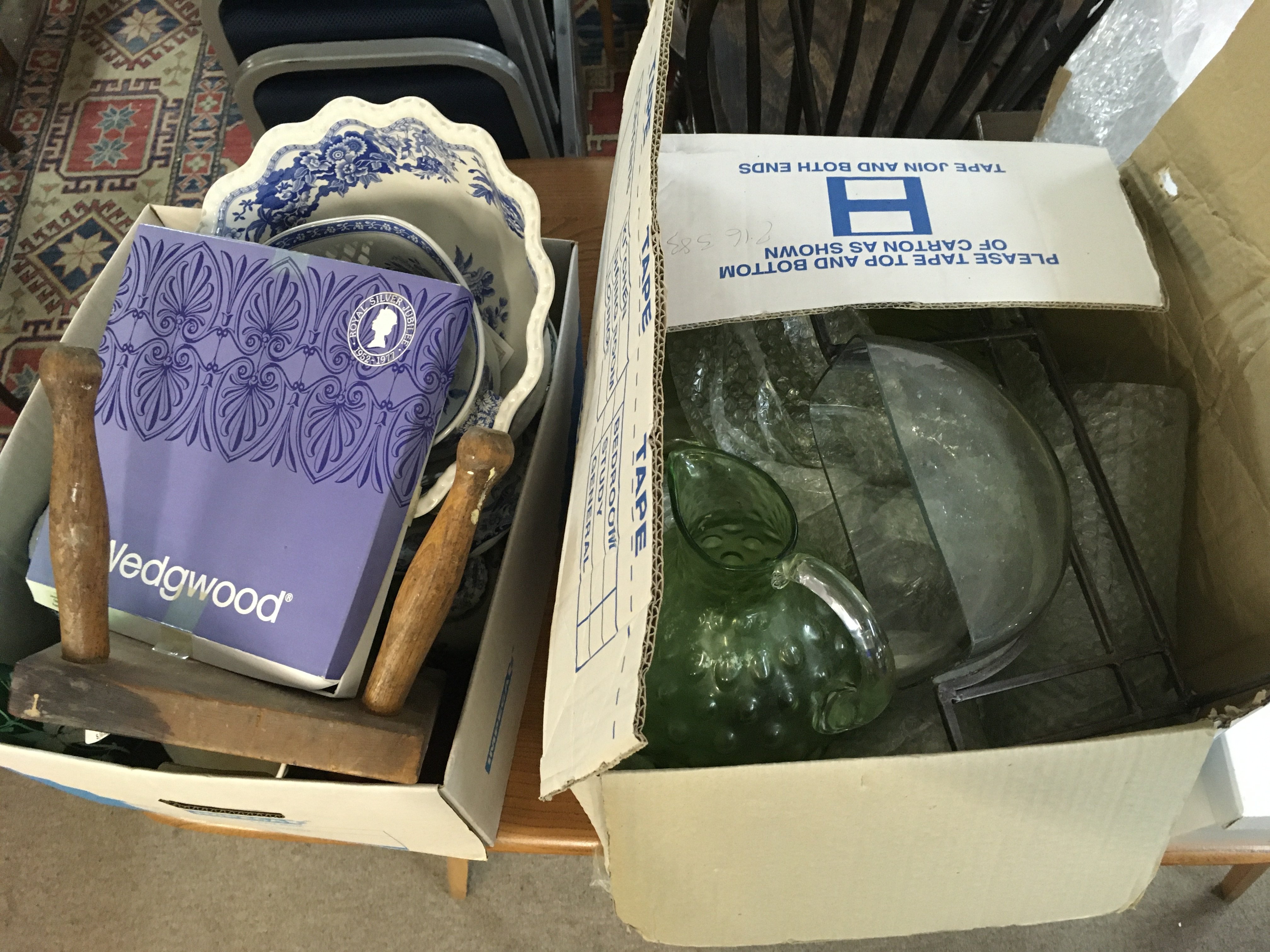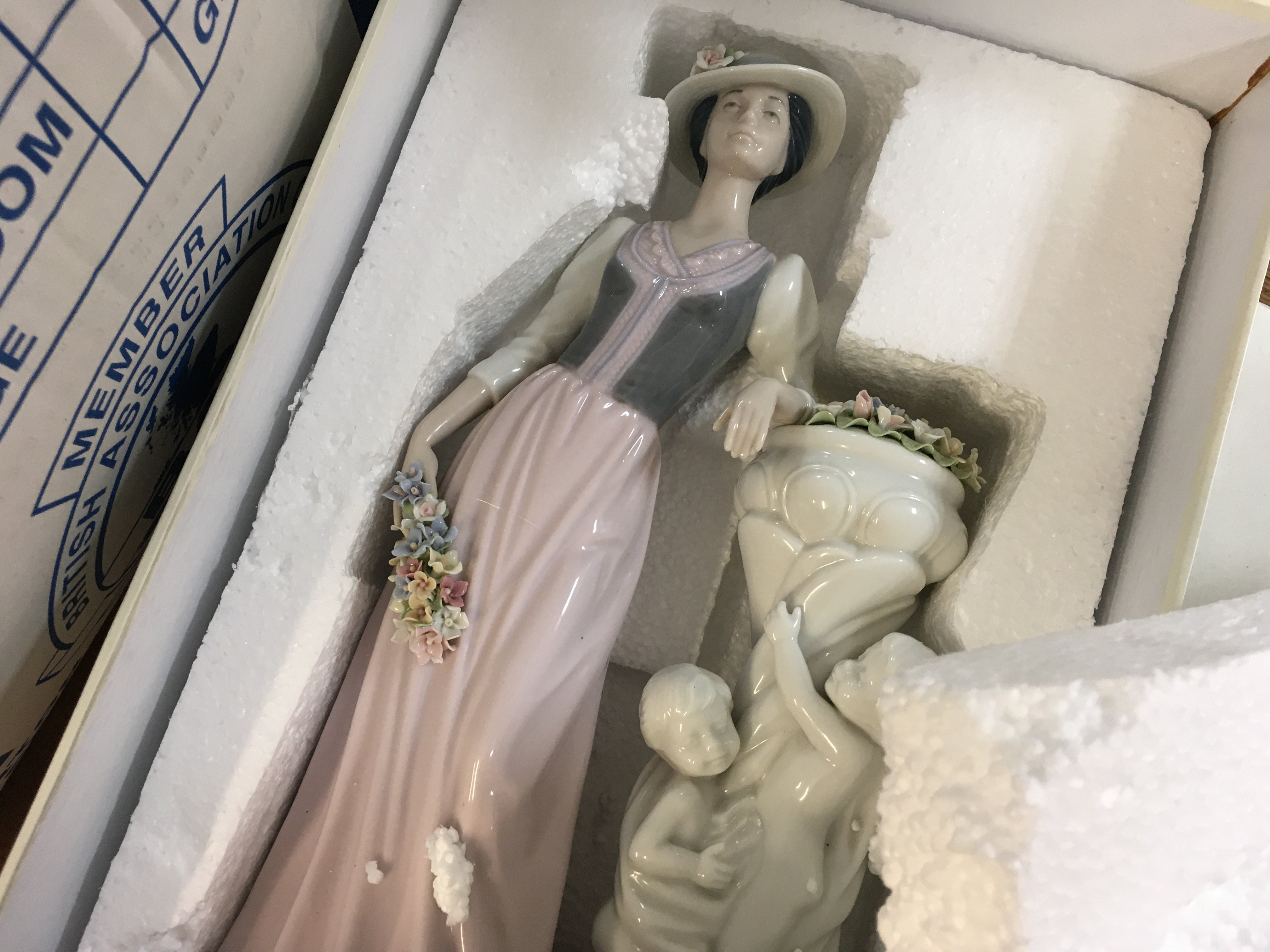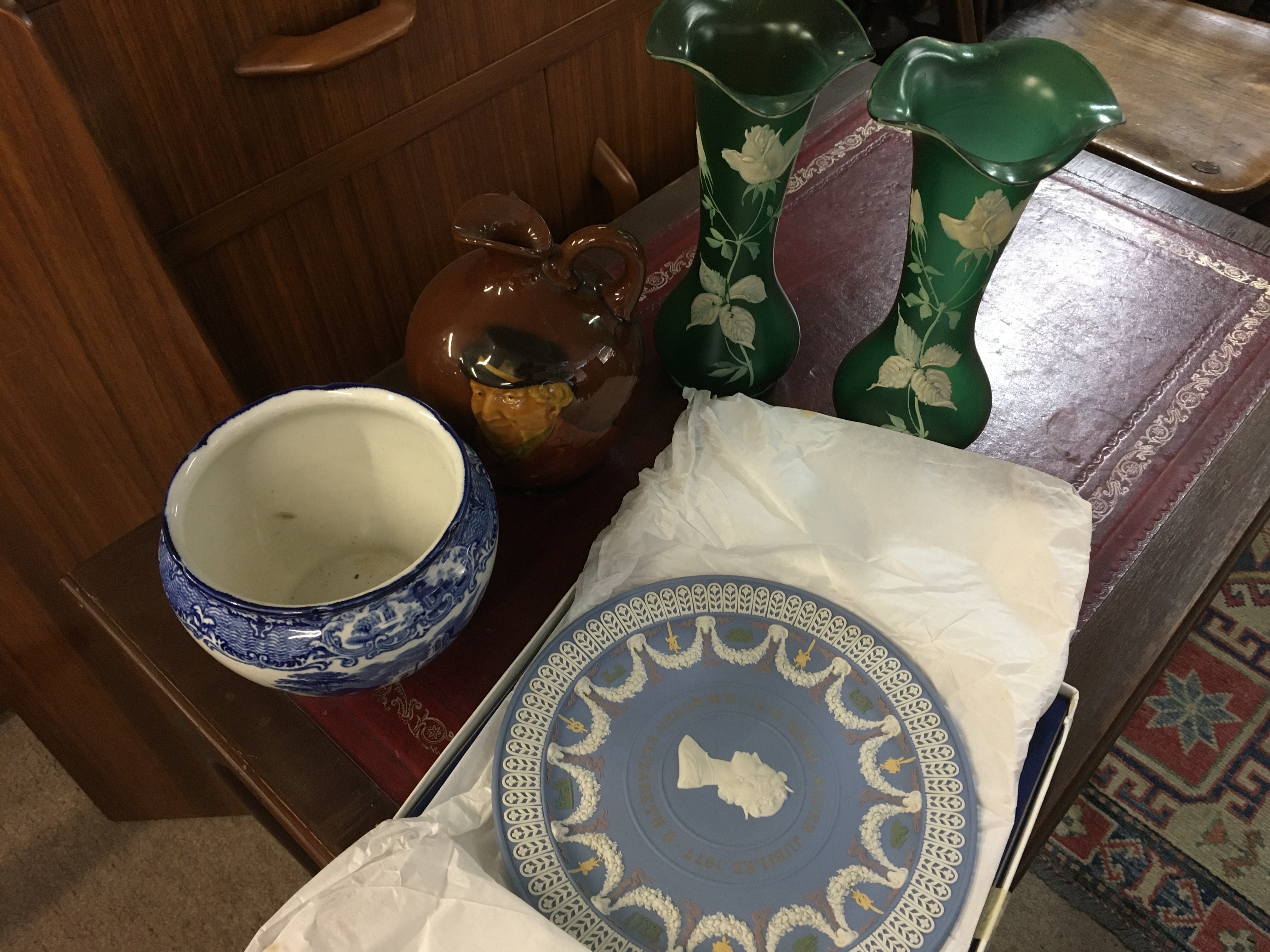 A collection of ceramics including a boxed Nadal figure, boxed Wedgwood plate, Doulton vase, green coloured art glass vases etc