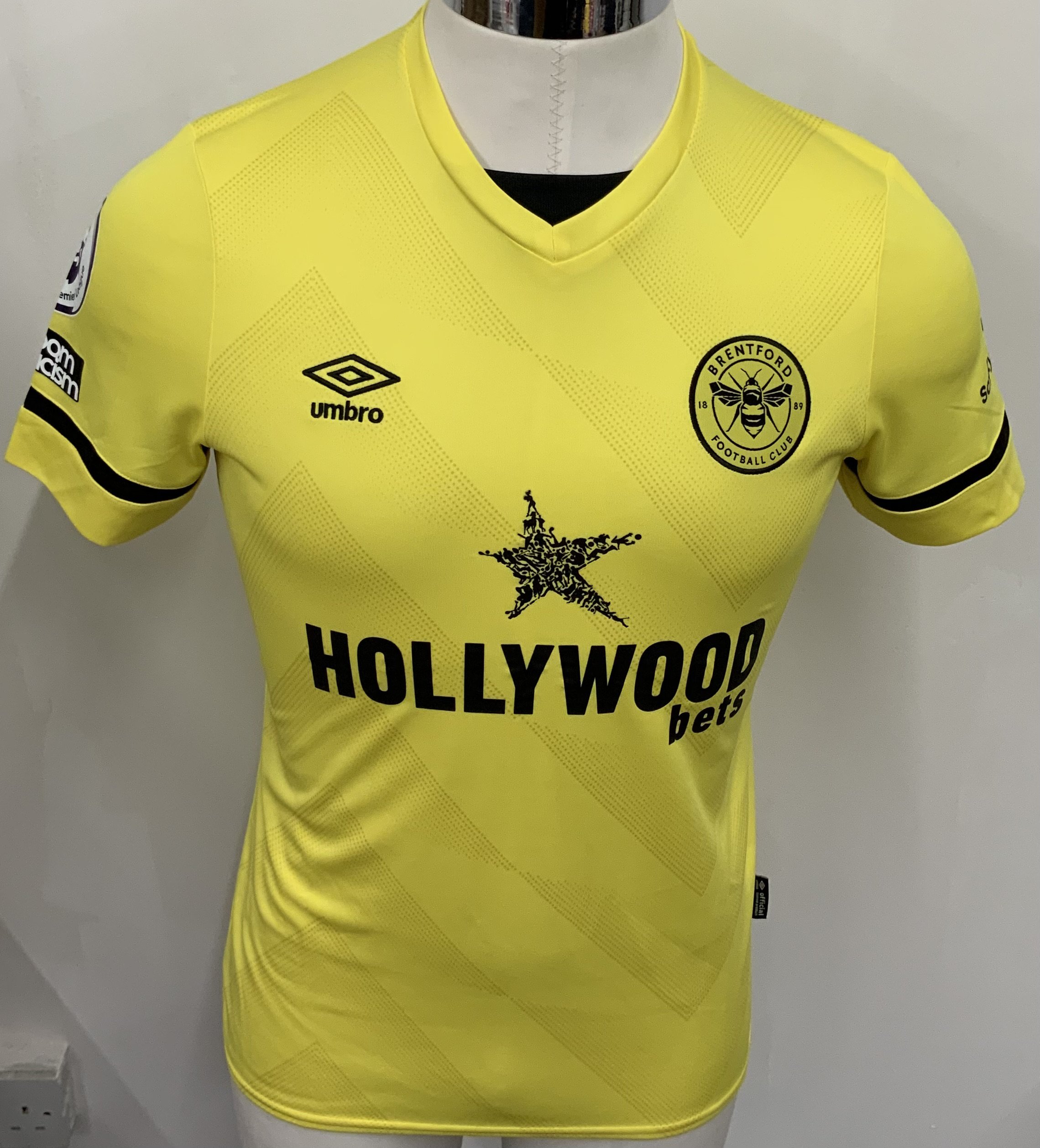 Brentford 2021 - 2022 Match Worn Football Shirt: Yellow away short sleeve shirt with Premier League badging to sleeves. Roerslev 30 to rear. Worn v Tottenham on 2 December 2021.
