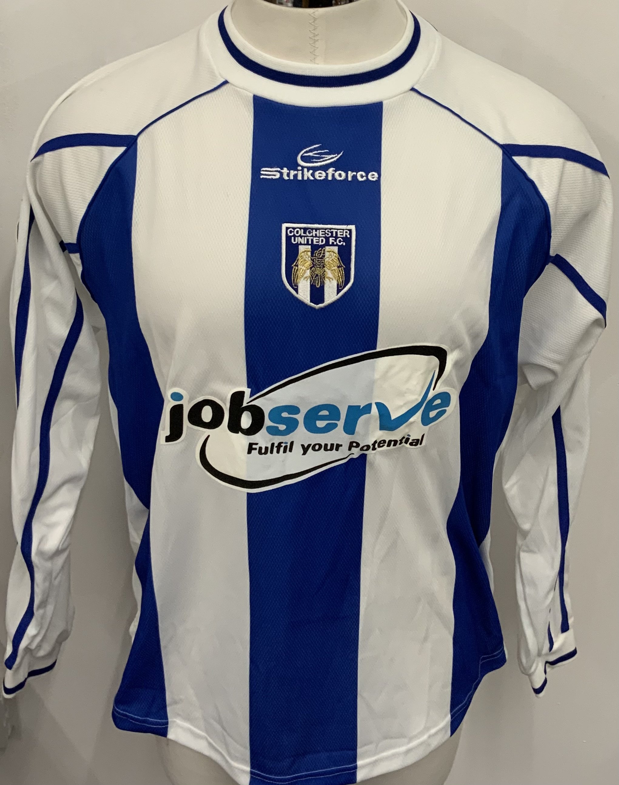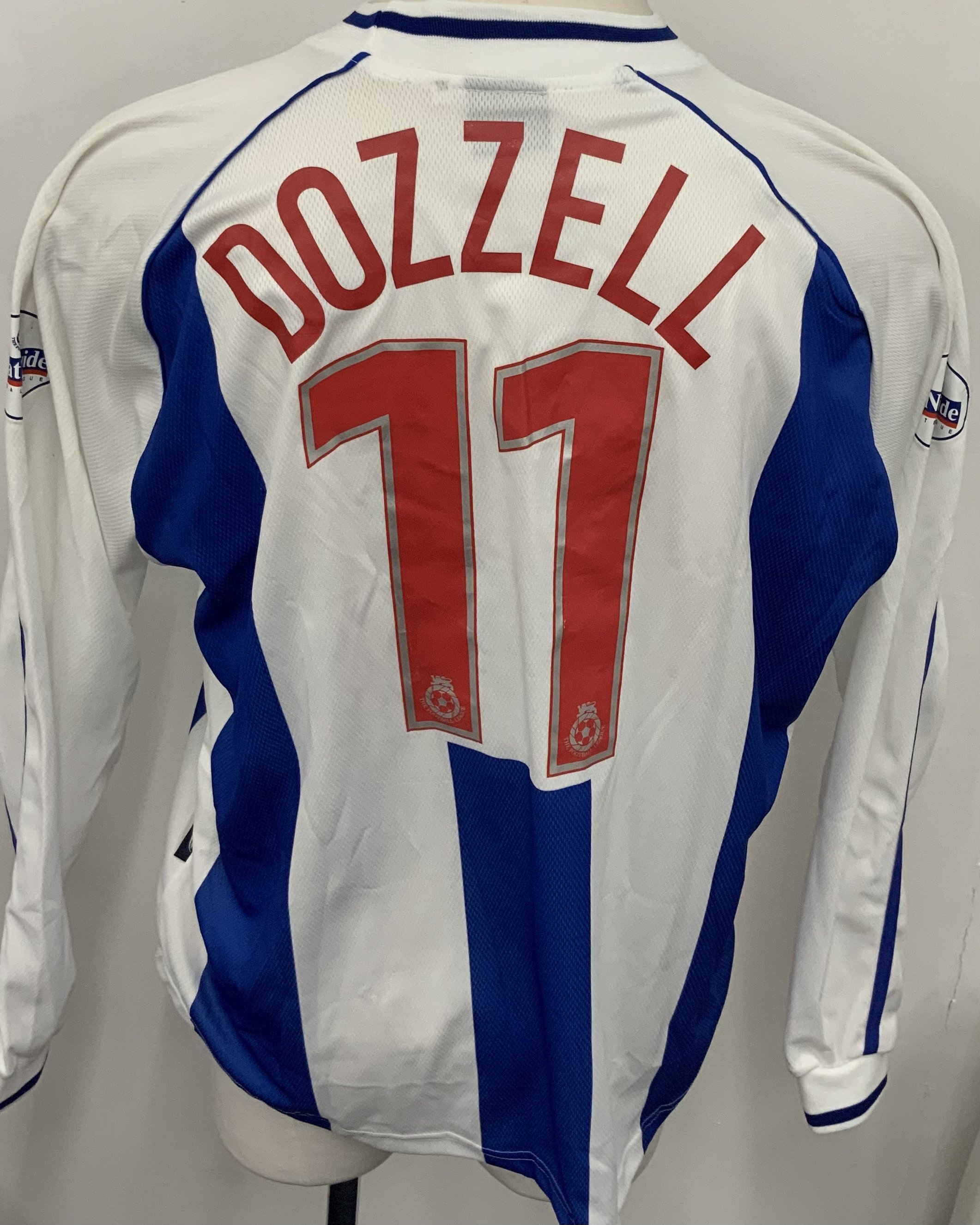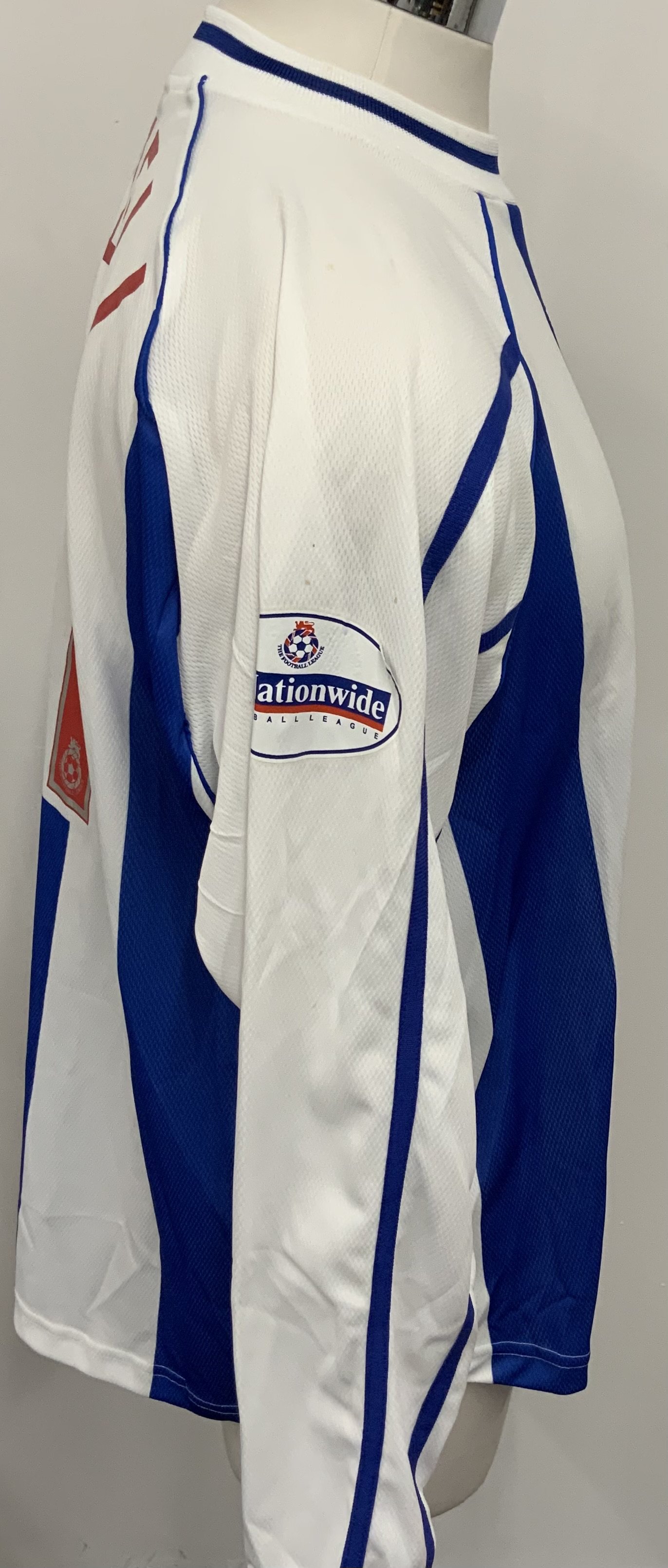 Colchester United 2001 - 2002 Match Worn Football Shirt: Blue and white long sleeve shirt with Nationwide League badging to sleeves. Dozzell 11 to rear.