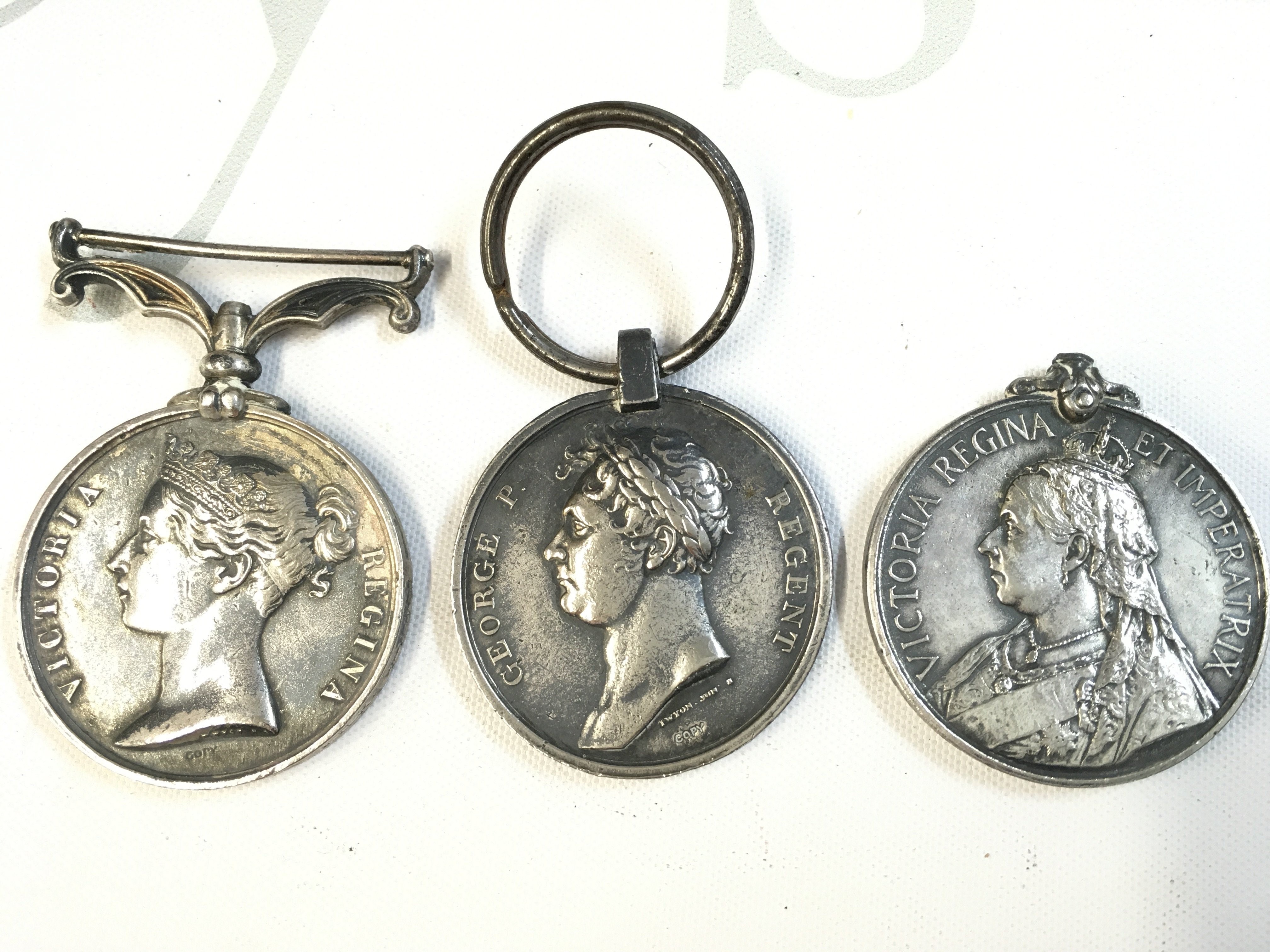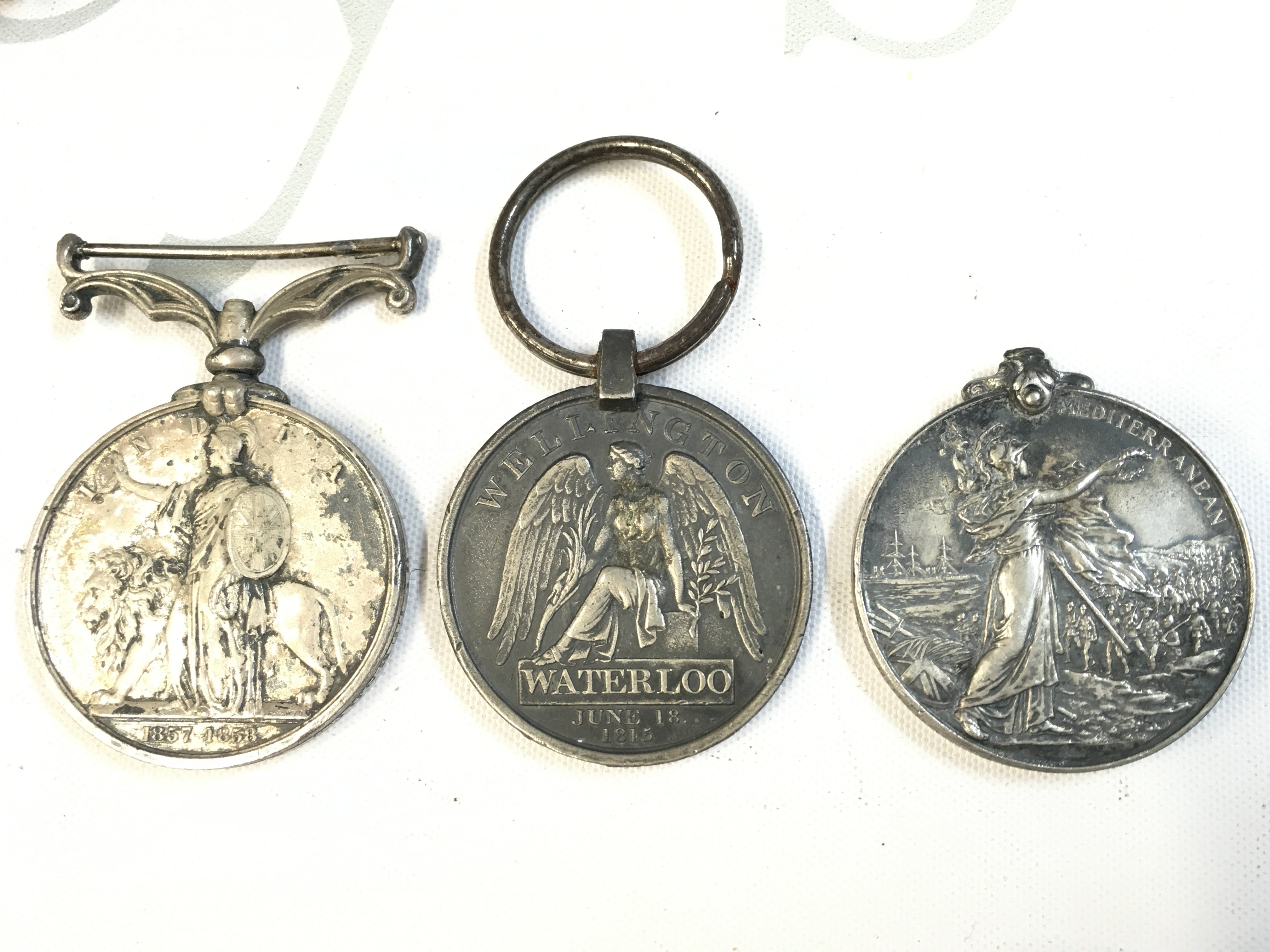 Retrospective Copies of British War Medals including the Queens Mediterranean medal presented to 3854 Pte.G.W.Winds North D Fus, Waterloo medal, Victorian India 1857-1858 medal