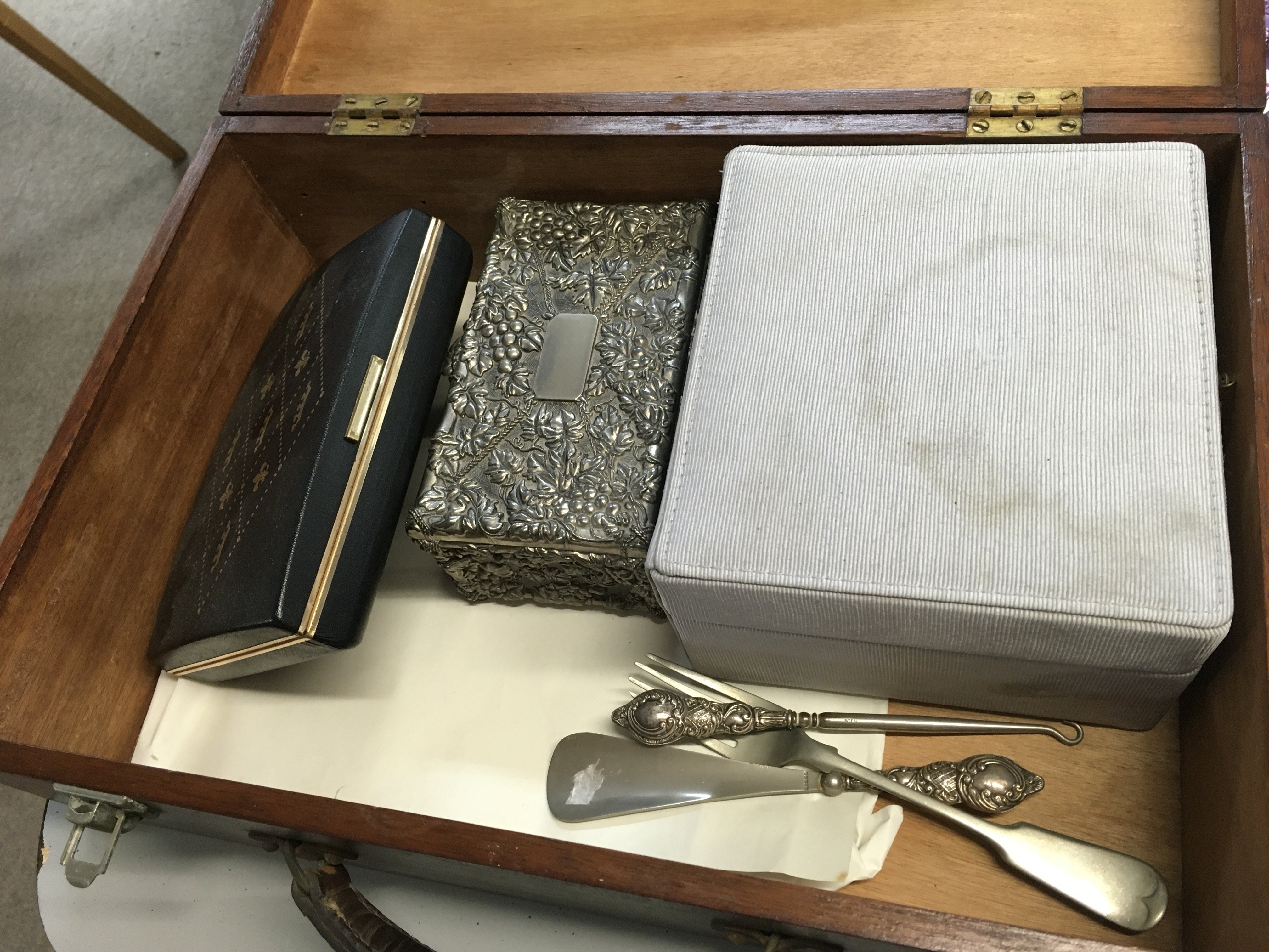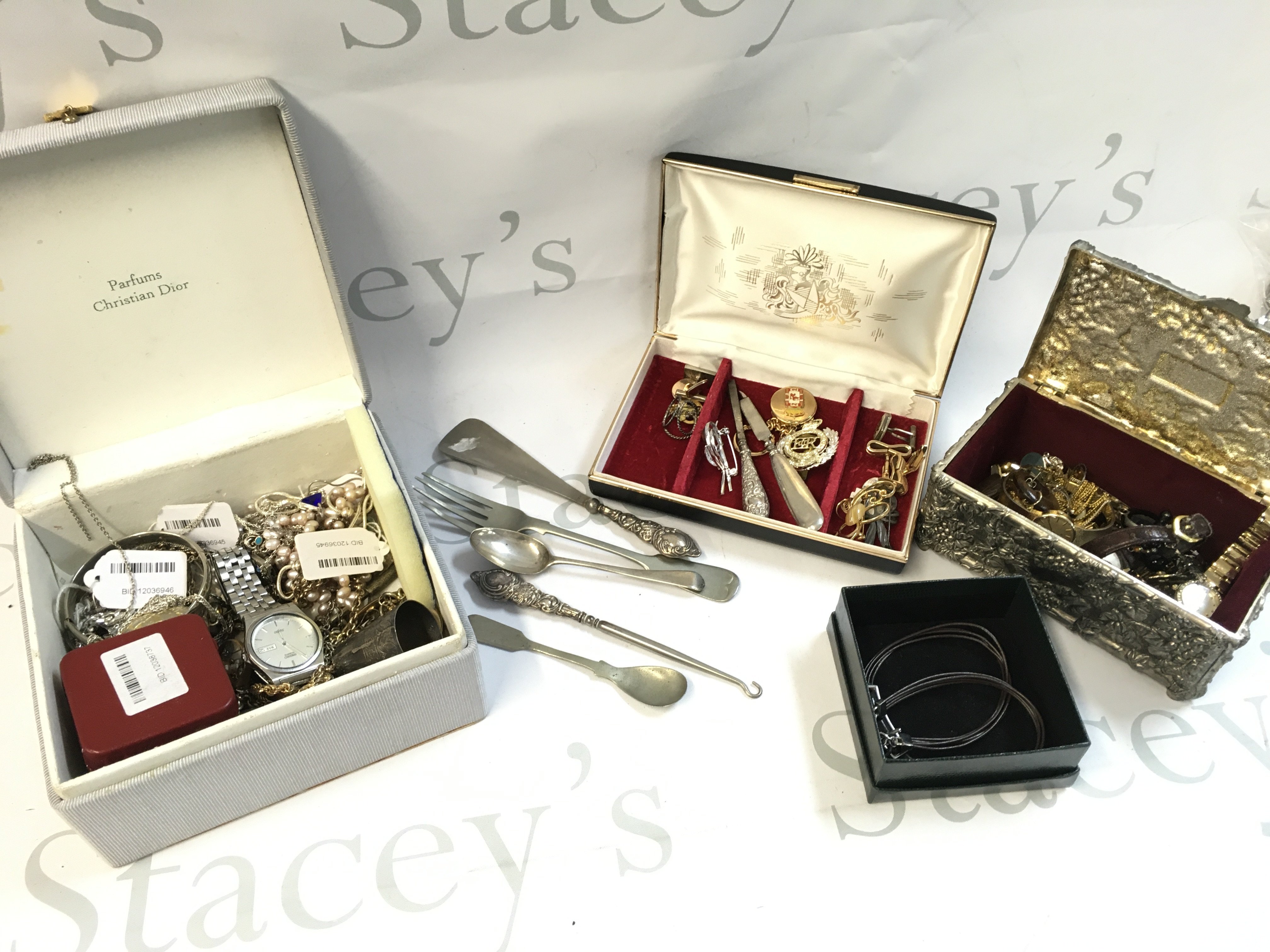 A Collection of costume jewellery including some silver handled instruments, silver necklaces etc, Ralph Lauren boxed necklace, 9 ct gold earrings, watches etc