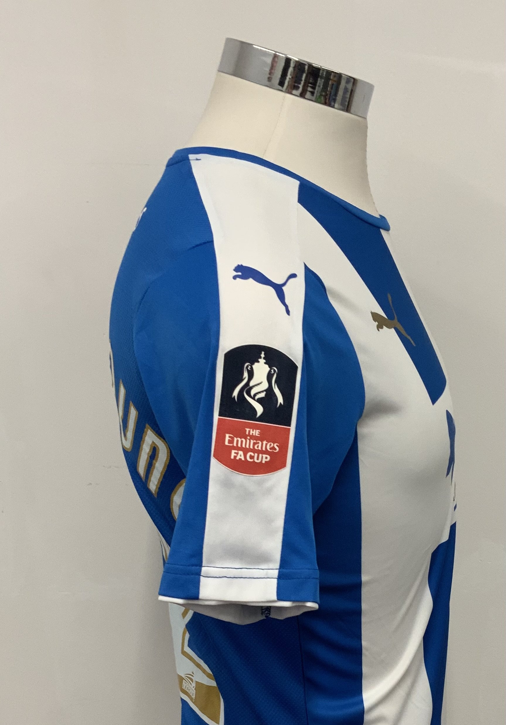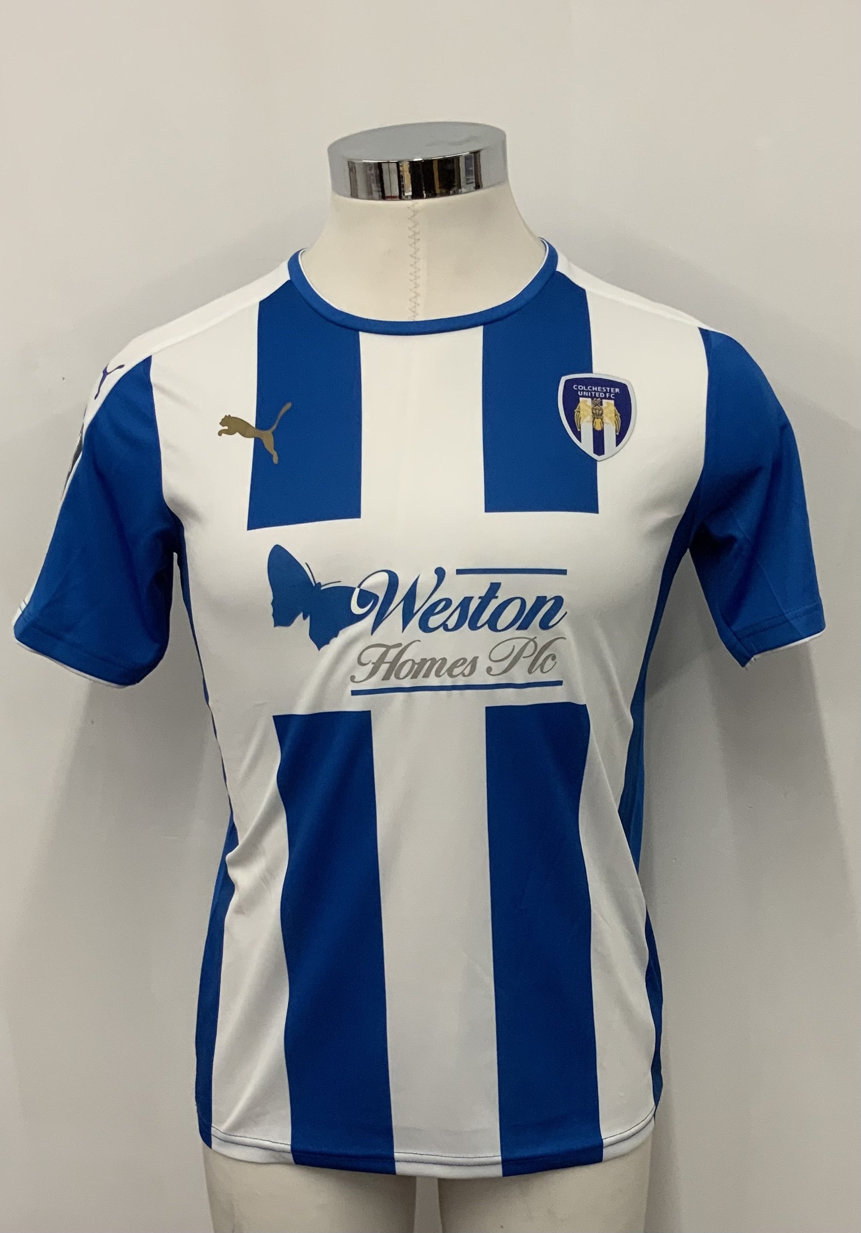 Colchester United 2015 - 2016 Match Worn Football Shirt: Blue and white short sleeve shirt with FA Cup badging to sleeves. Vincent-Young 22 to rear. Worn v Tottenham on 30 January 2016. Played the full 90 minutes.