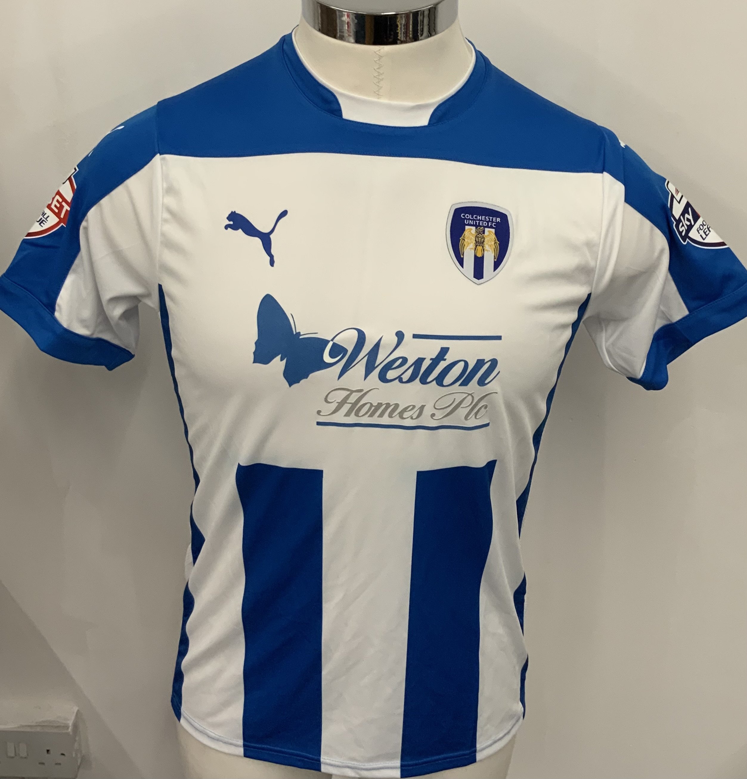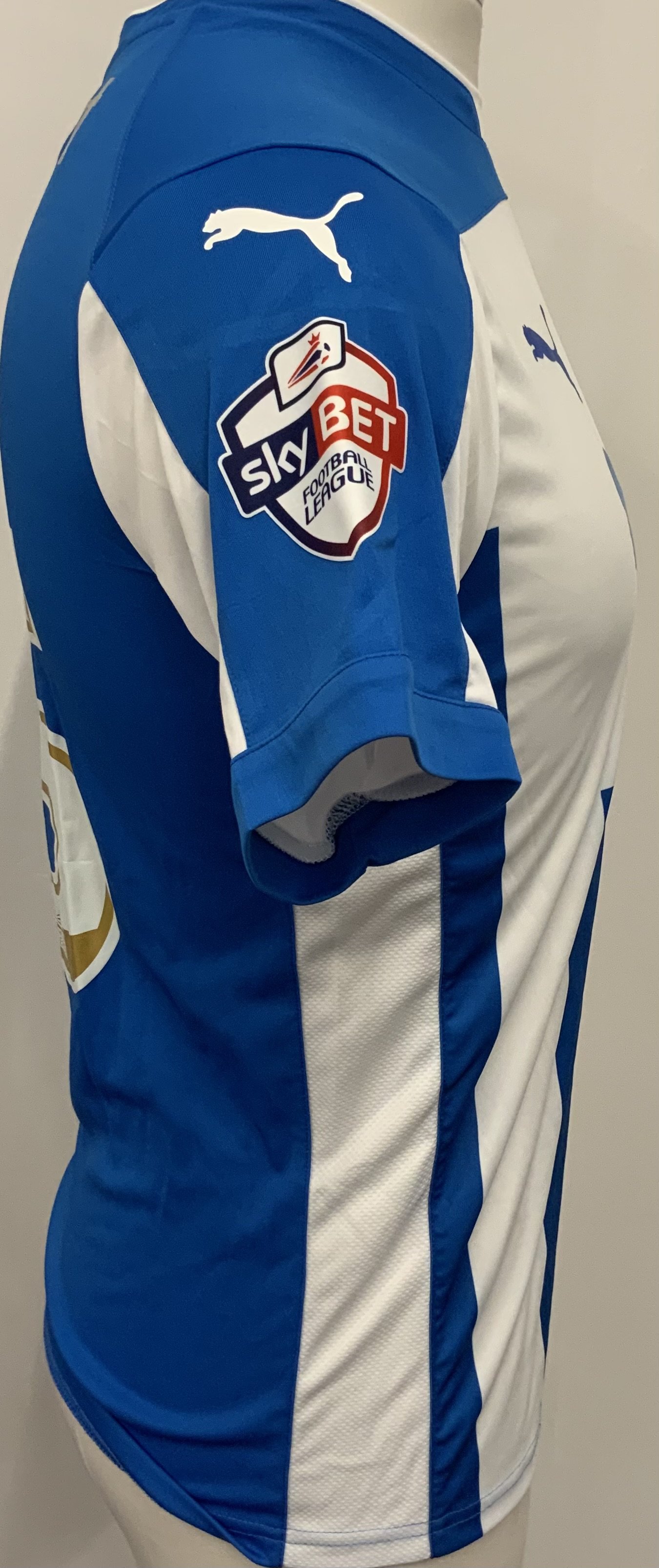 Colchester United 2014 - 2015 Match Worn Football Shirt: Blue and white short sleeve shirt with Sky Bet badging to sleeves. Bean 15 to rear.