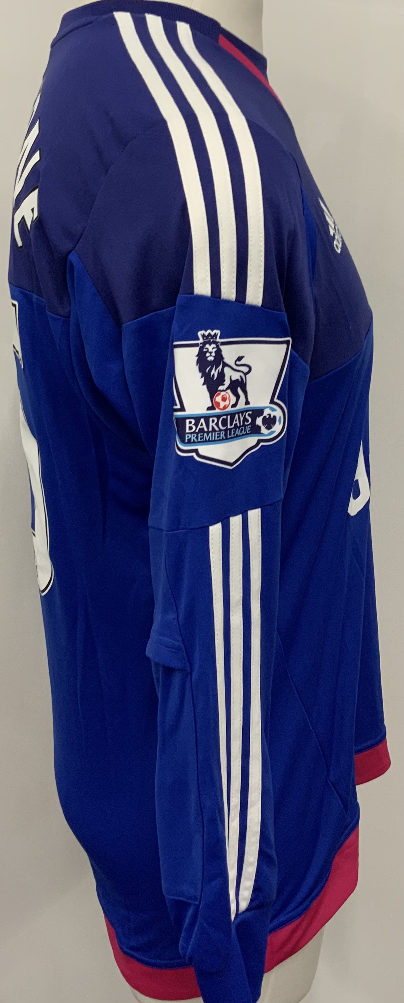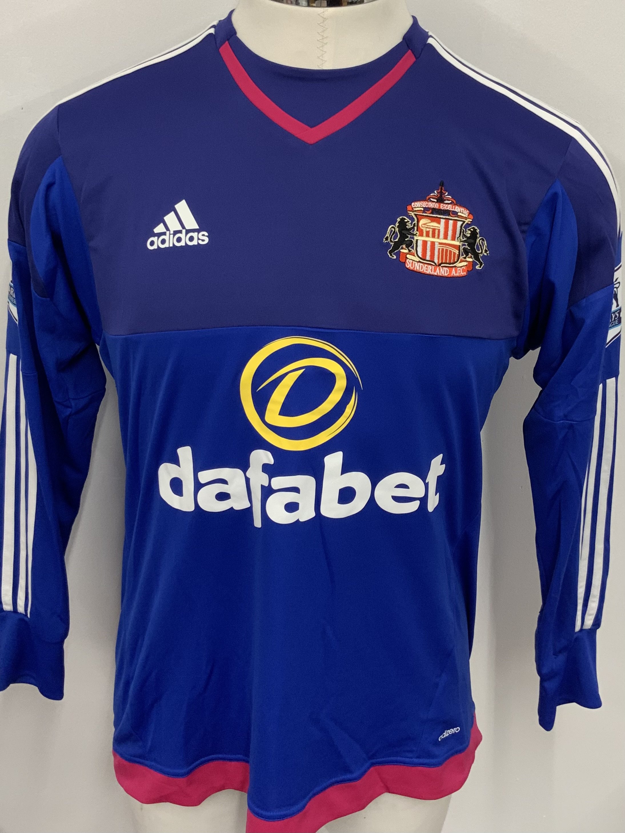 Sunderland 2015 - 2016 Match Worn Football Shirt: Blue long sleeve goalkeepers shirt with Premier League badging to sleeves. Mannone 25 to rear. Worn v Arsenal on 24 April 2016. Match finished 0-0.