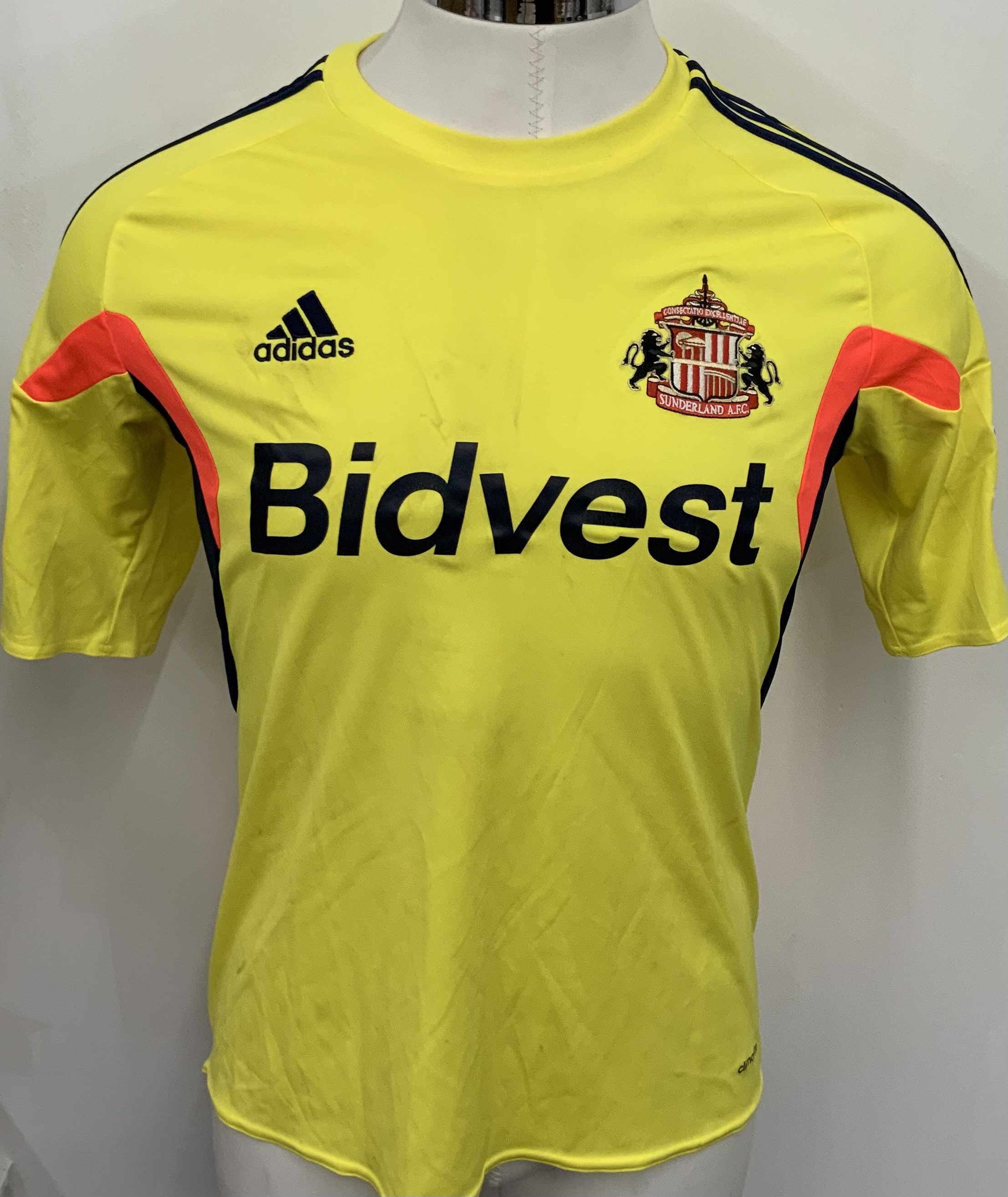 Sunderland 2013 - 2014 Match Worn Football Shirt: Yellow short sleeve shirt with Premier League badging to sleeves. Colback 14 to rear. Shirt is unwashed.