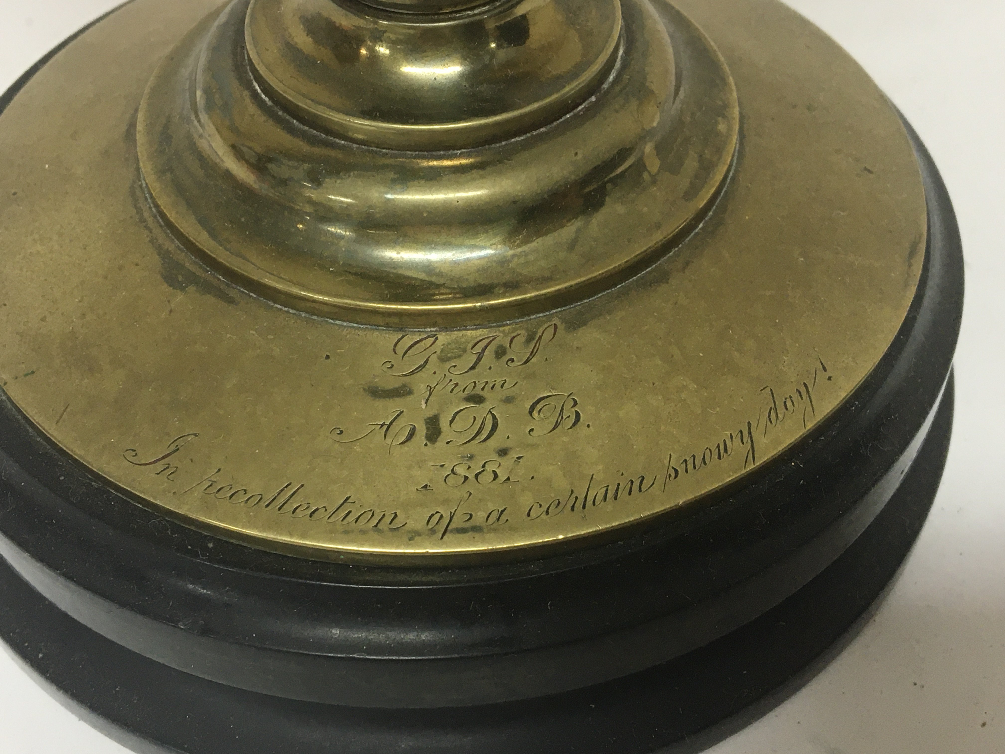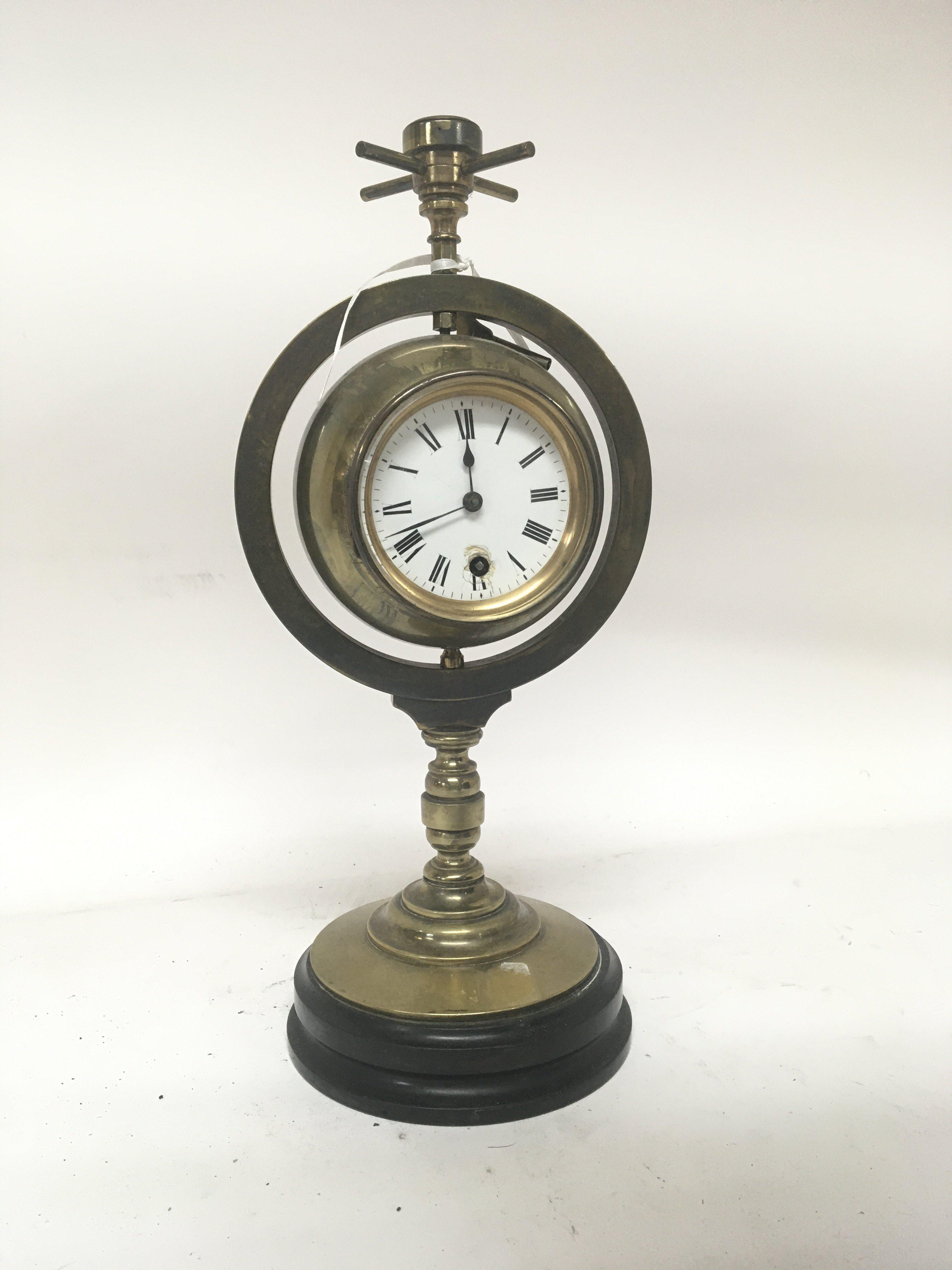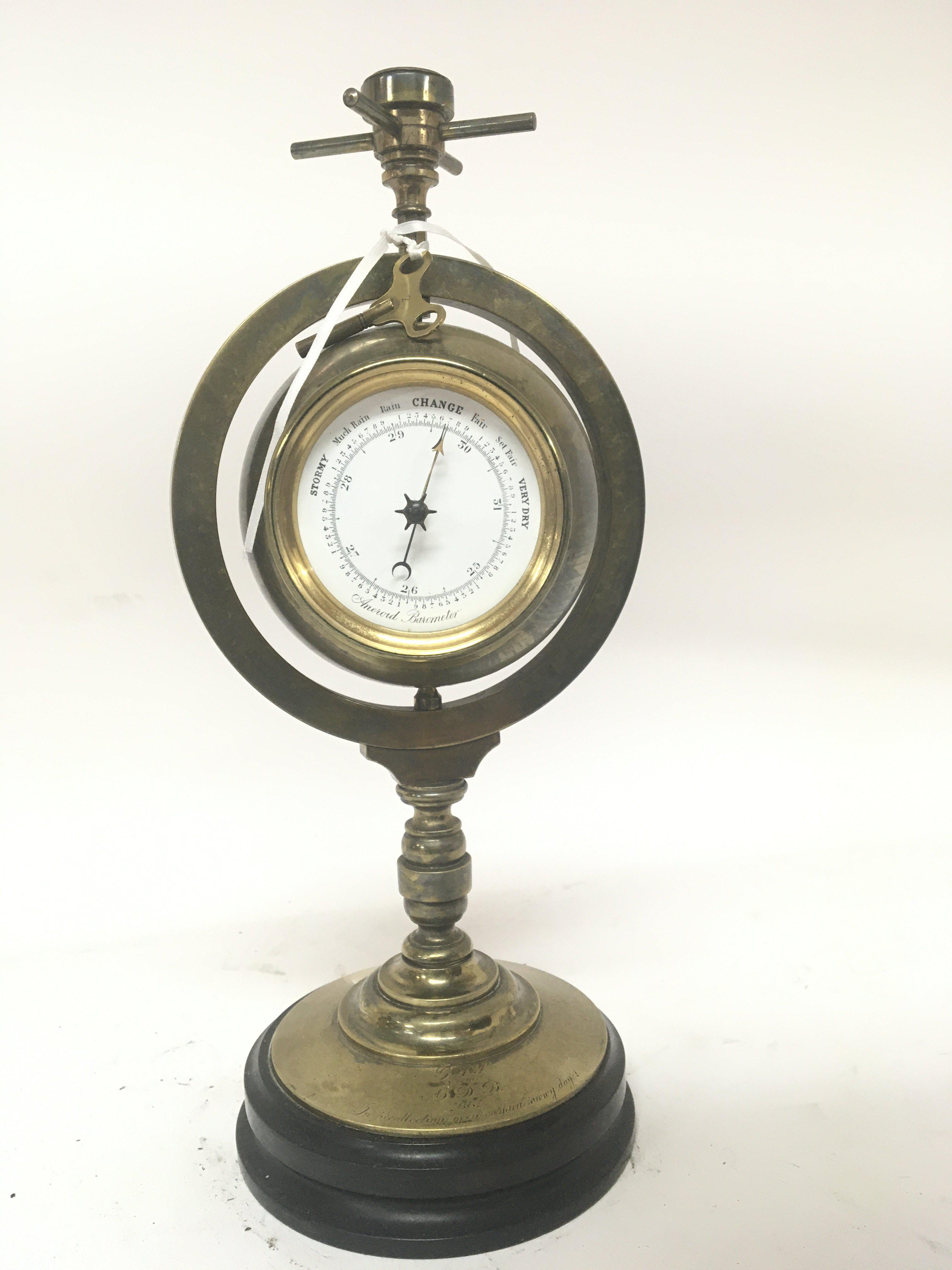A Victorian brass clock barometer with a revolving Spherical ball. No Reserve. Height 33cm. With key