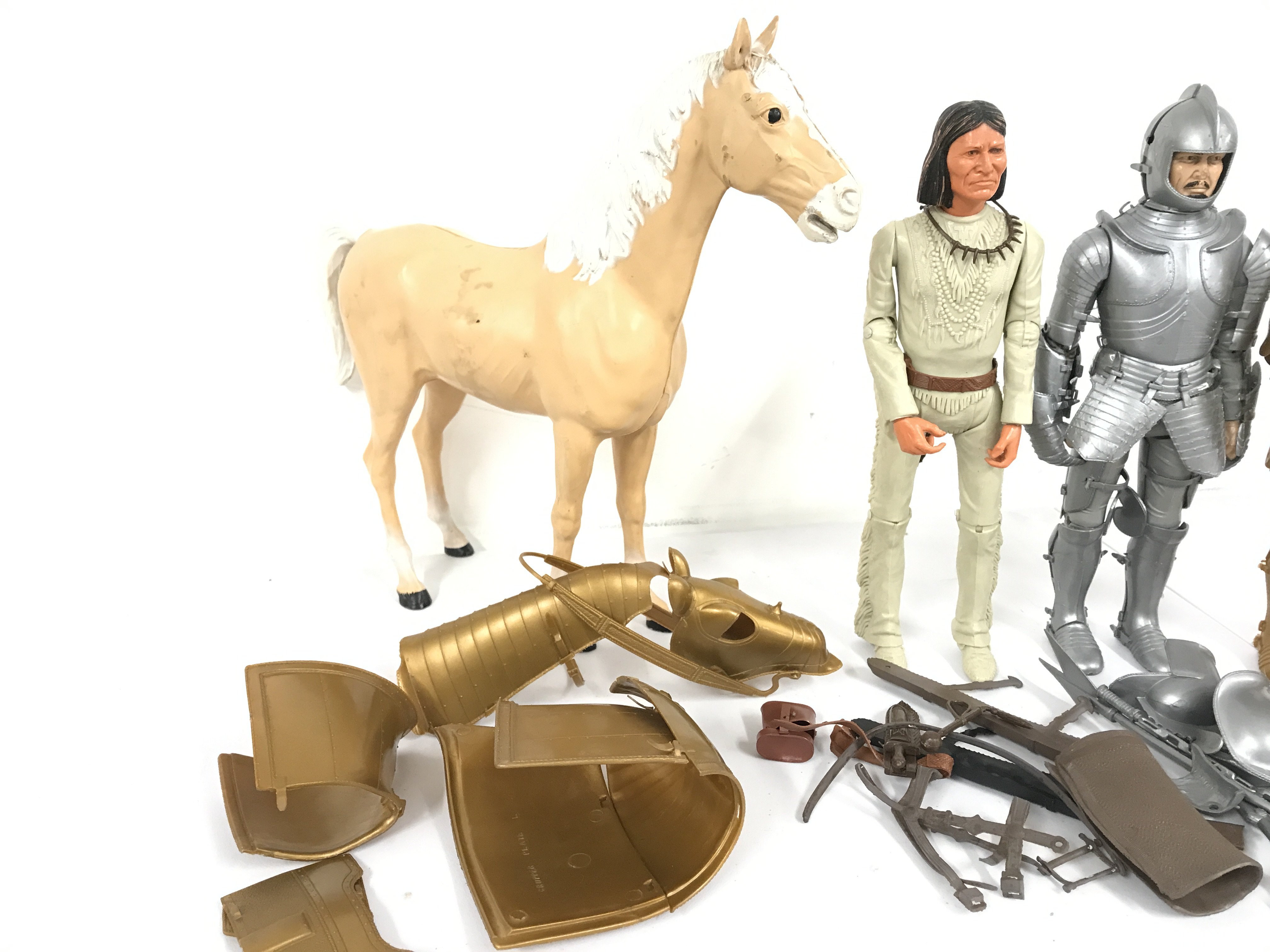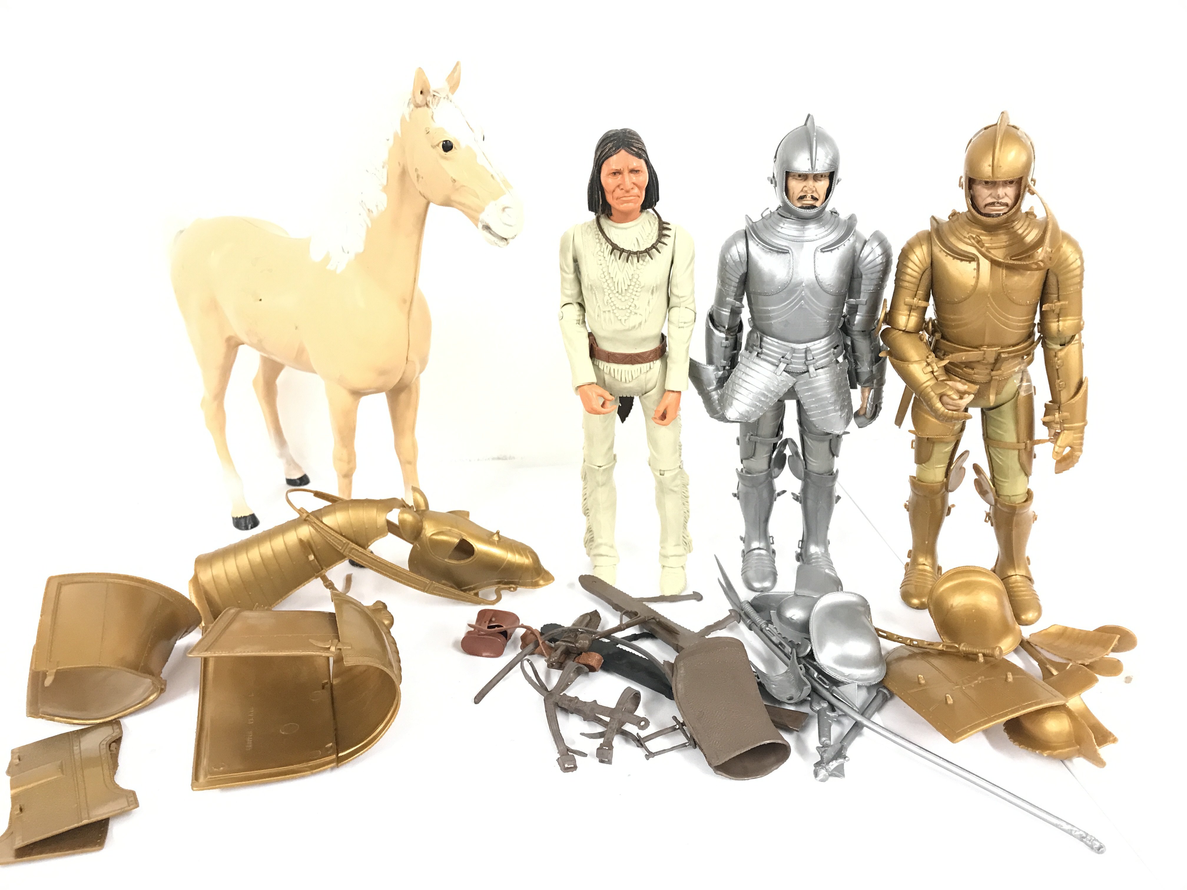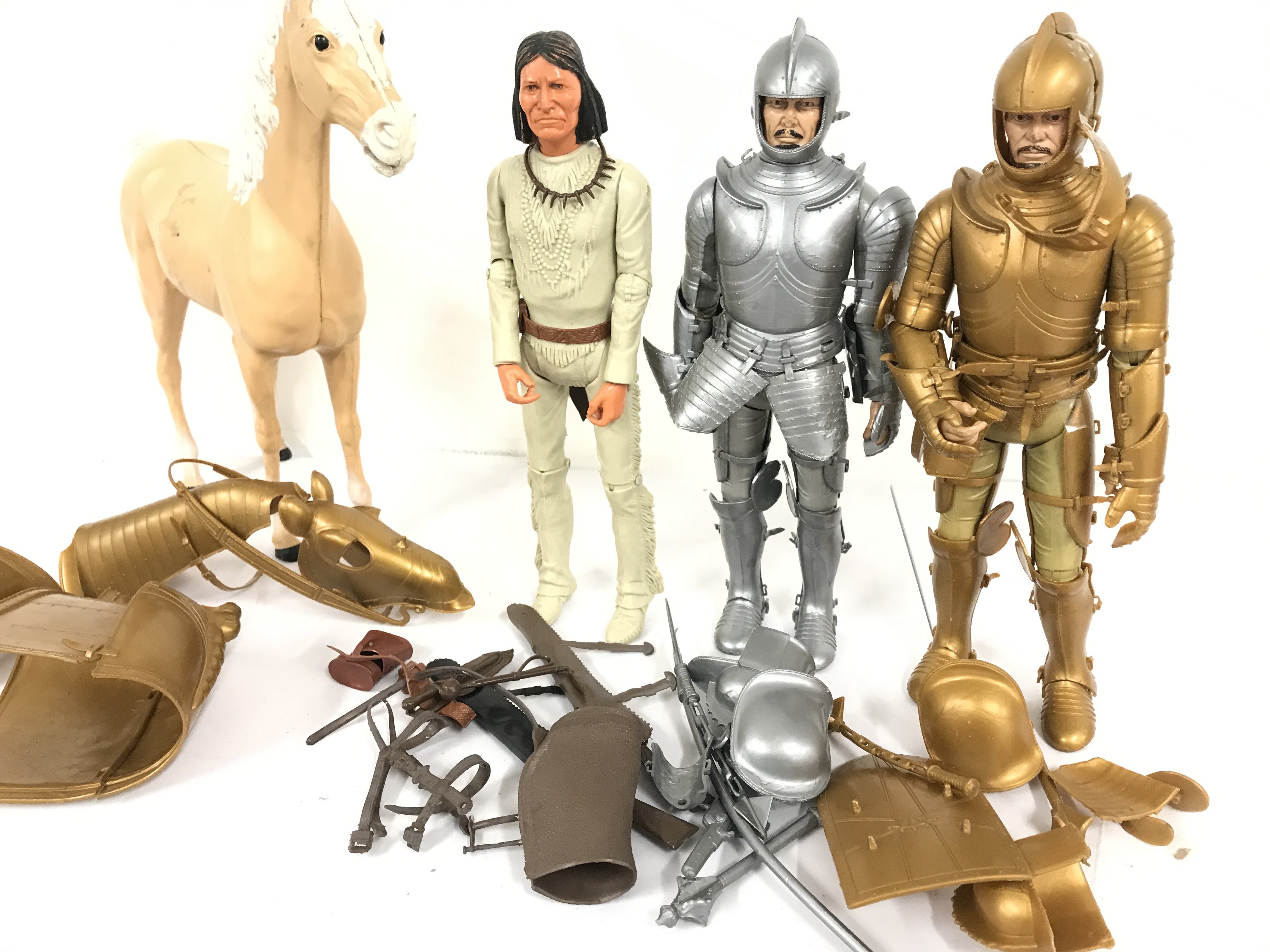 A Collection of Marx Toys. A Johnny West Indian Chief Geronimo. Thunderbolt Horse. Gold and Silver Knights. With accessories.