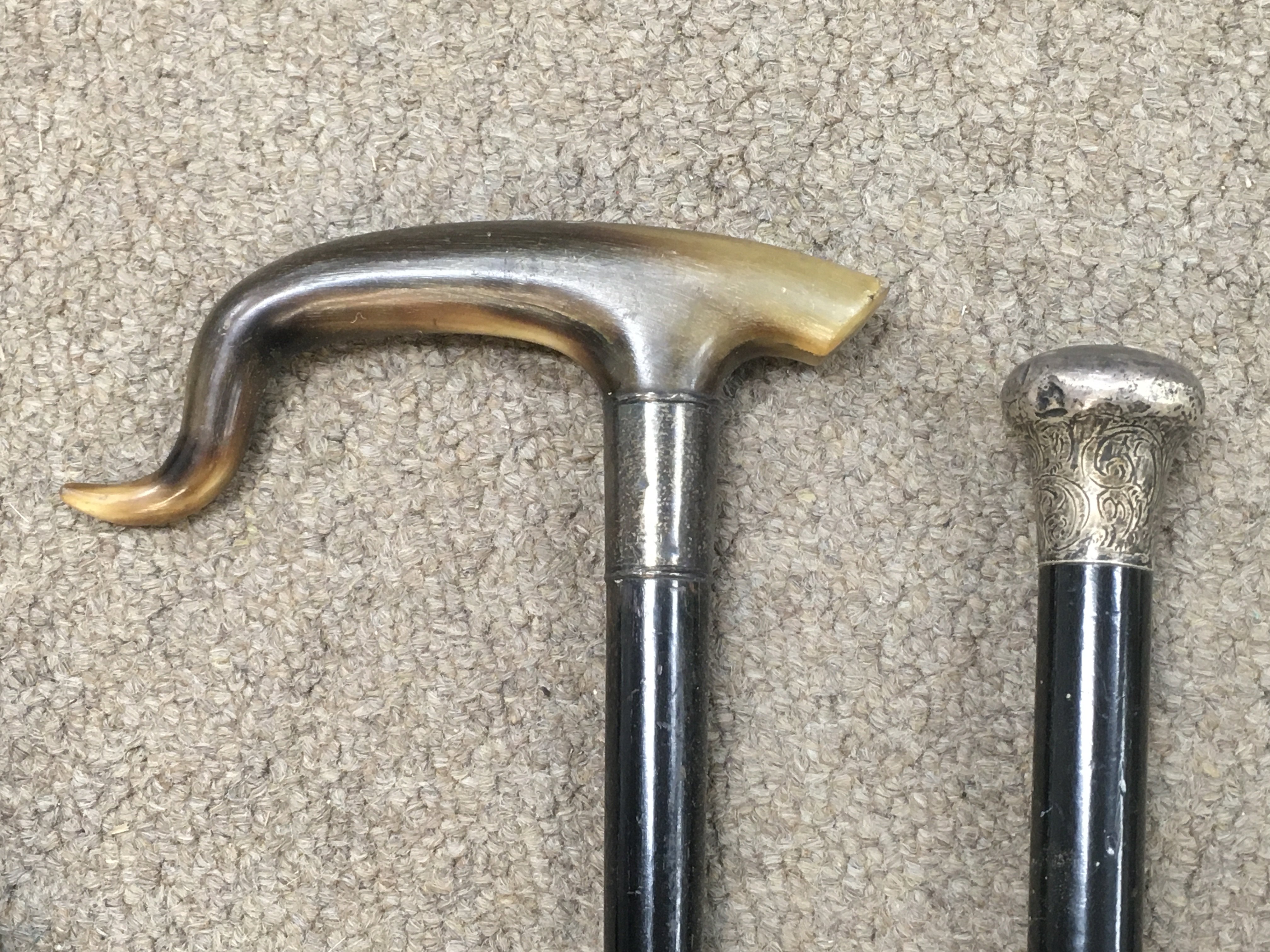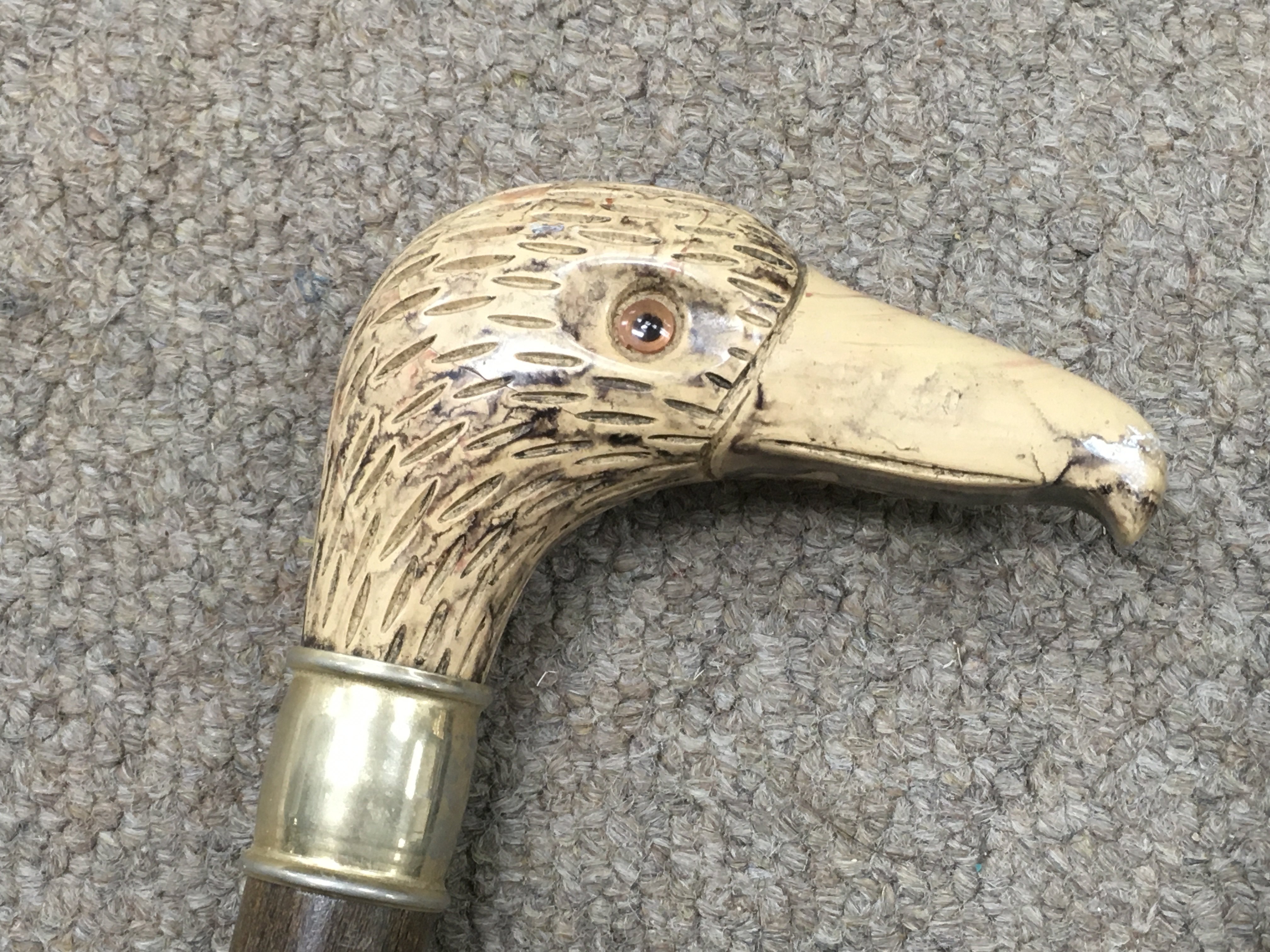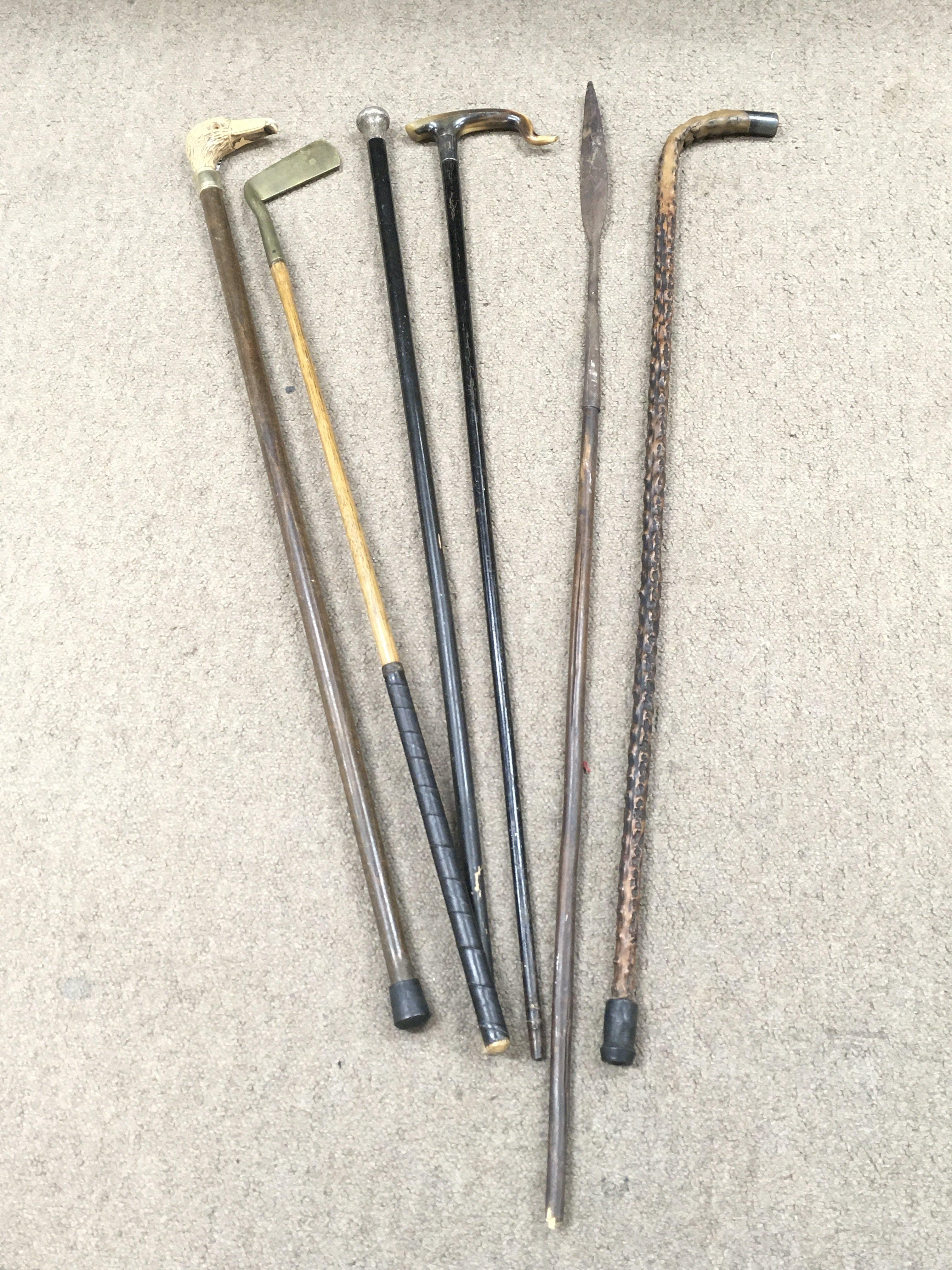 A Collection of walking sticks including an ebonised wooden stick with a horn handle and silver hallmarked collar, bird head carved wooden topped walking stick, bronze ended golf putt etc