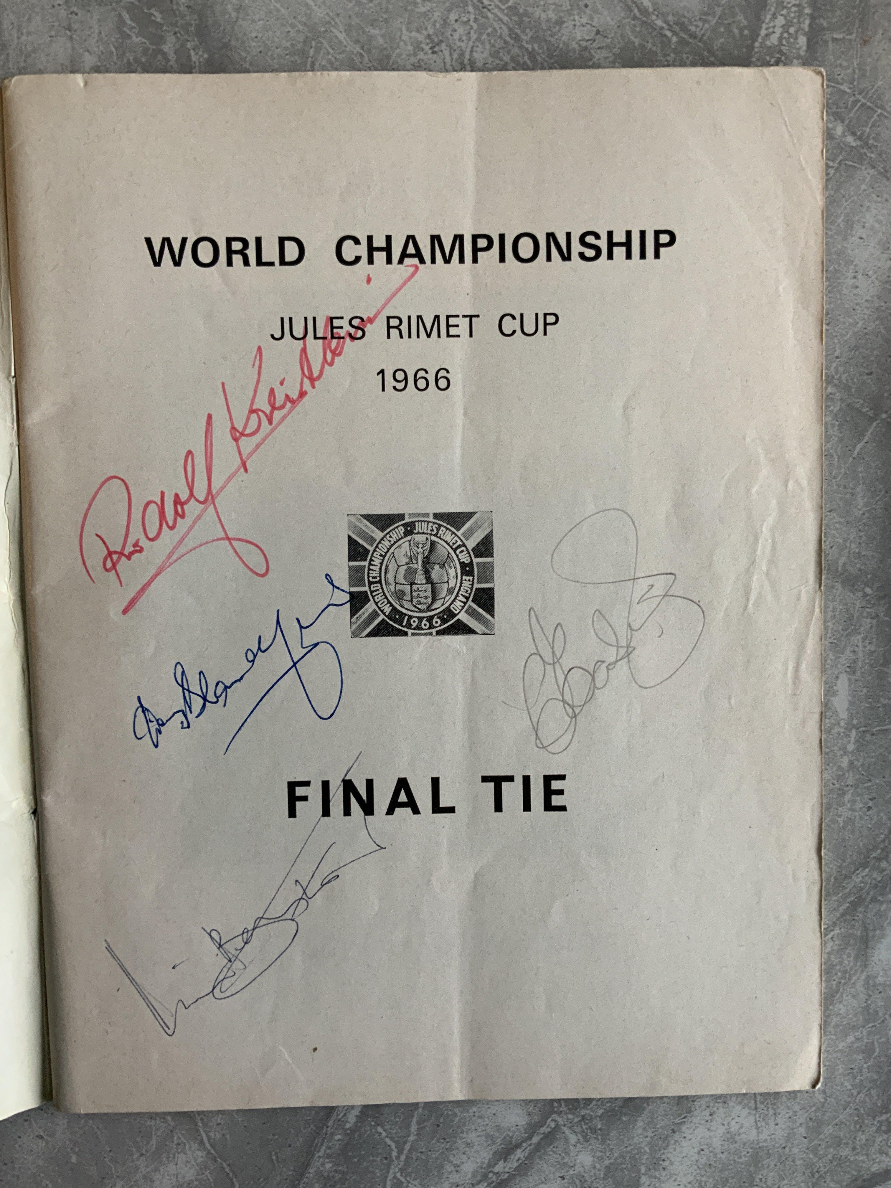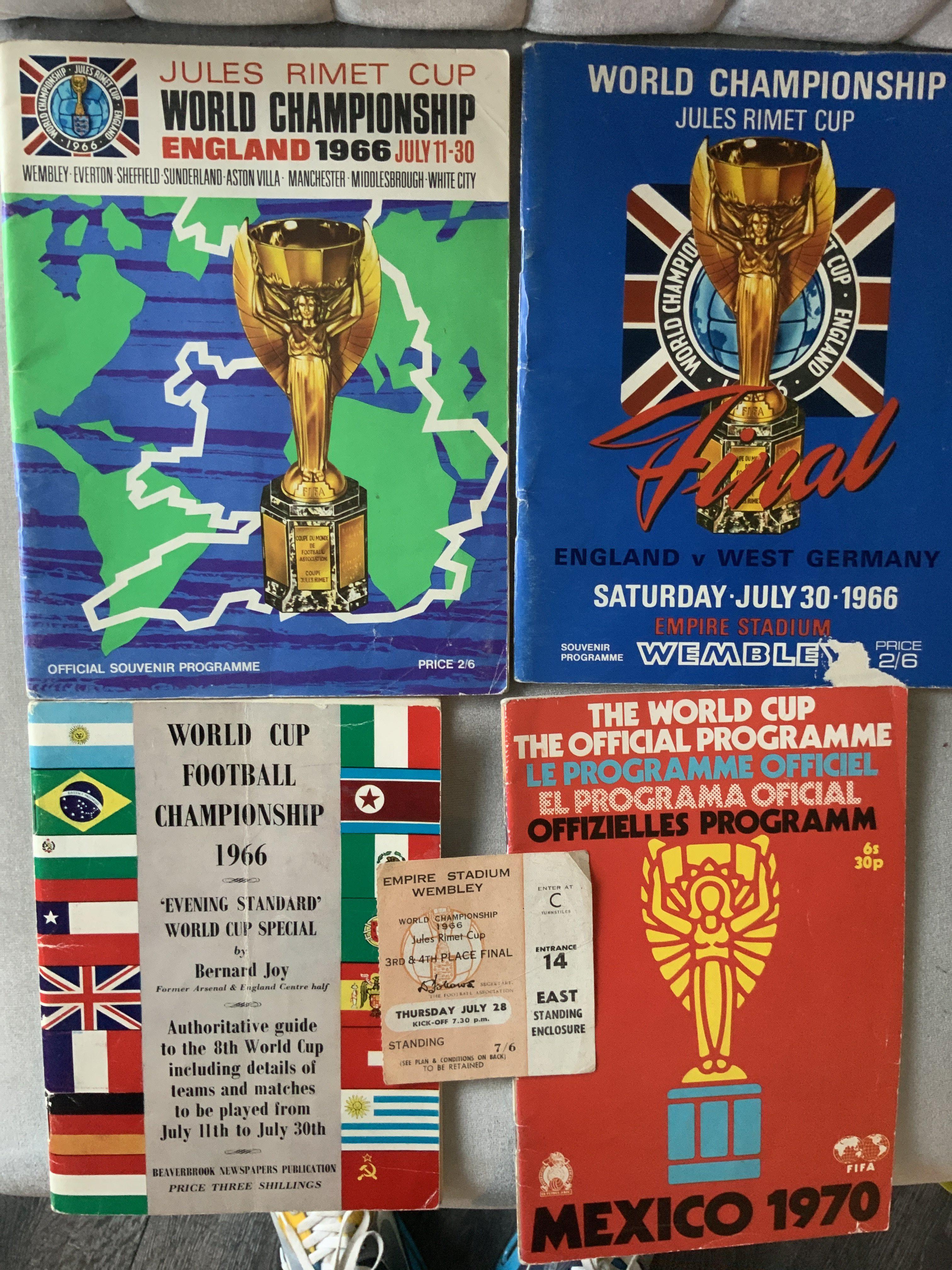 1966 World Cup Football Memorabilia: Original scuffed final programme signed inside by Danny Blanchflower Jim Baxter and two others. C/W tournament programme, Evening Standard special 3rd and 4th place ticket plus a 1970 World Cup programme. (5)