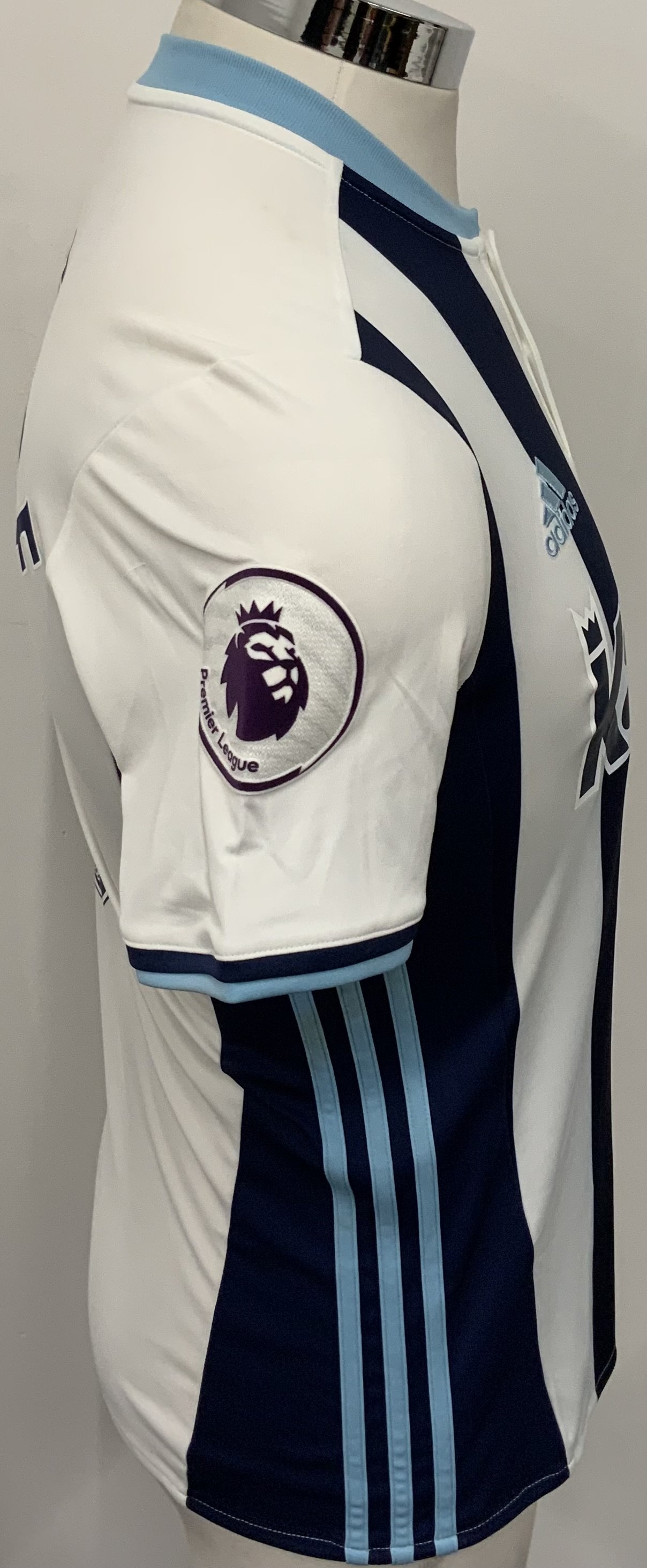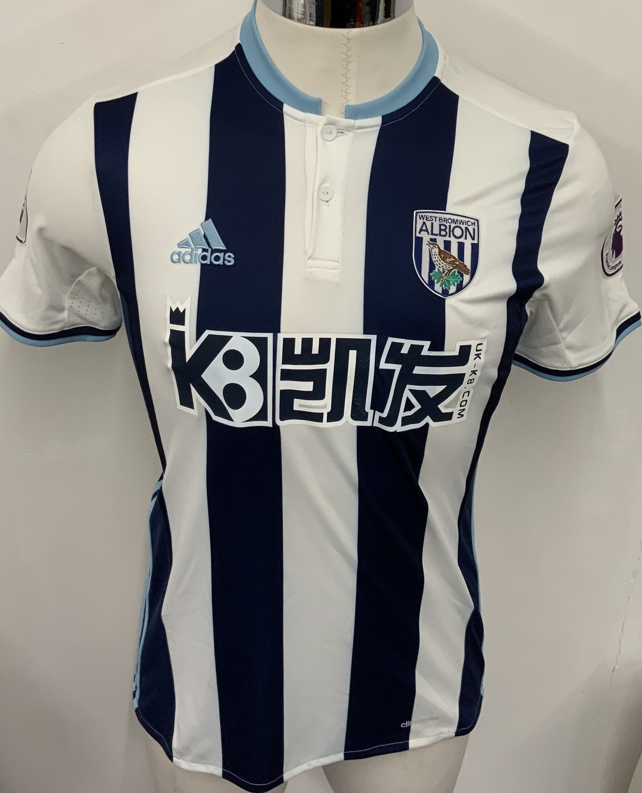 West Brom 2016 - 2017 Match Worn Football Shirt: Blue and white short sleeve shirt with Premier League badging to sleeves. Livermore 8 to rear. Worn v Crystal Palace on 4 March 2017.
