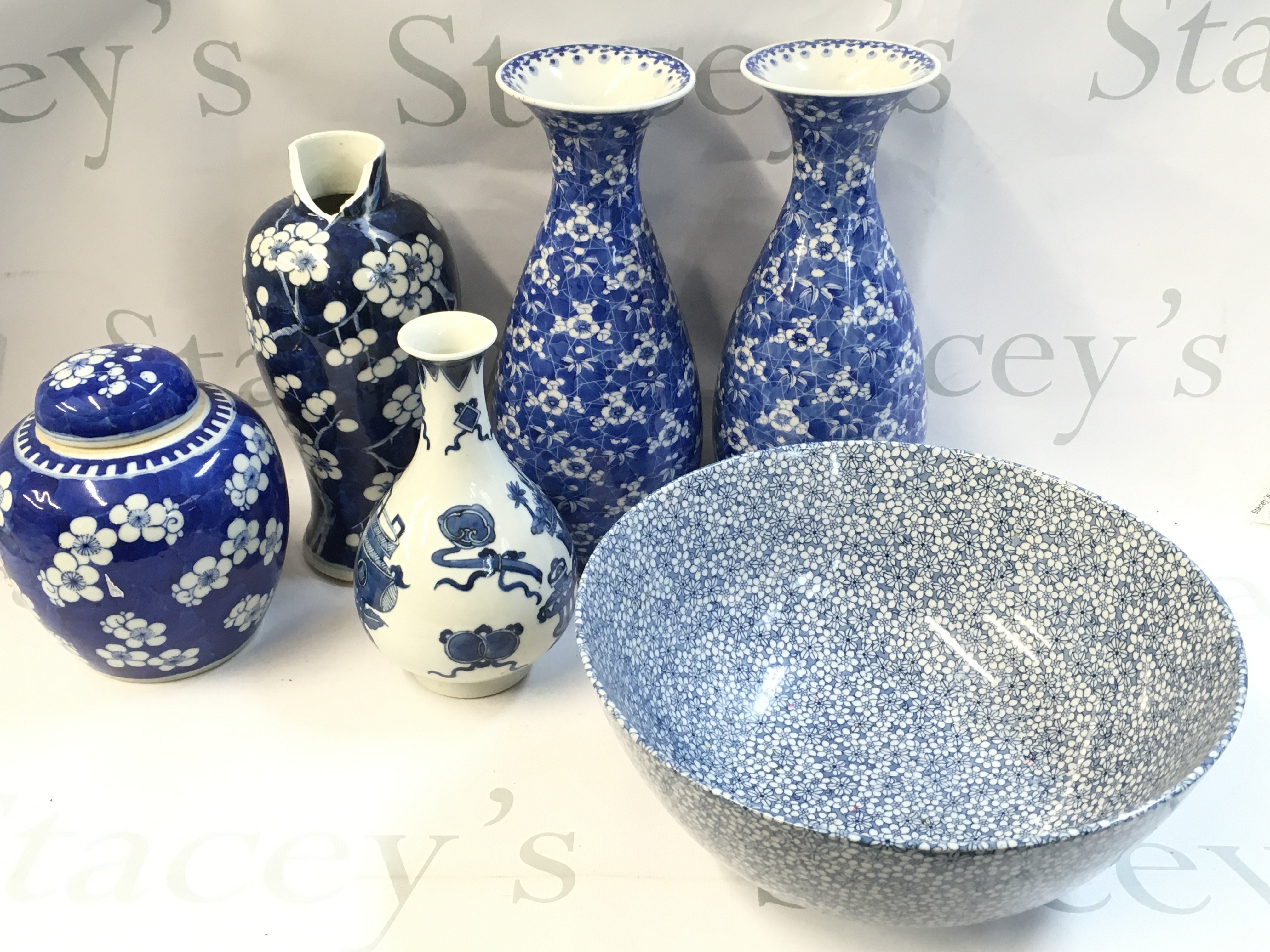 A collection of Chinese blue and white ceramics including vases, a cherry blossom ginger jar with a four character mark to base, damaged blossom vase etc