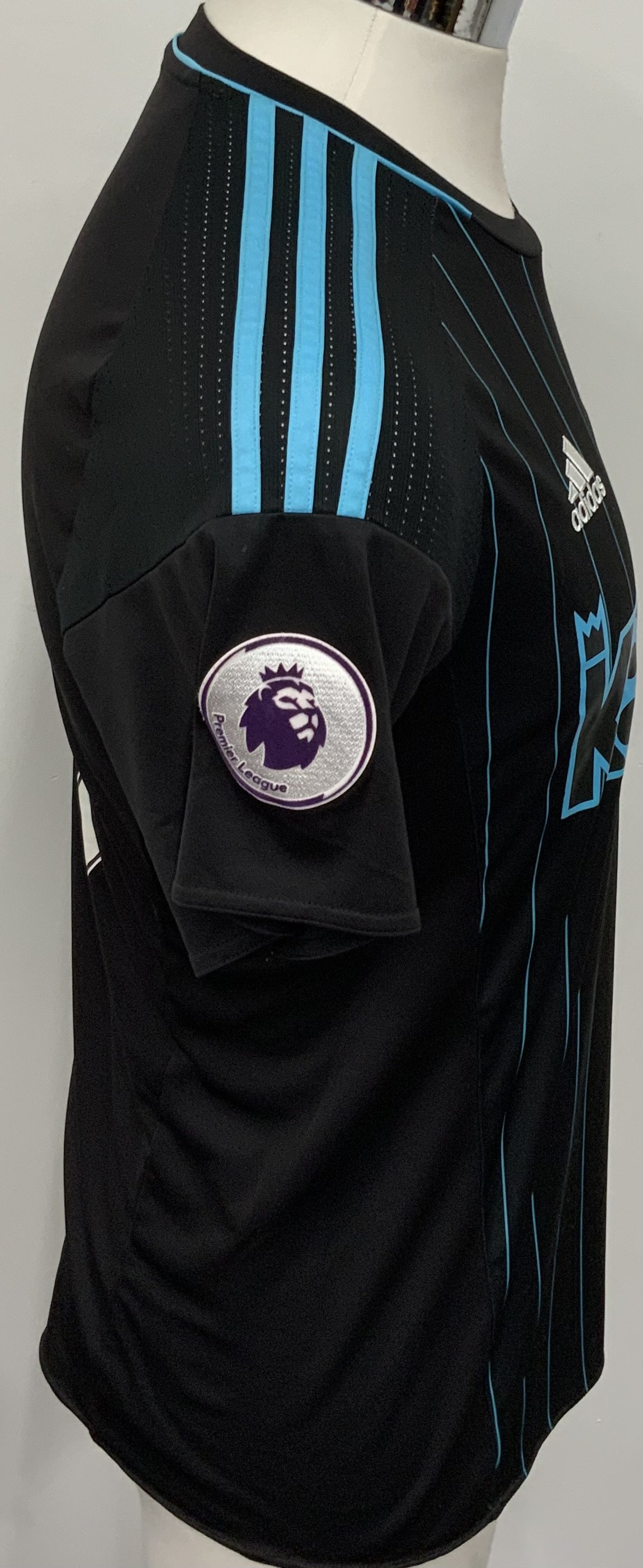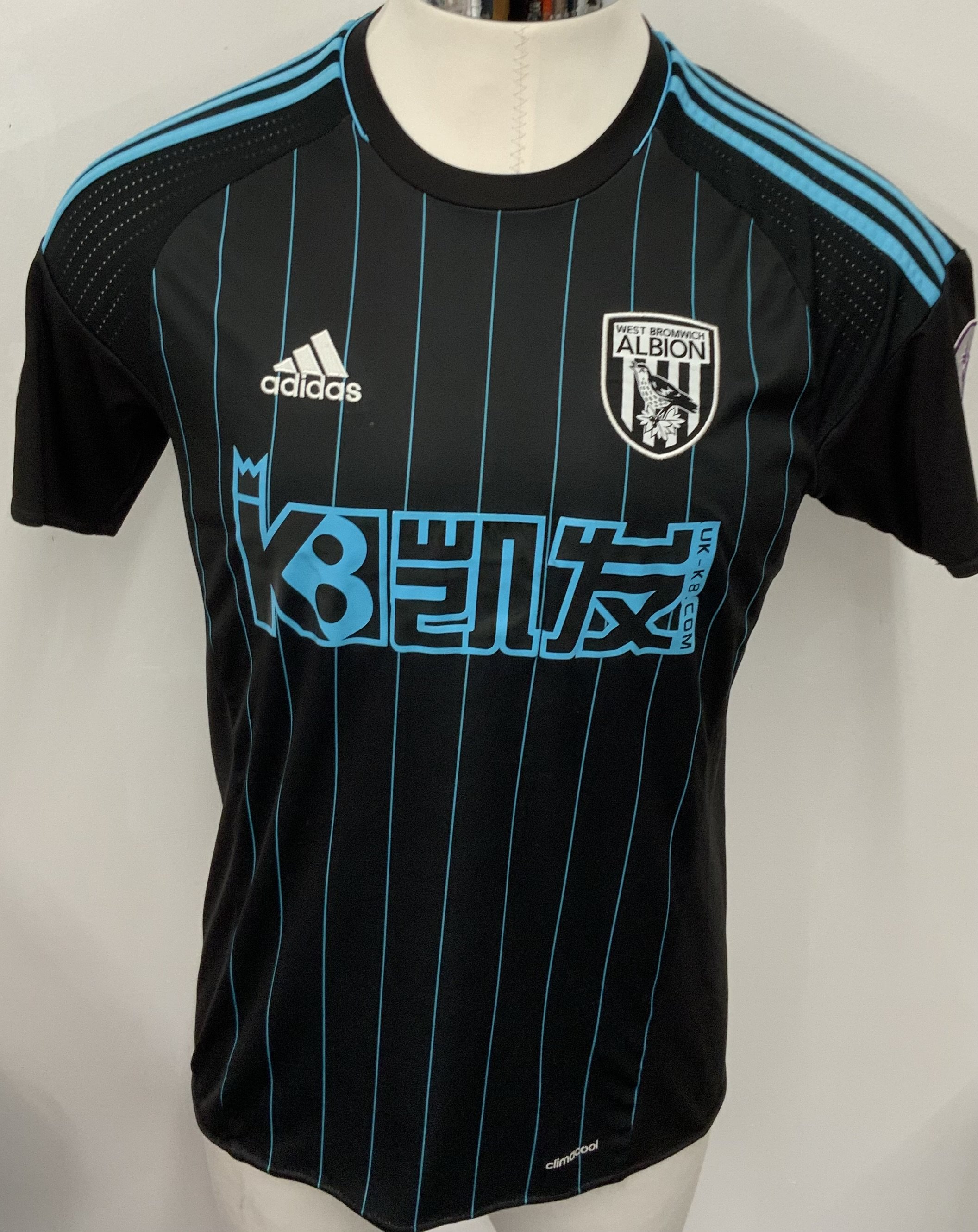 West Brom 2016 - 2017 Match Worn Football Shirt: Black and blue pin striped short sleeve shirt with Premier League badging to sleeves. Leko 45 to rear.