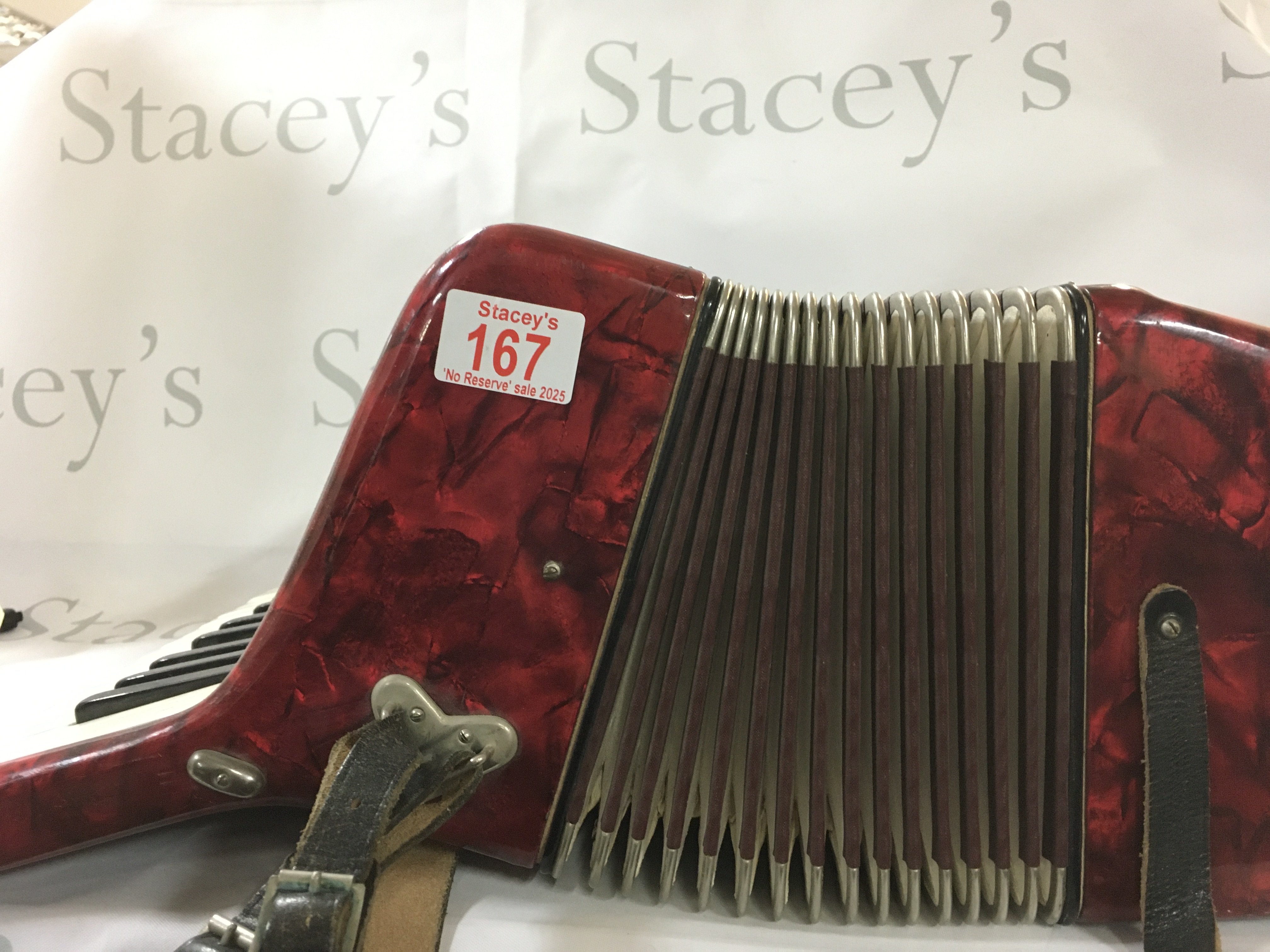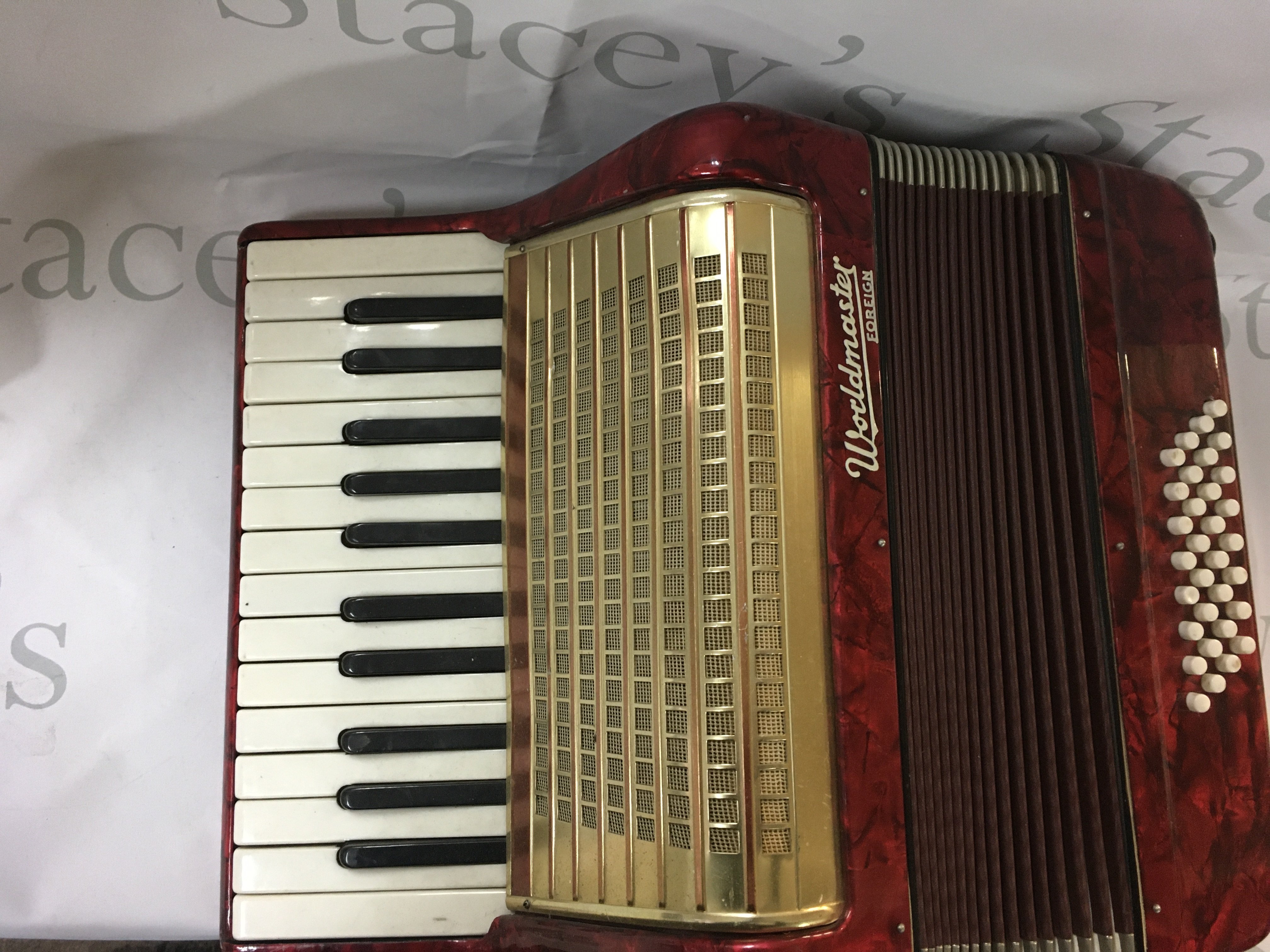 Piano accordion by Worldmaster Foreign. Red, white and gold and is roughly 46 cm wide and 18cm tall.