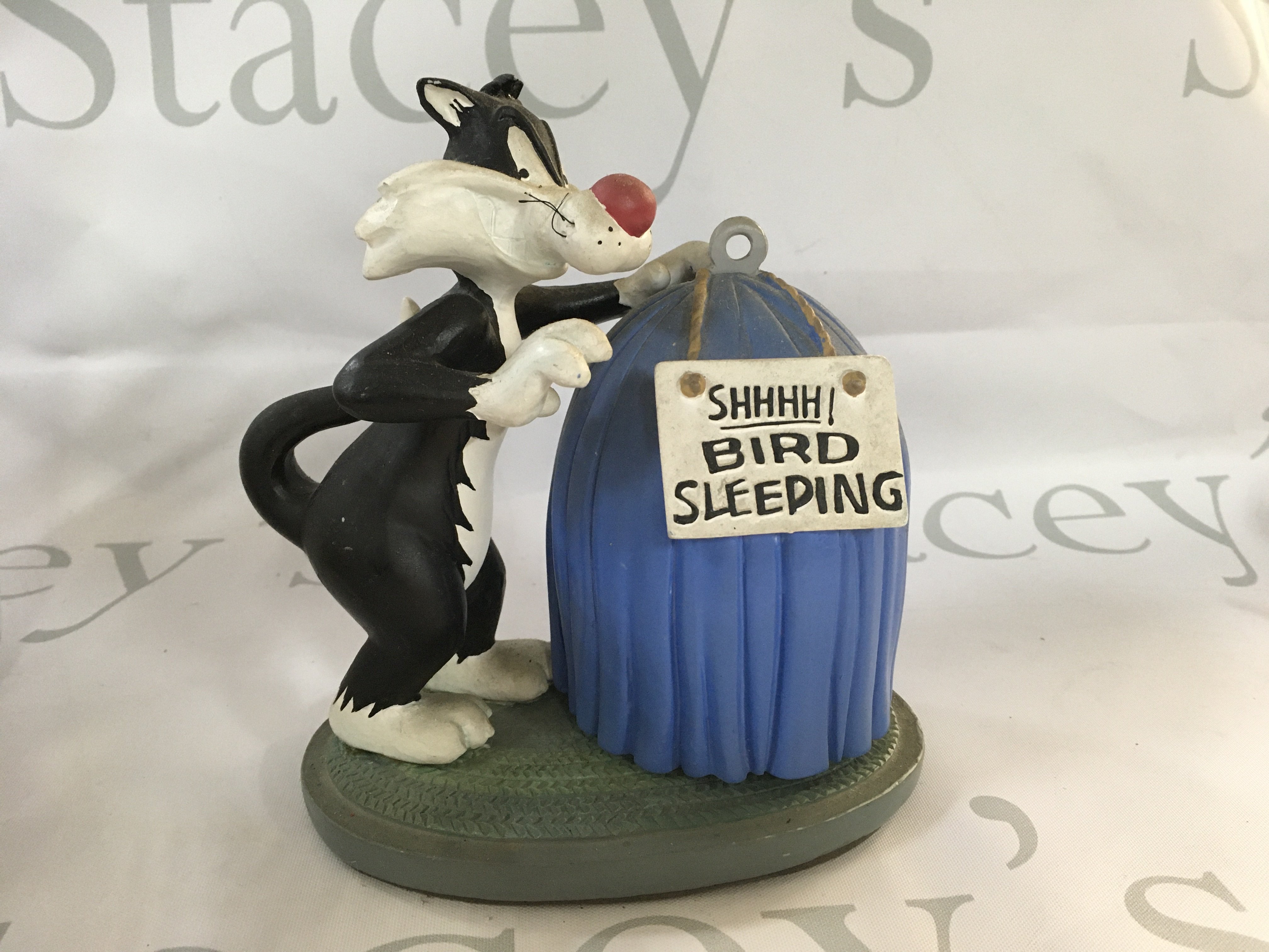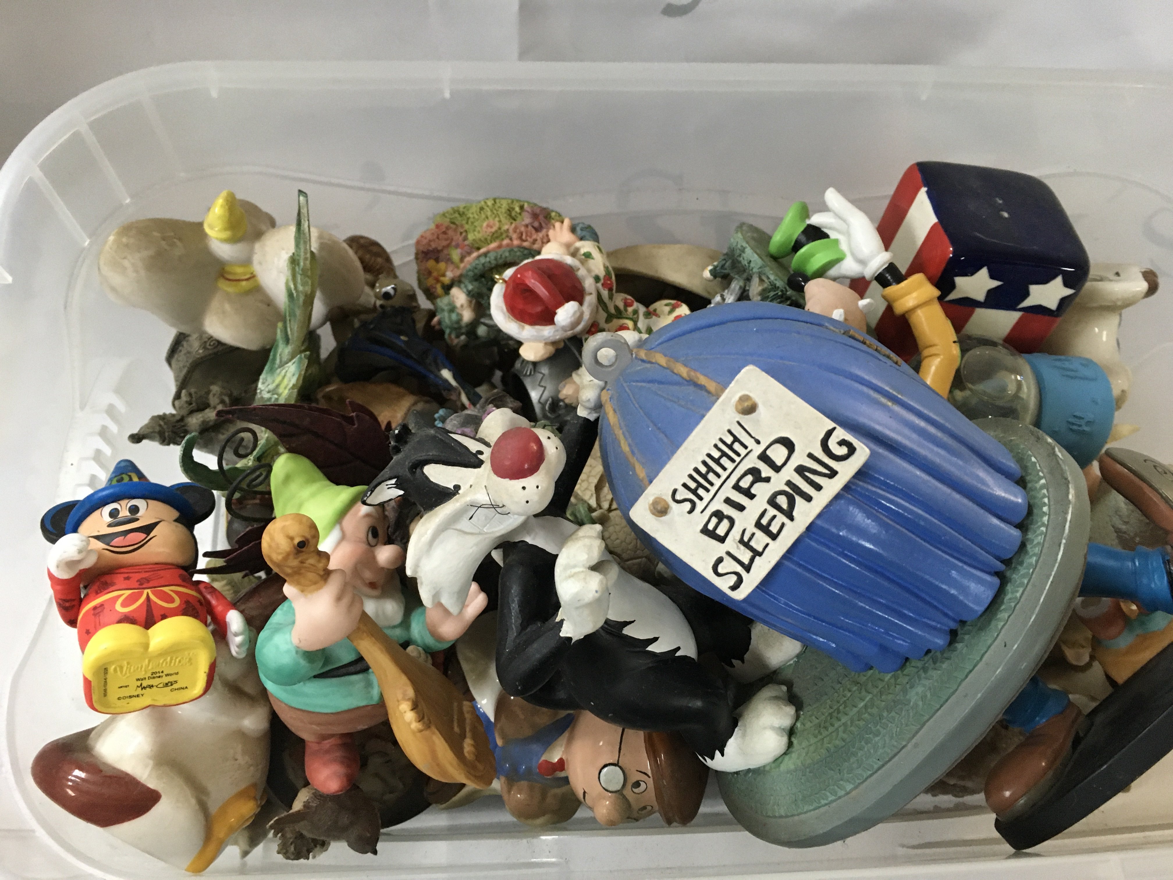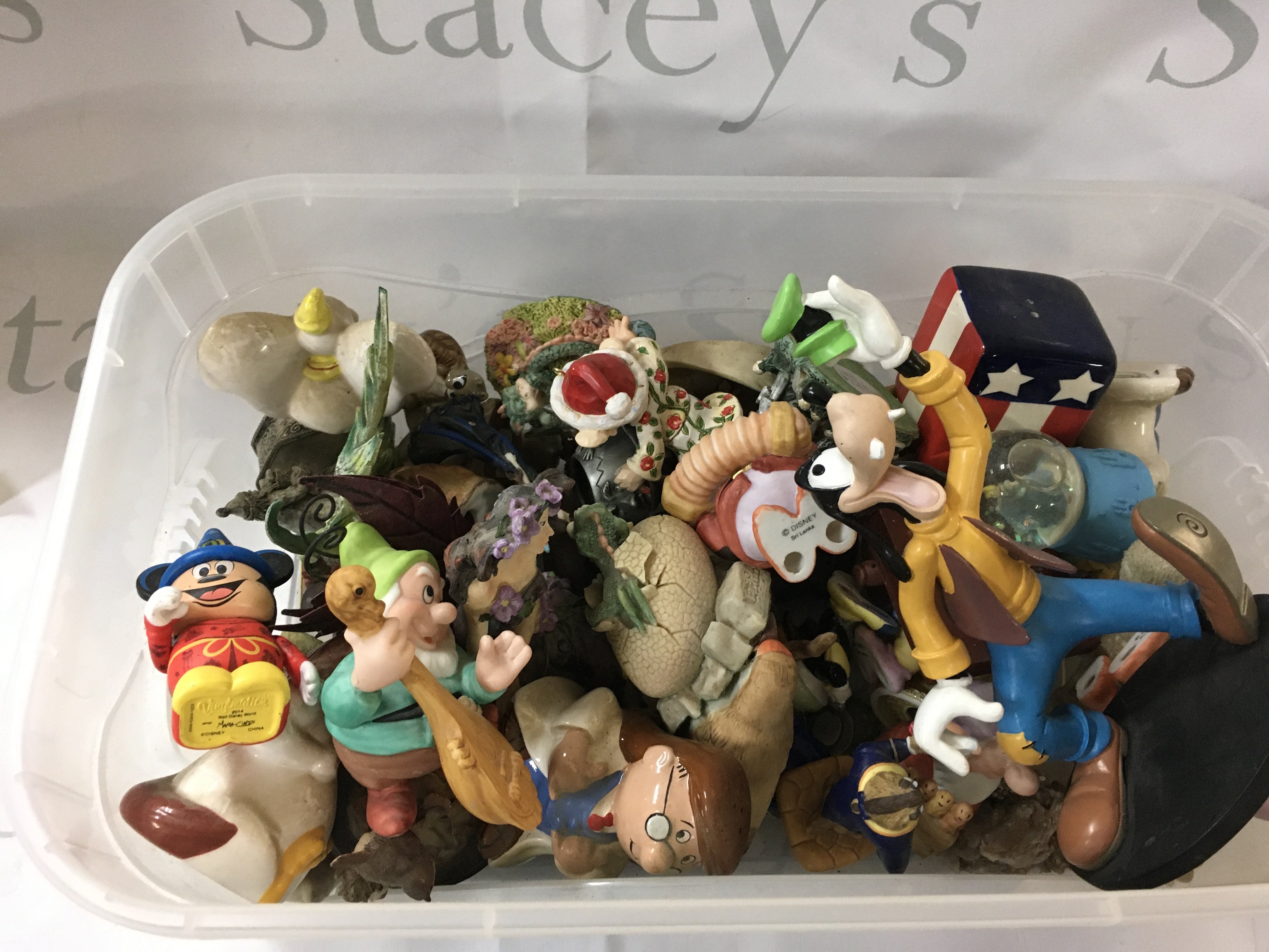 Box of figurines including Disney, Looney Tunes, dream dragons, a small snow globe and other items.