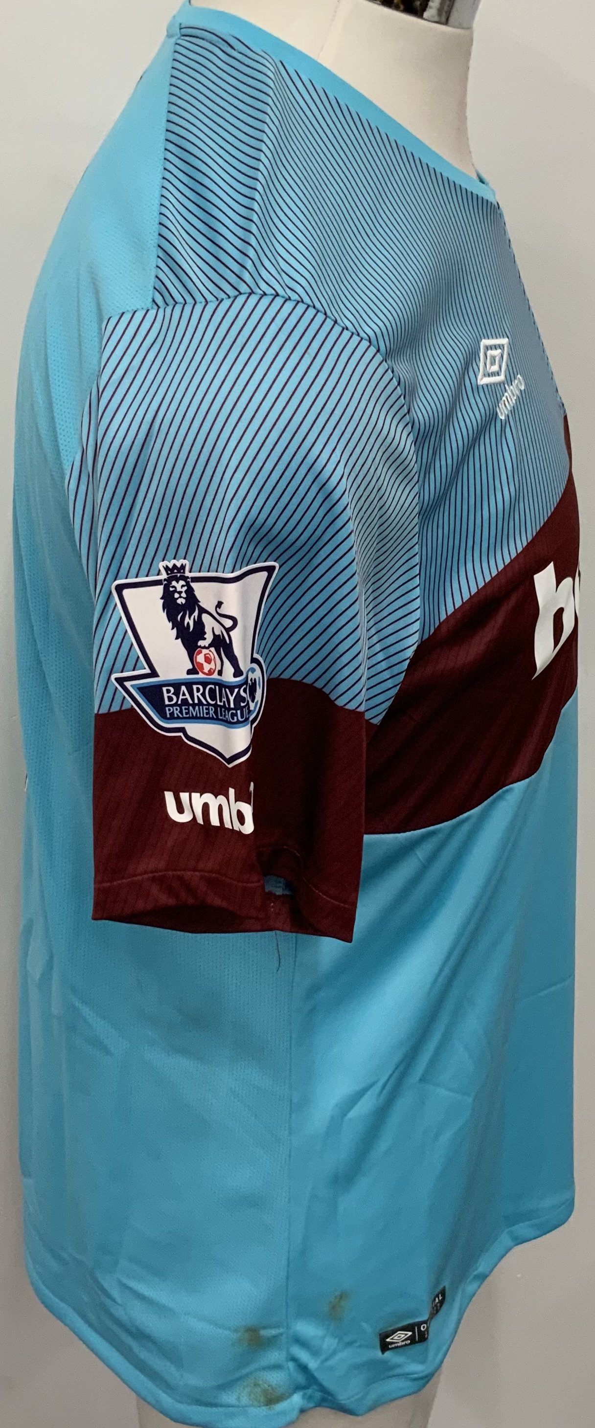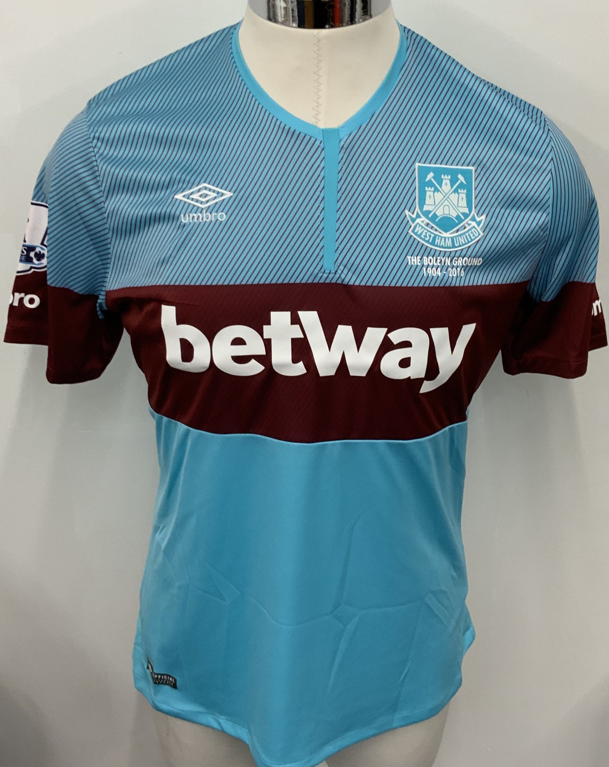 West Ham 2015 - 2016 Match Worn Football Shirt: Light blue and Claret hooped short sleeve shirt with Premier League badging to sleeves. Reid 2 to rear. Worn by the player who scored the last ever goal at Upton Park. Unwashed.