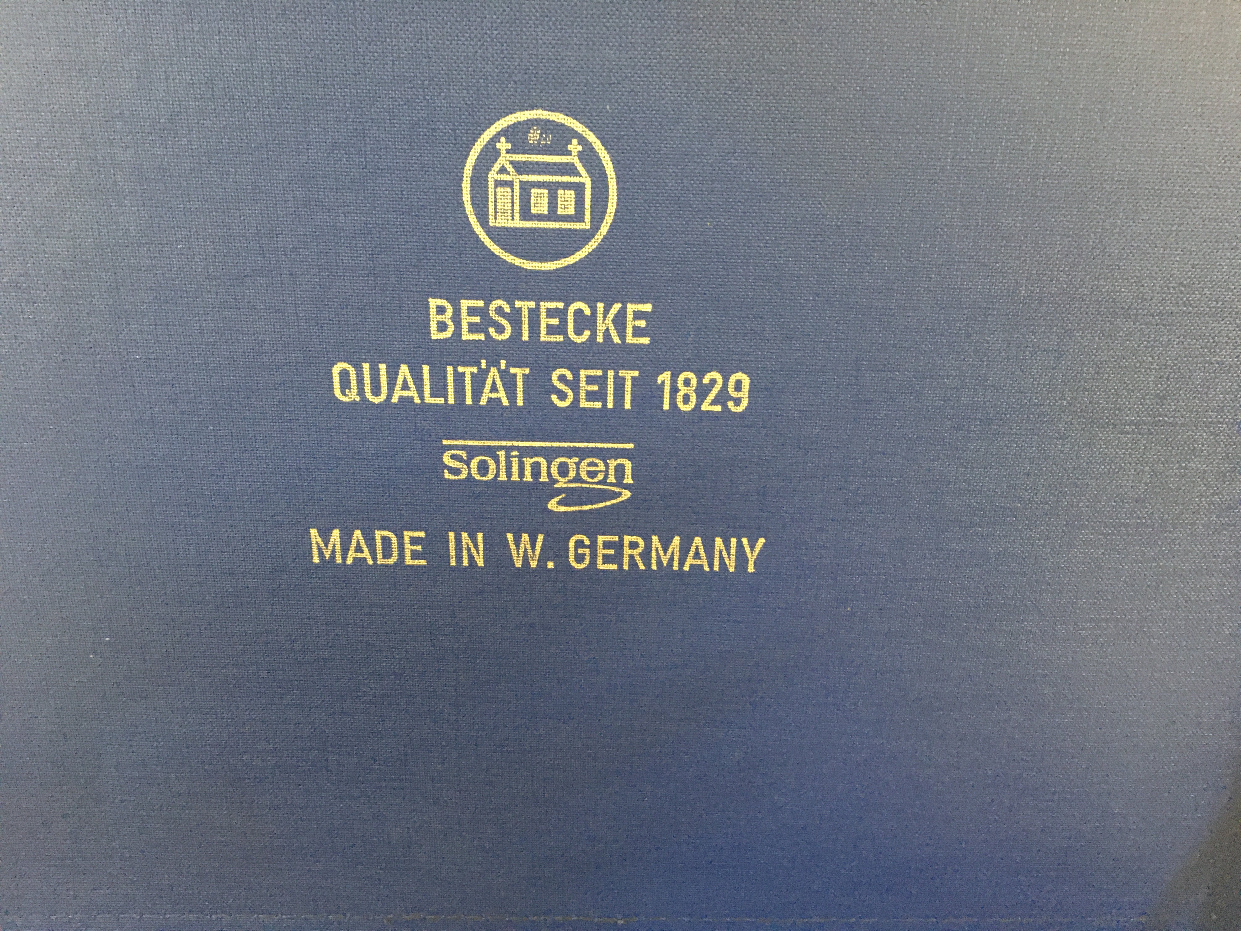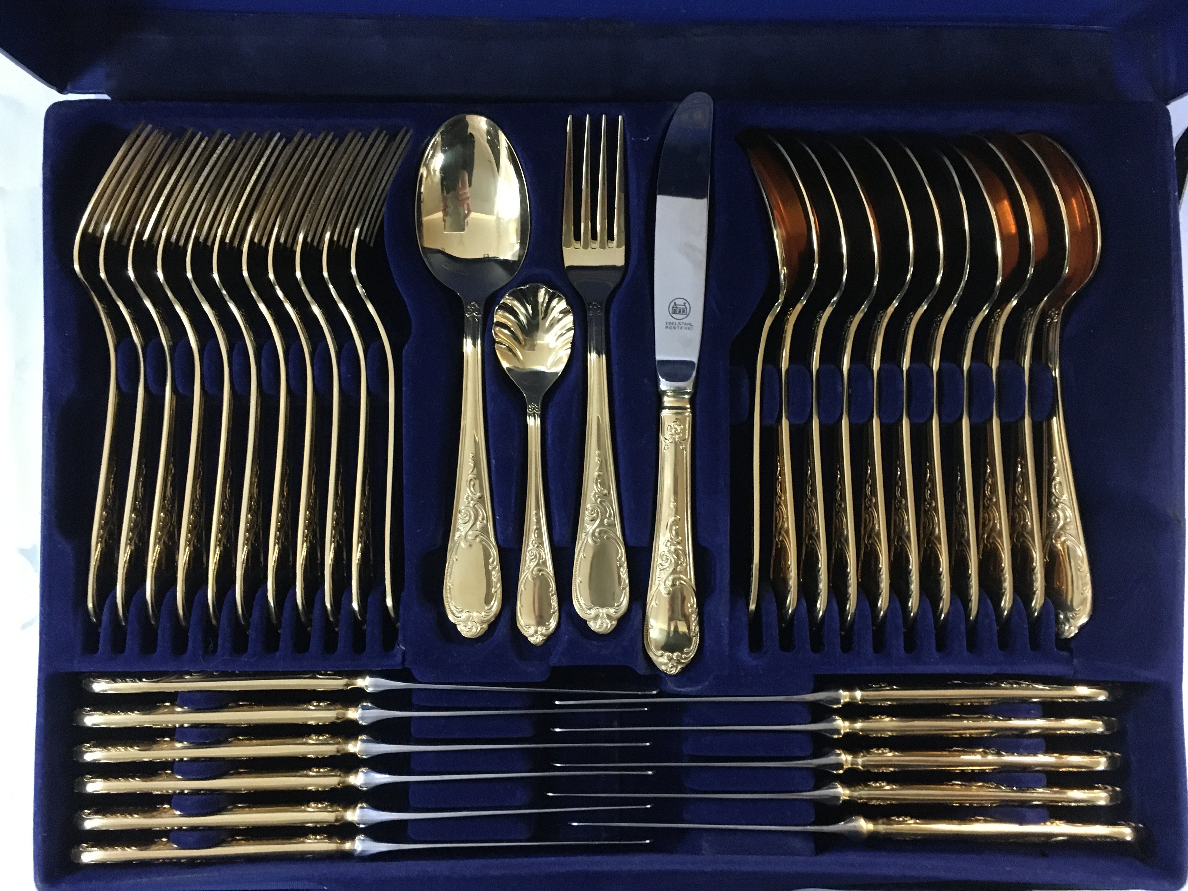 Golden cutlery including large spoons, tablespoons, teaspoons, forks, knives and other cutlery items. Chromstahl cutlery set including 23K gold plate cutlery. Nearly all of the utensils are there and made in Germany.