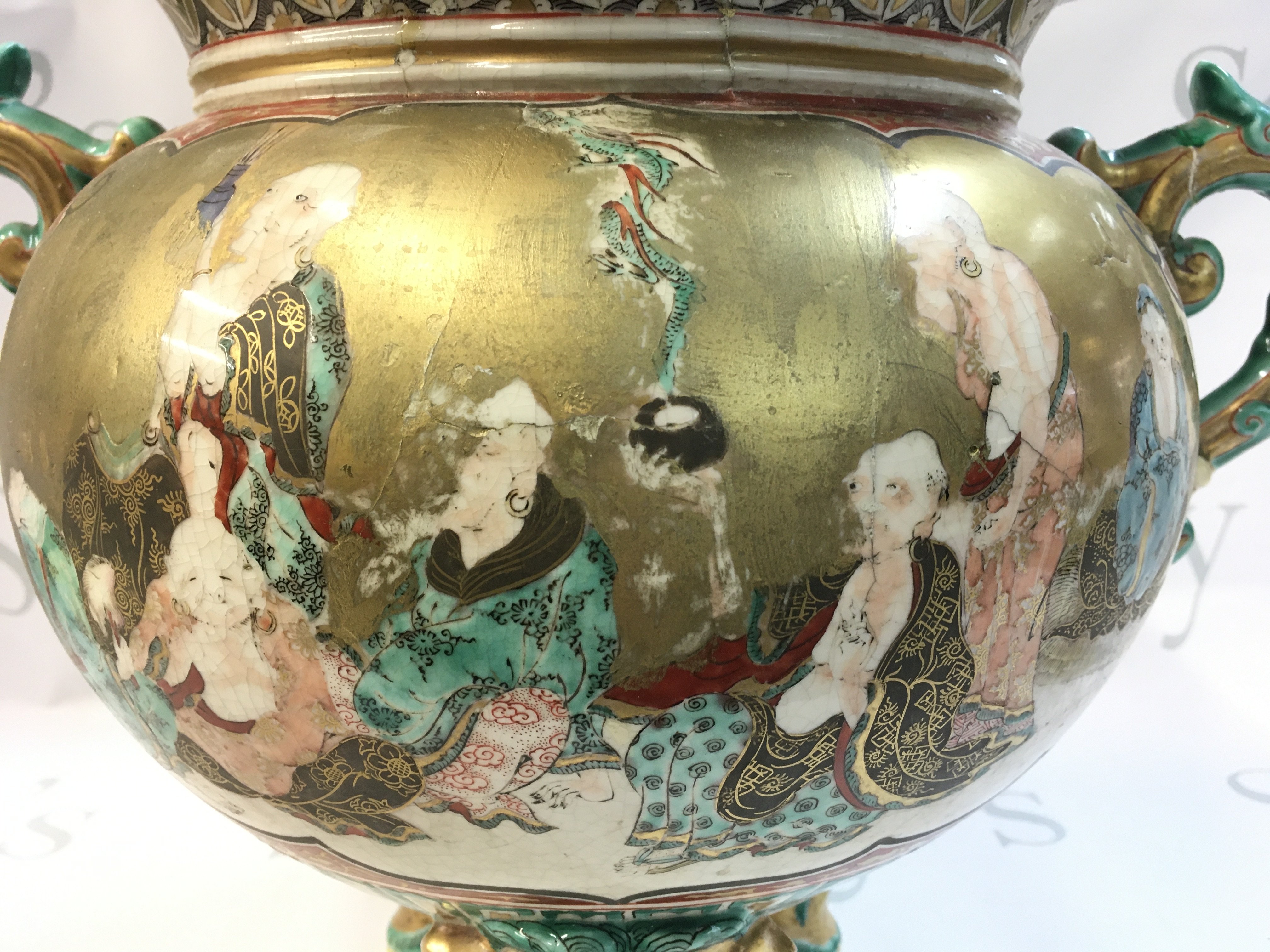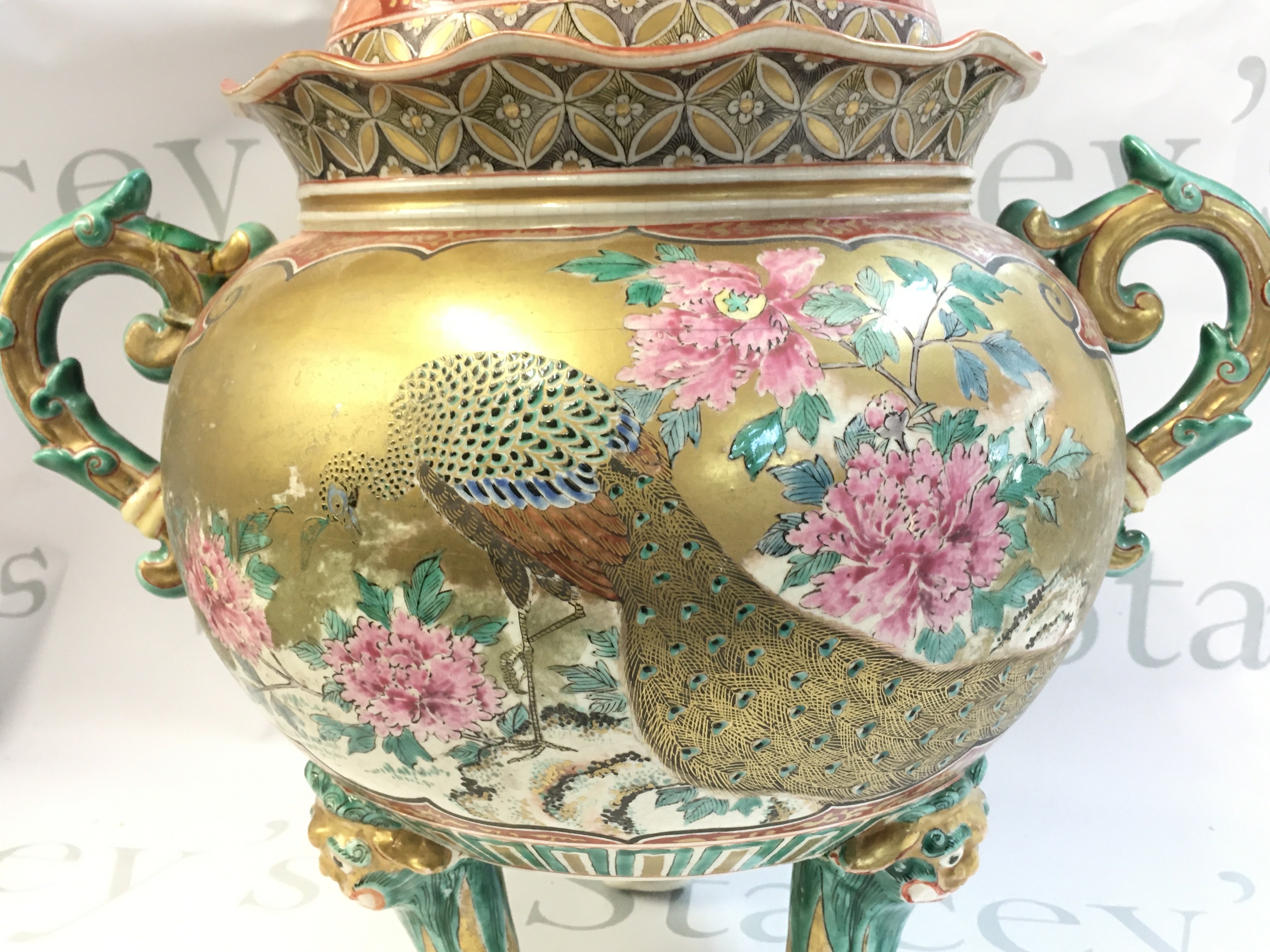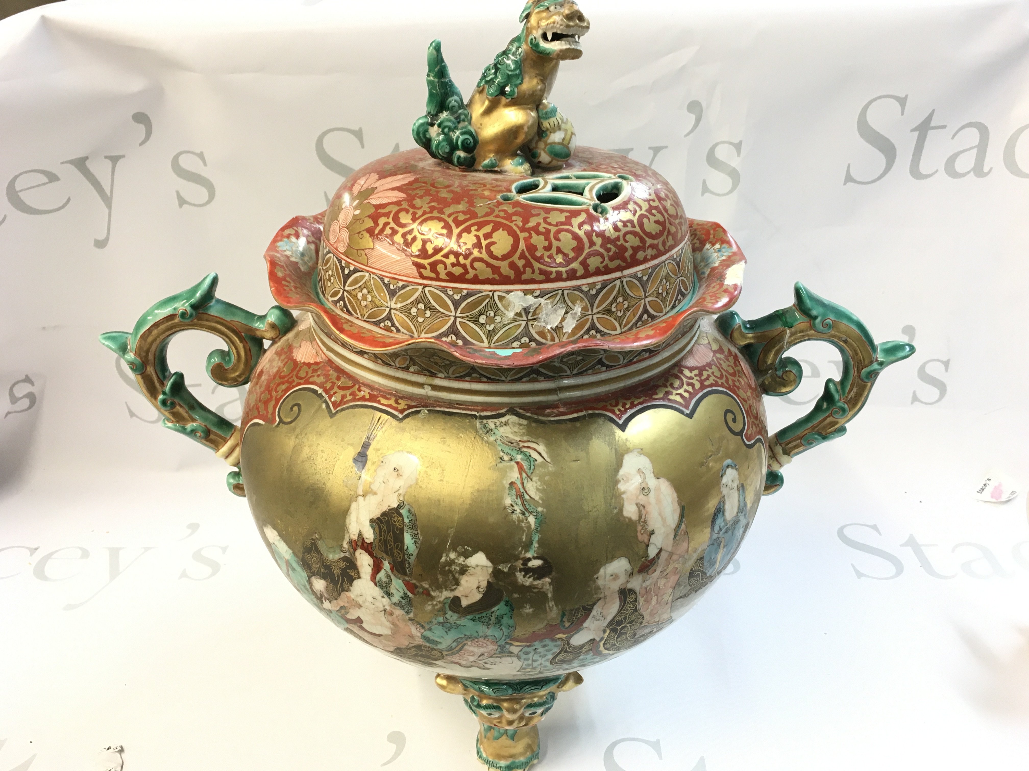 A Chinese vase decorated in gilt and with panels of figures and a peacock , twin handled design, topped with a Fu dog figure, fu dog feet. 38cm tall 40cm wide approximately. Some damage and restoration