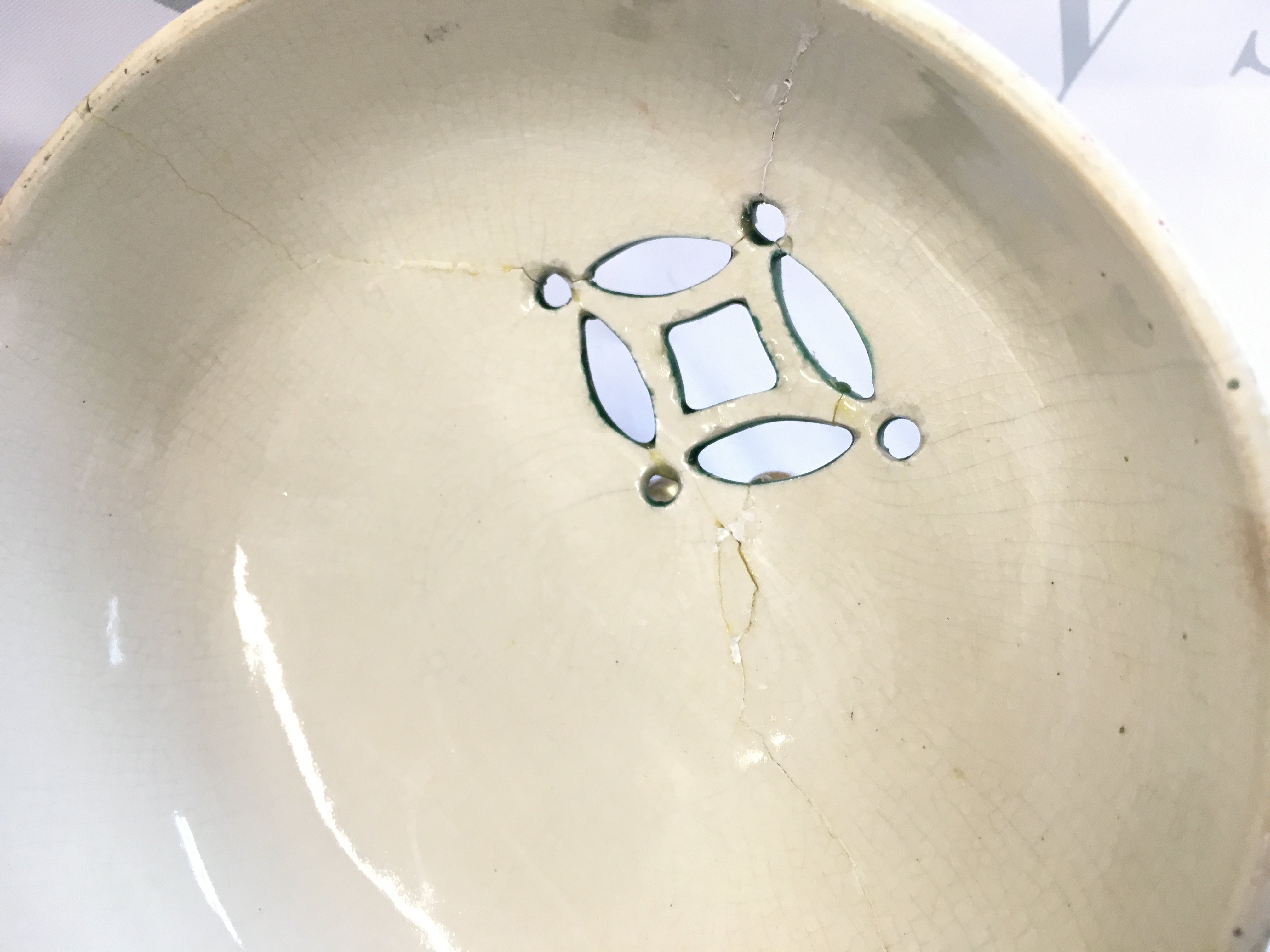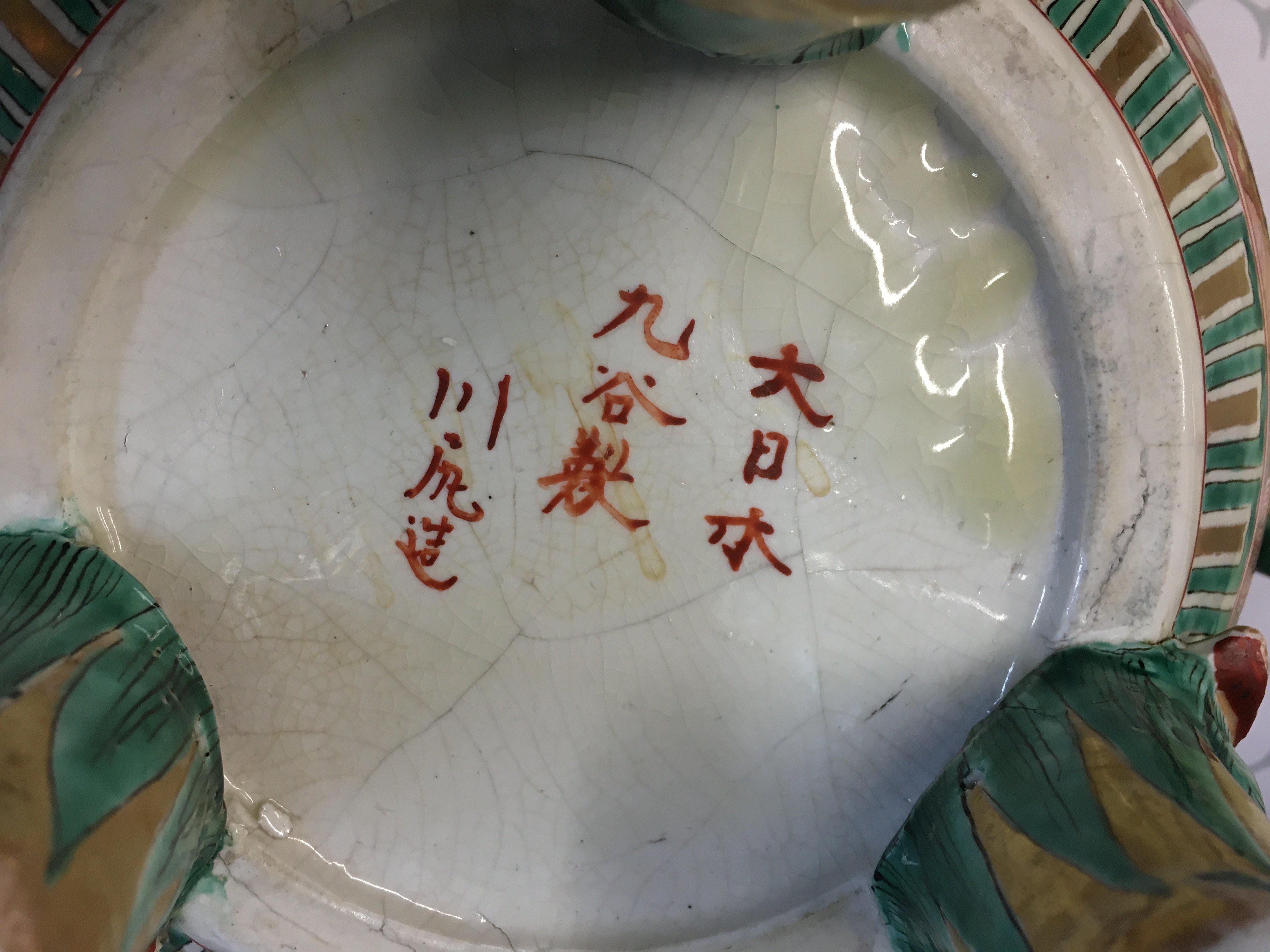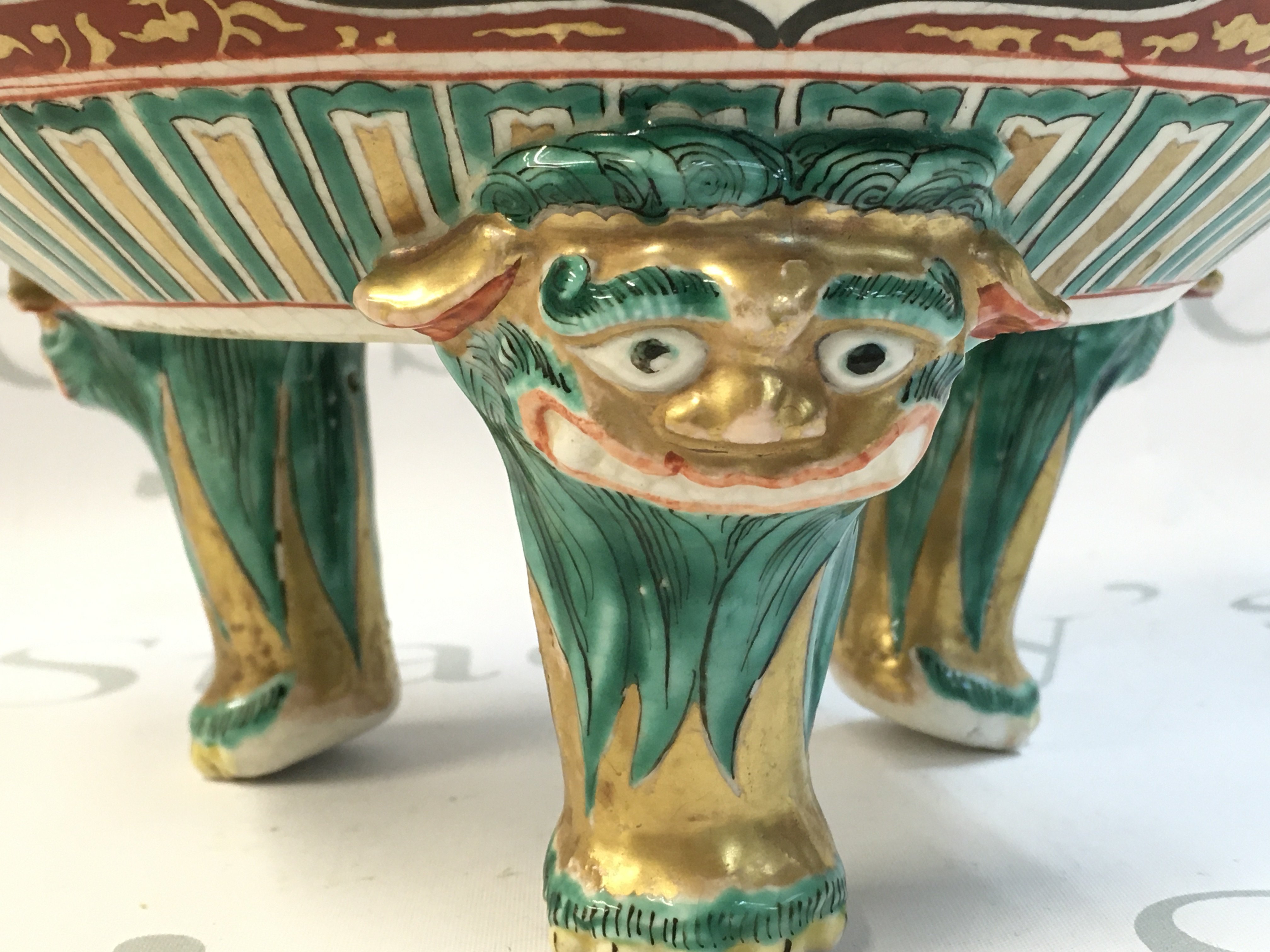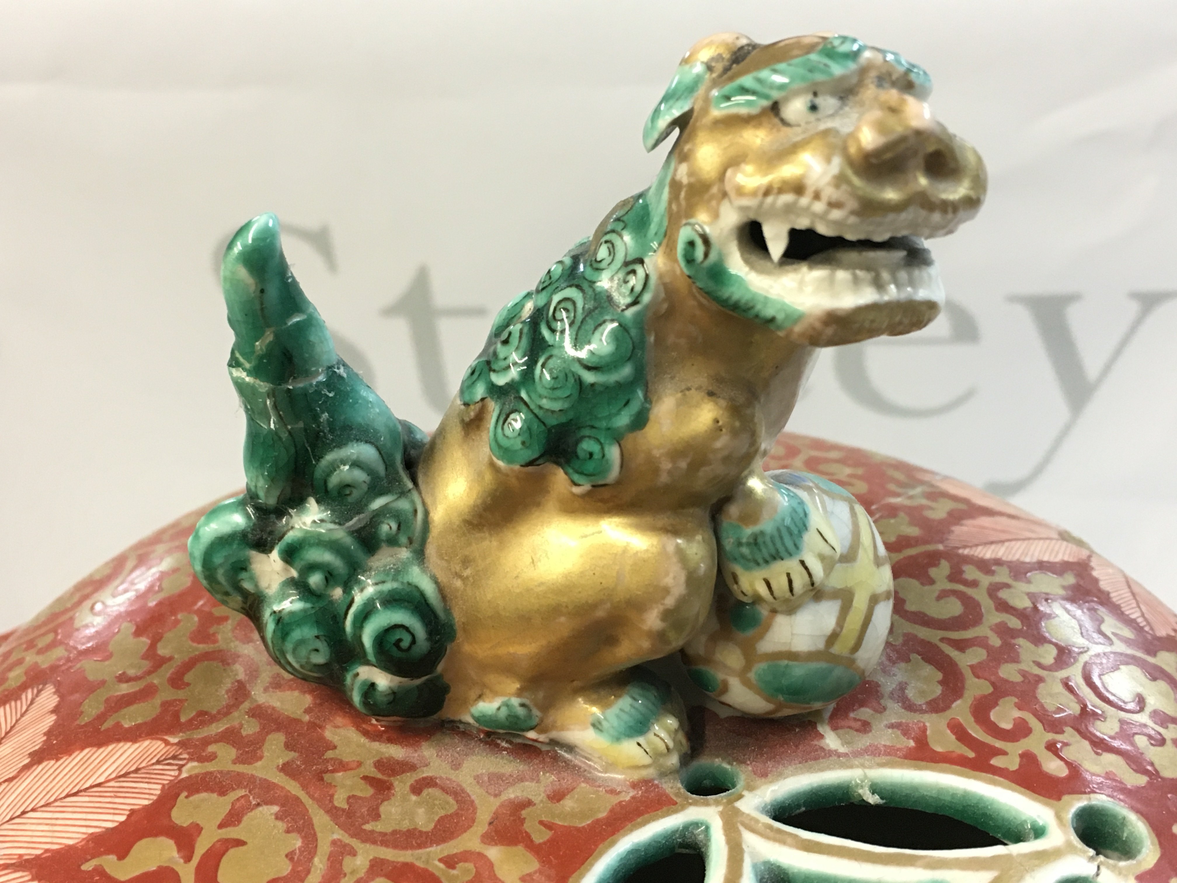 A Chinese vase decorated in gilt and with panels of figures and a peacock , twin handled design, topped with a Fu dog figure, fu dog feet. 38cm tall 40cm wide approximately. Some damage and restoration