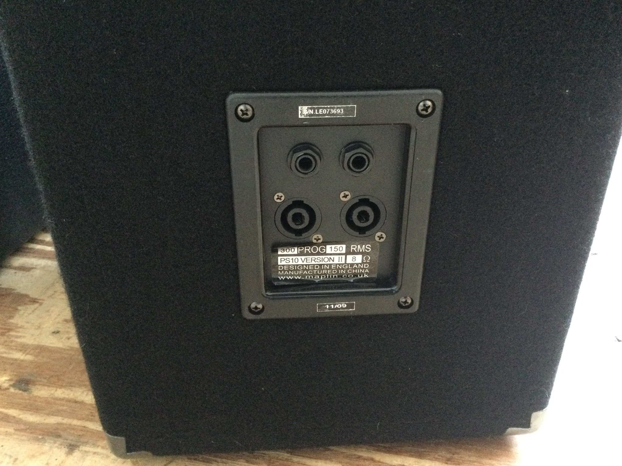 A Pro Sound N73HH 4 channel amplifier head and a pair of Pro Sound speakers plus a large SW15 Wharfedale subwoofer (4). Comes with some leads. Click Here to Register to bid